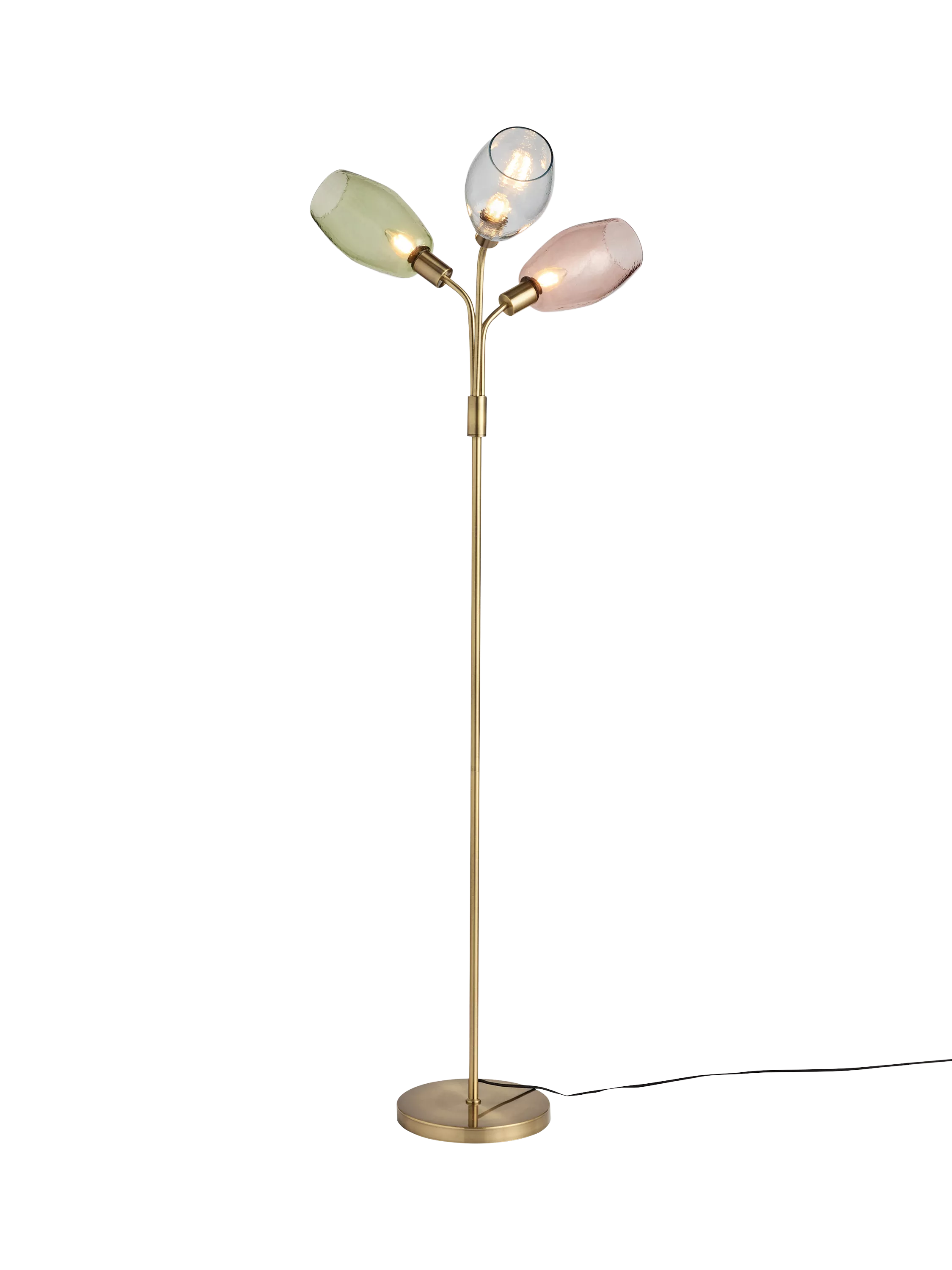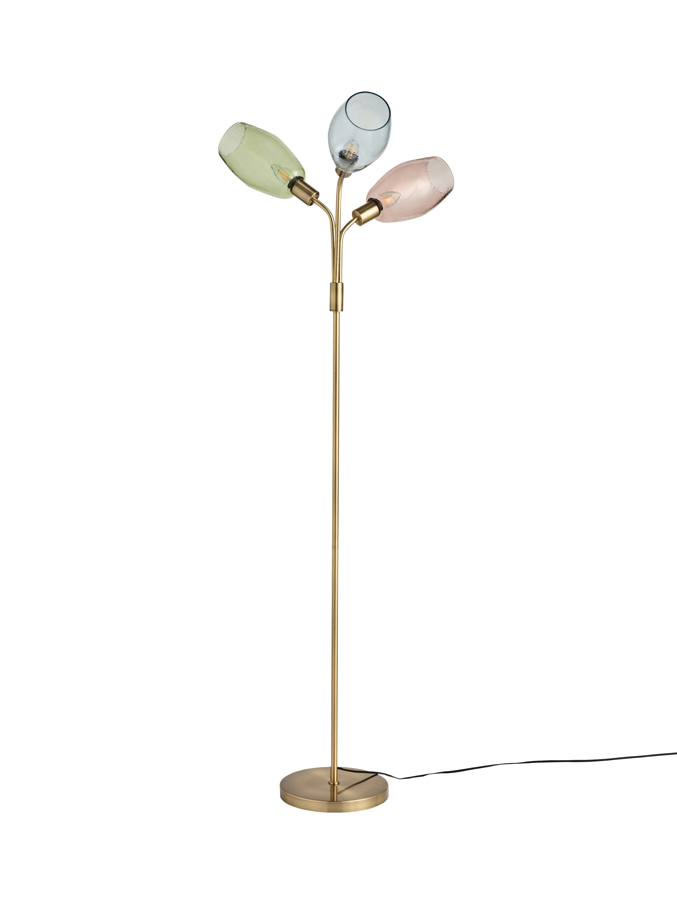 The MADE Isla Floor Lamp makes a colourful and sophisticated statement in any living space. This elegant lamp features a slender brass column and a round base, topped by three individual arms that hold organically shaped, tinted glass shades in soft multicolour shades.