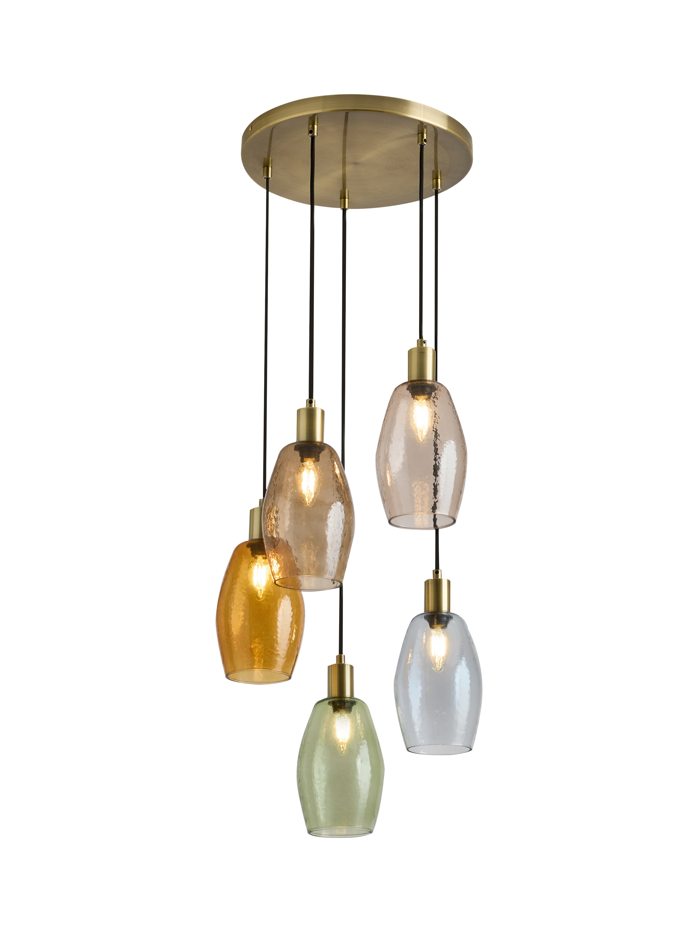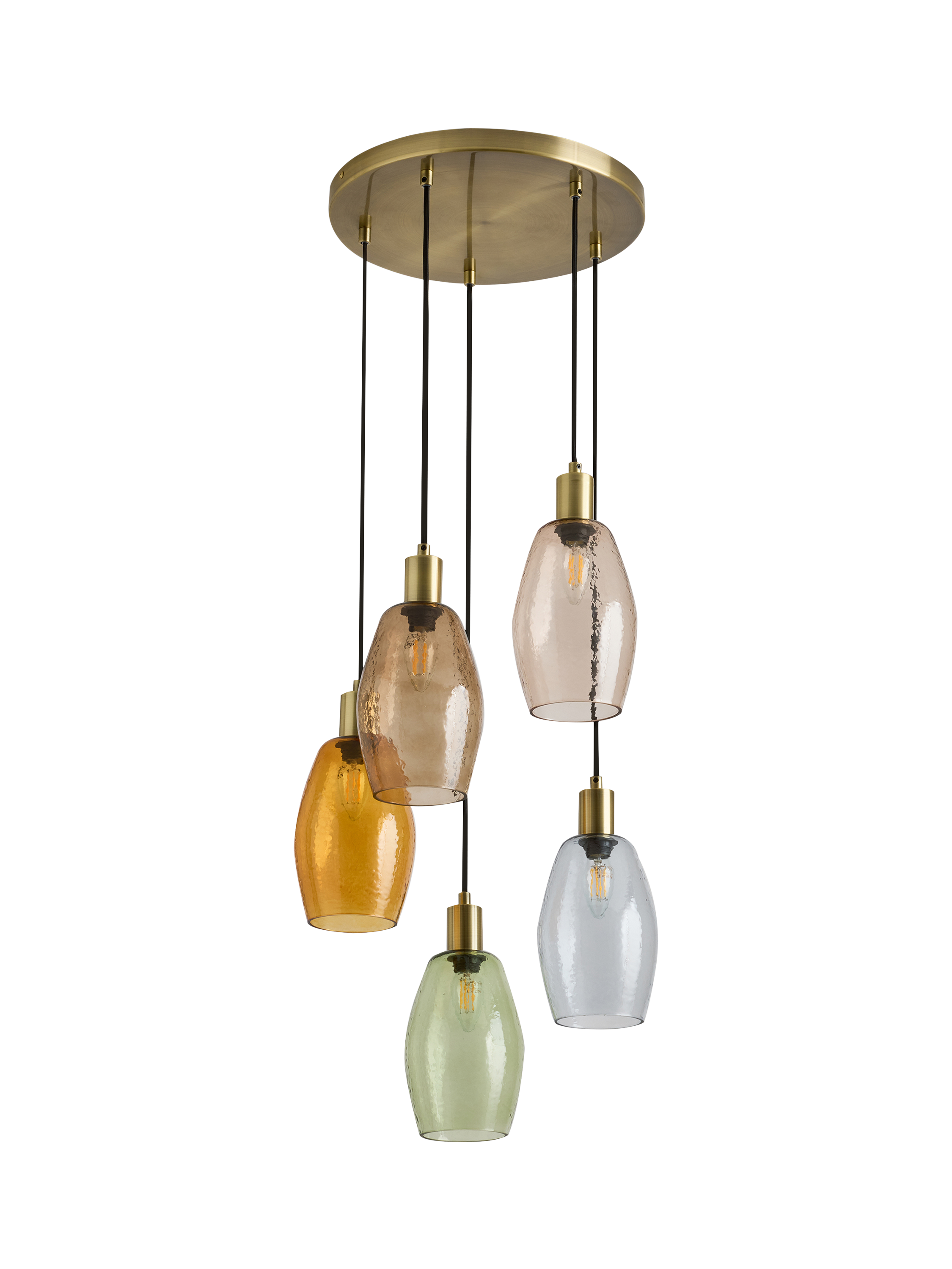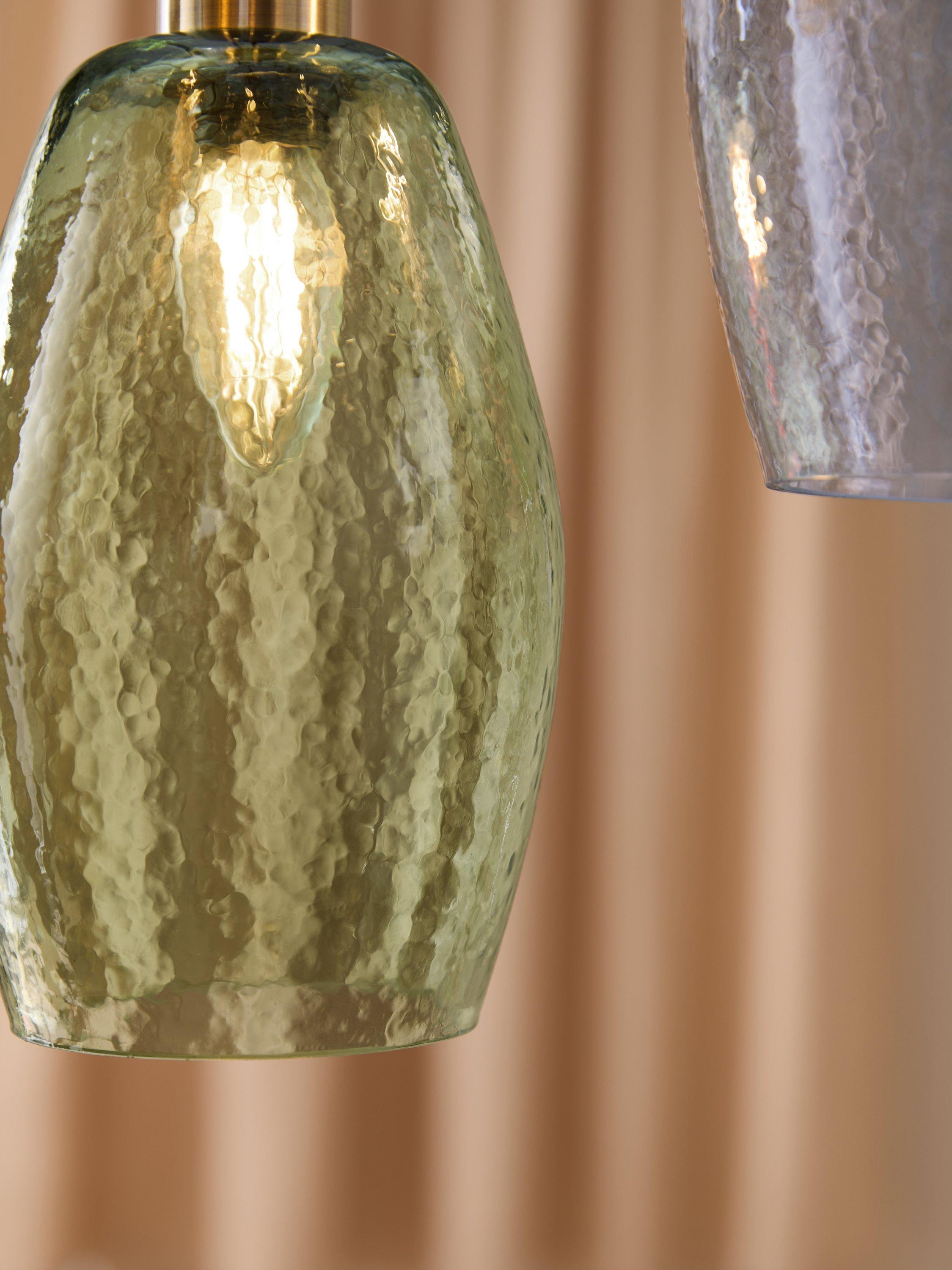 Create an immediate focal point in your home with the stunning MADE Isla 5 Cluster Light. This statement pendant features a round brass ceiling plate from which five individual, adjustable drops suspend at varying heights. Each drop holds a unique, organically shaped glass shade in a beautiful selection of tinted colours.