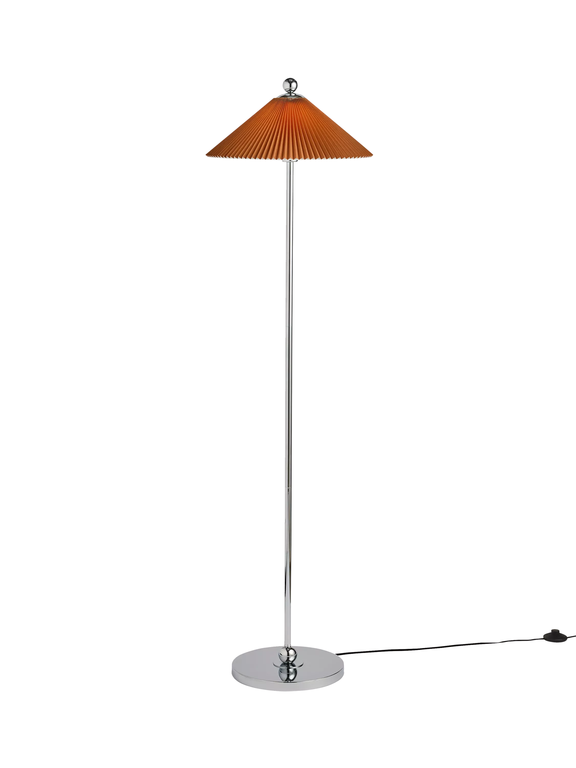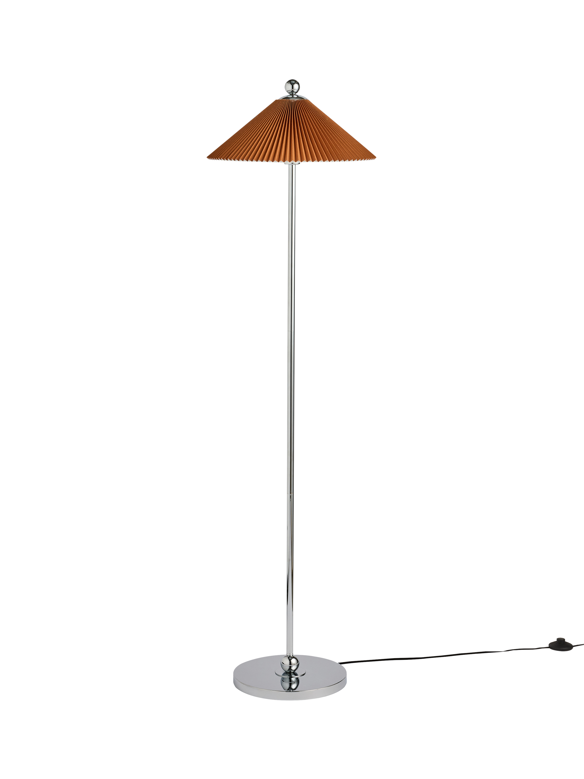 The MADE Jolene Floor Lamp is a striking fixture that brings a chic, mid-century modern aesthetic to your space. The lamp features a slender, minimalist column and a round base in a polished silver finish. The design is topped with a unique, shallow cone shade in a rich rust brown hue, crafted with a fine pleated texture. This floor lamp provides focused, directed light while making a strong geometric and colourful statement.