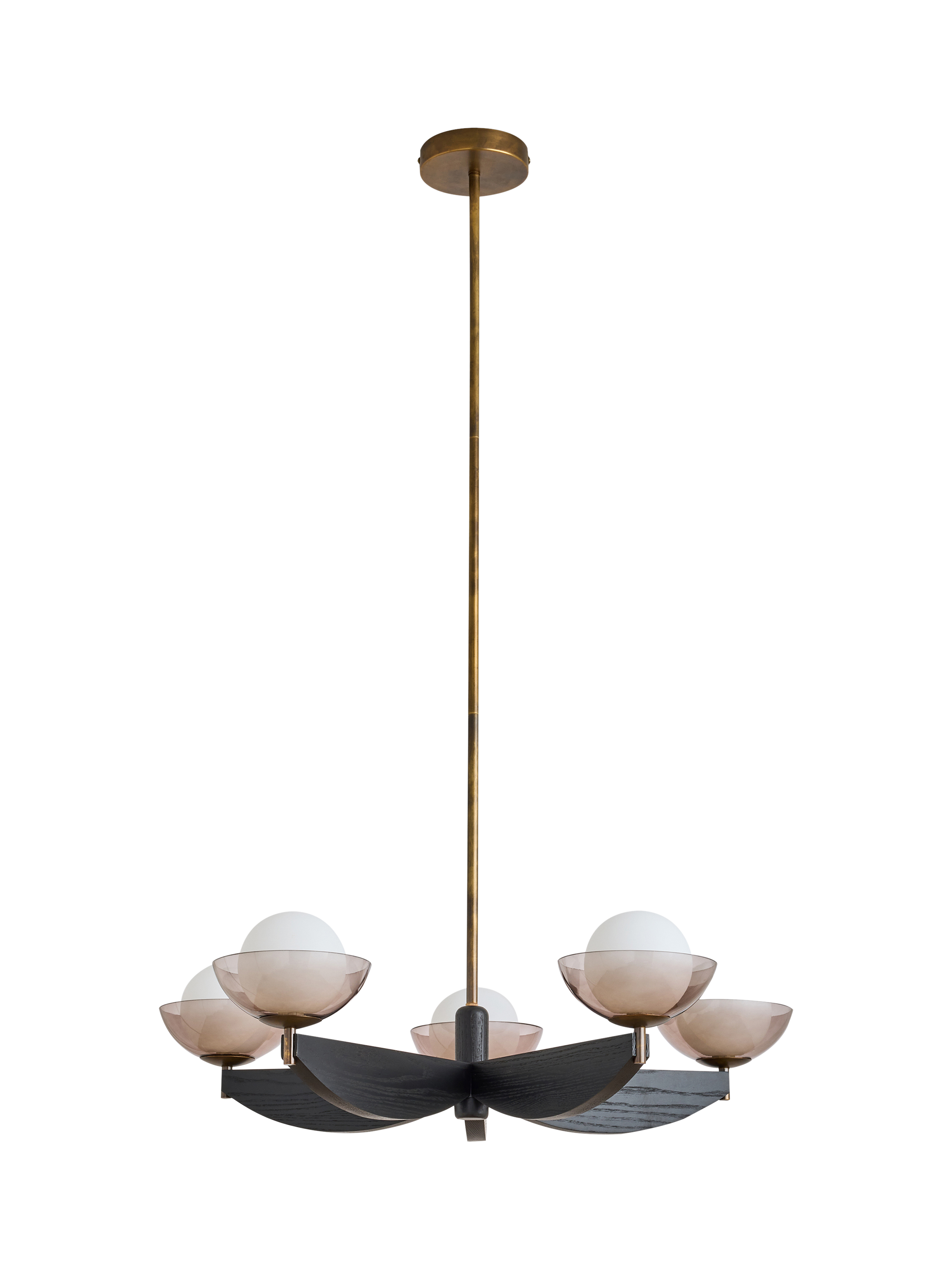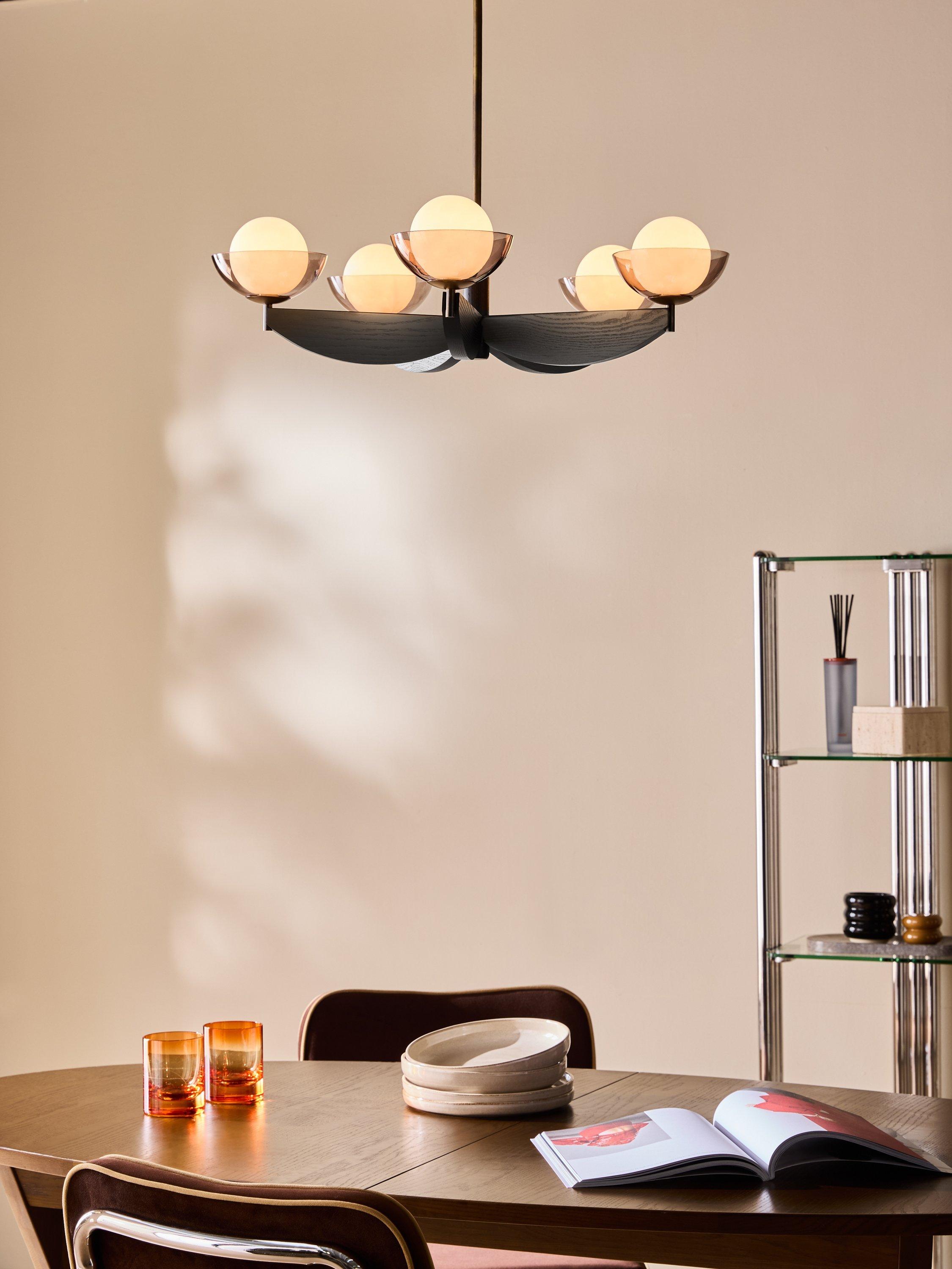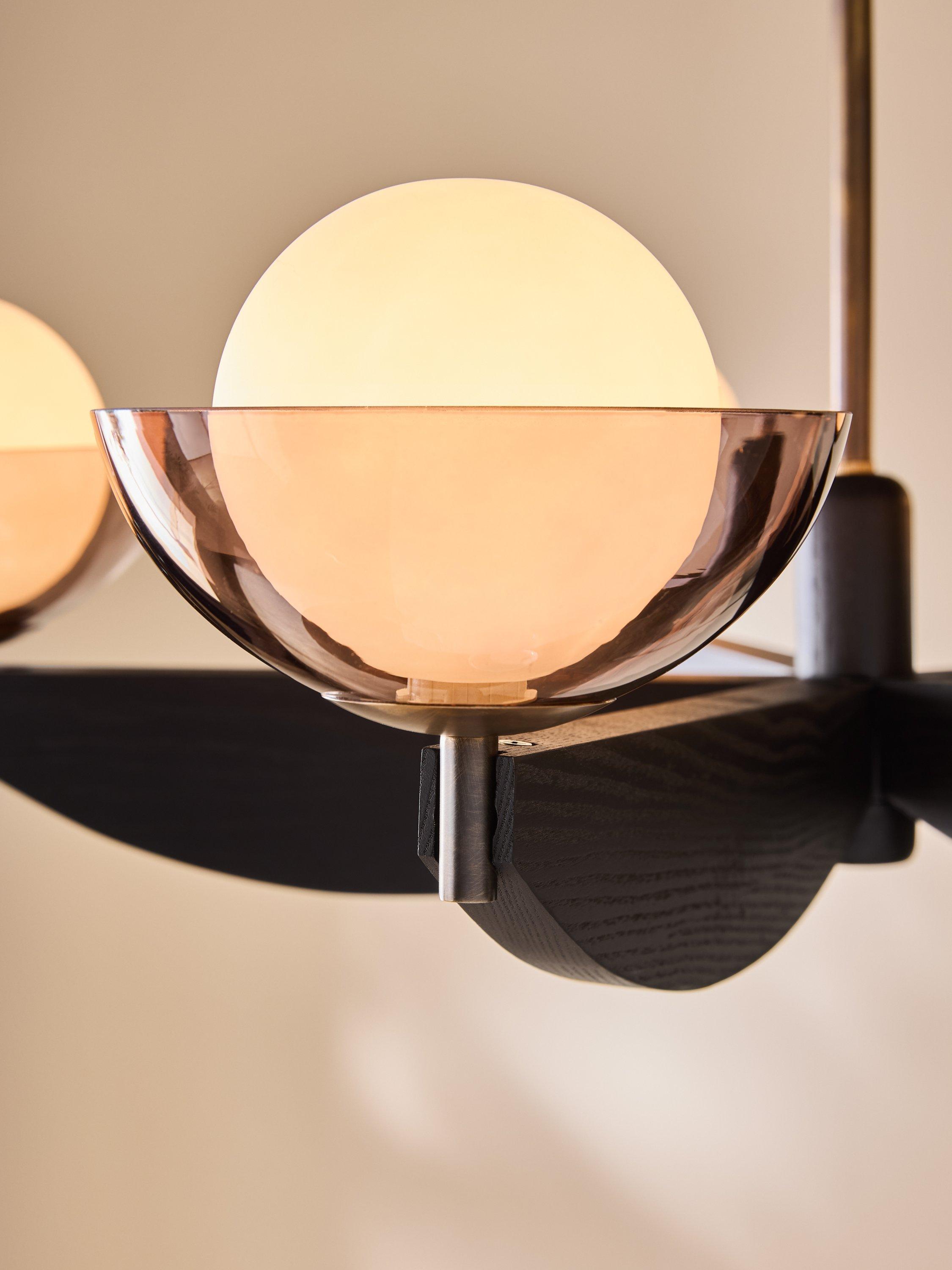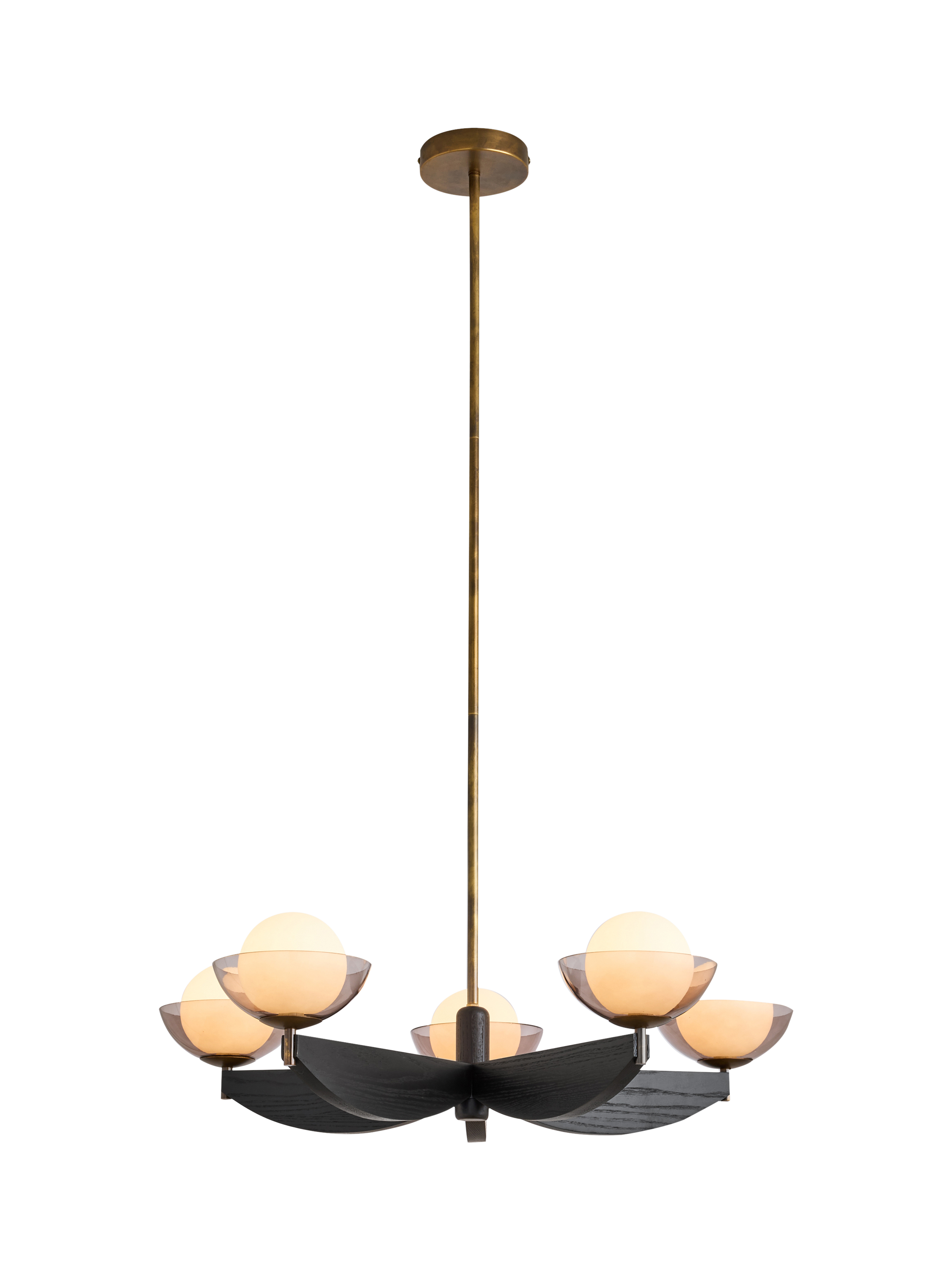 Sometimes it only takes one thing to steal the scene, and Layla is it. This five-lamp ceiling light has post-modern vibes all day, and all night long. Made with wooden, walnut-tone arms and light diffusing glass orbs.