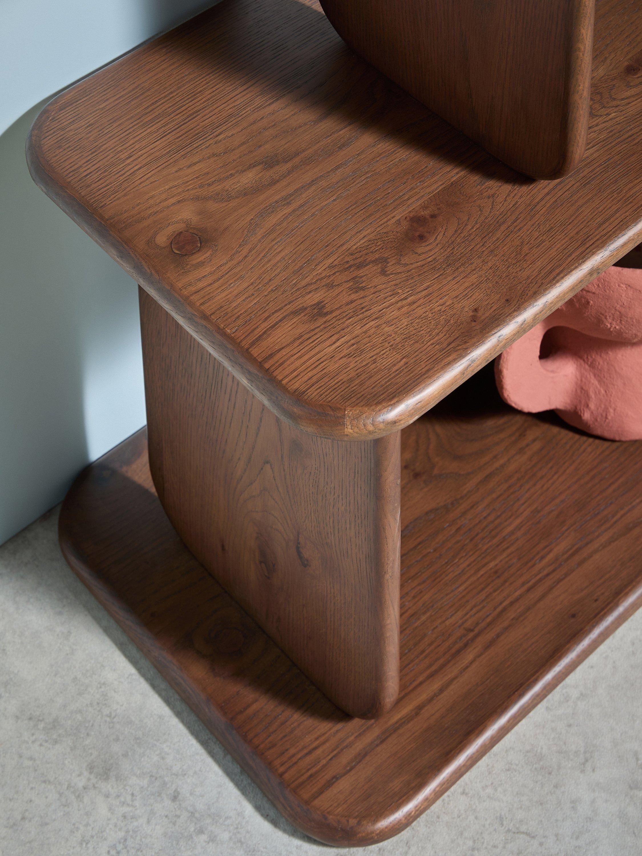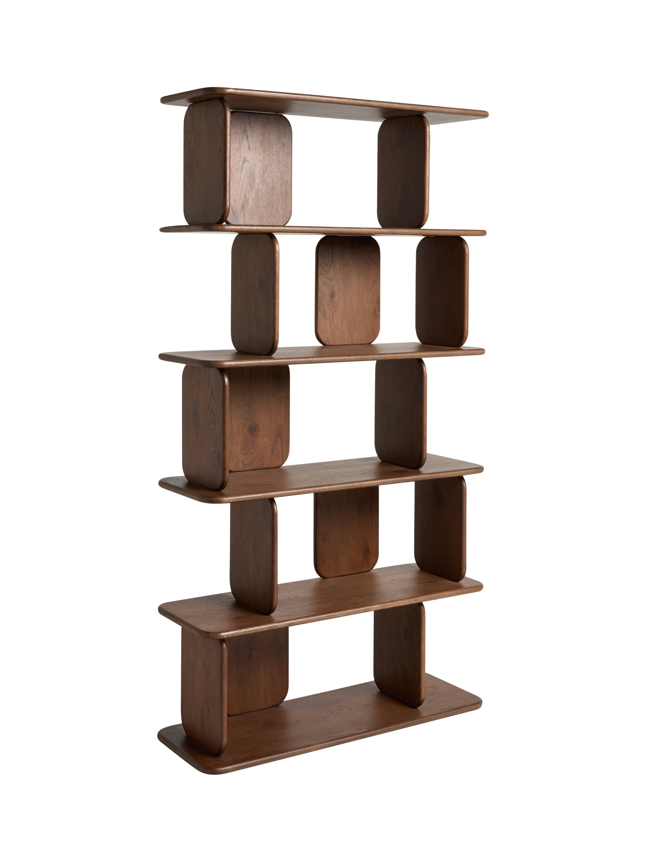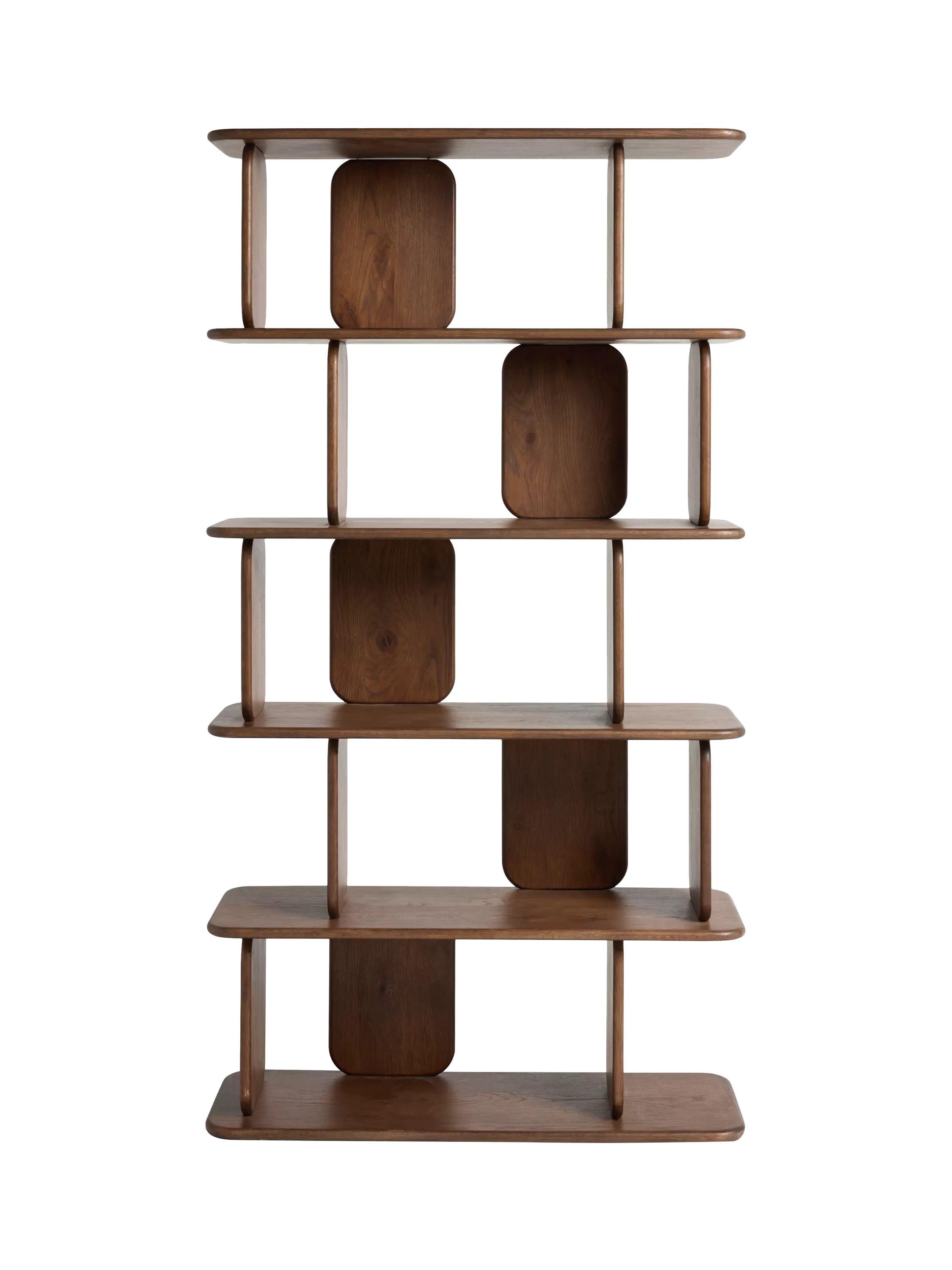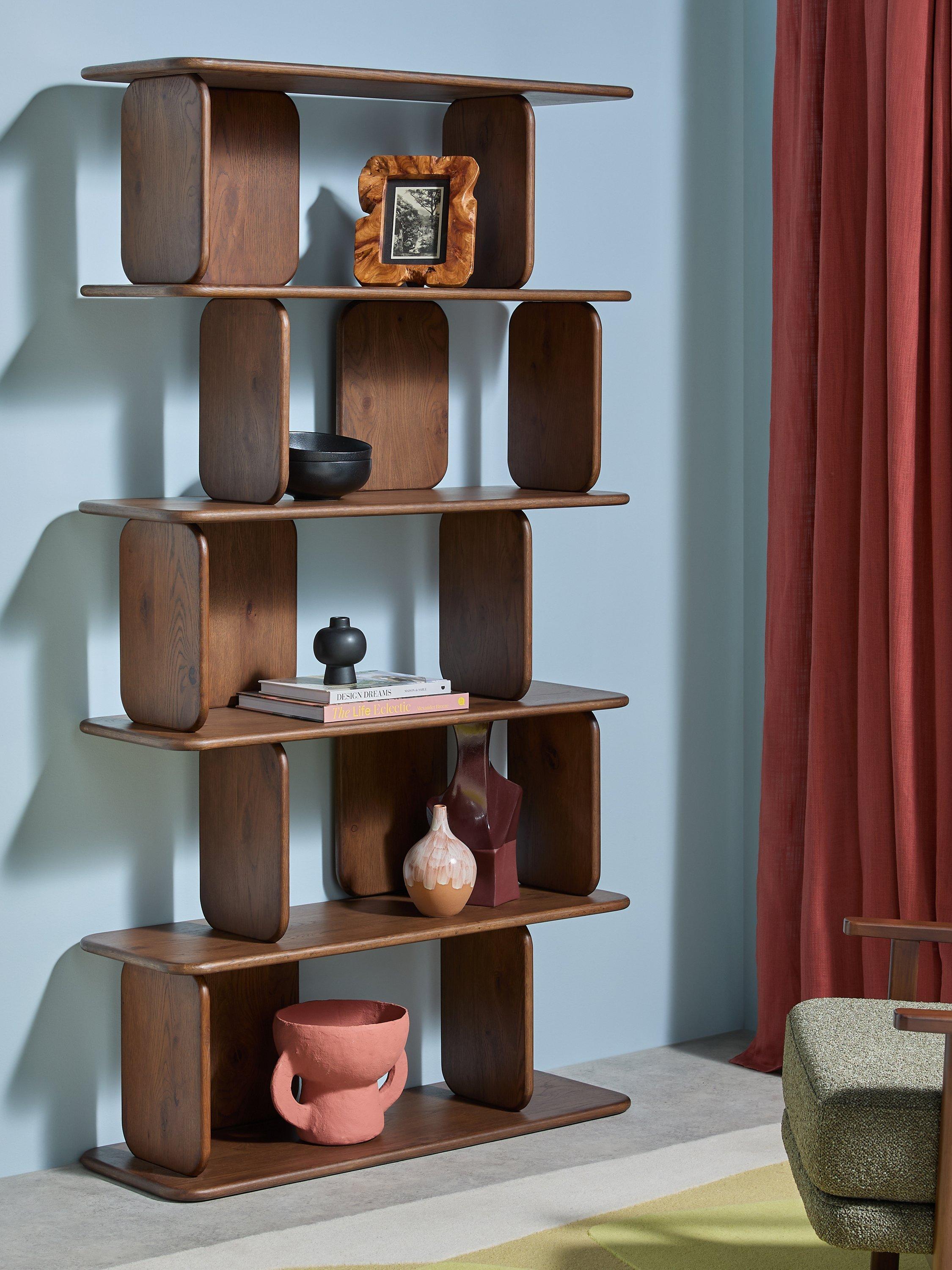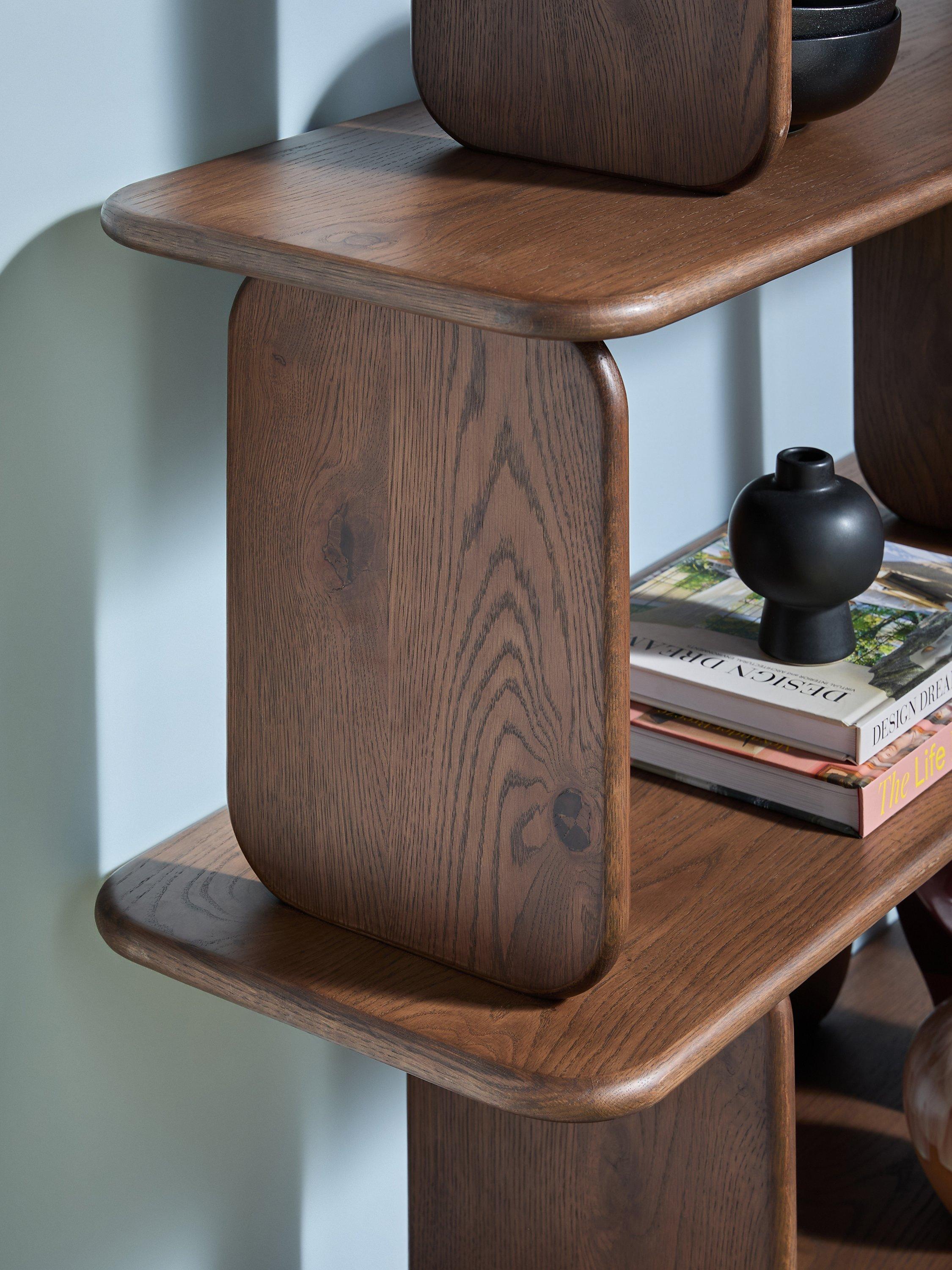 Nyla is a dream furniture find for the organised soul. Designed in dark stained oak and oak veneers, this organic shaped tall shelving unit will add organisational kudos to your space.