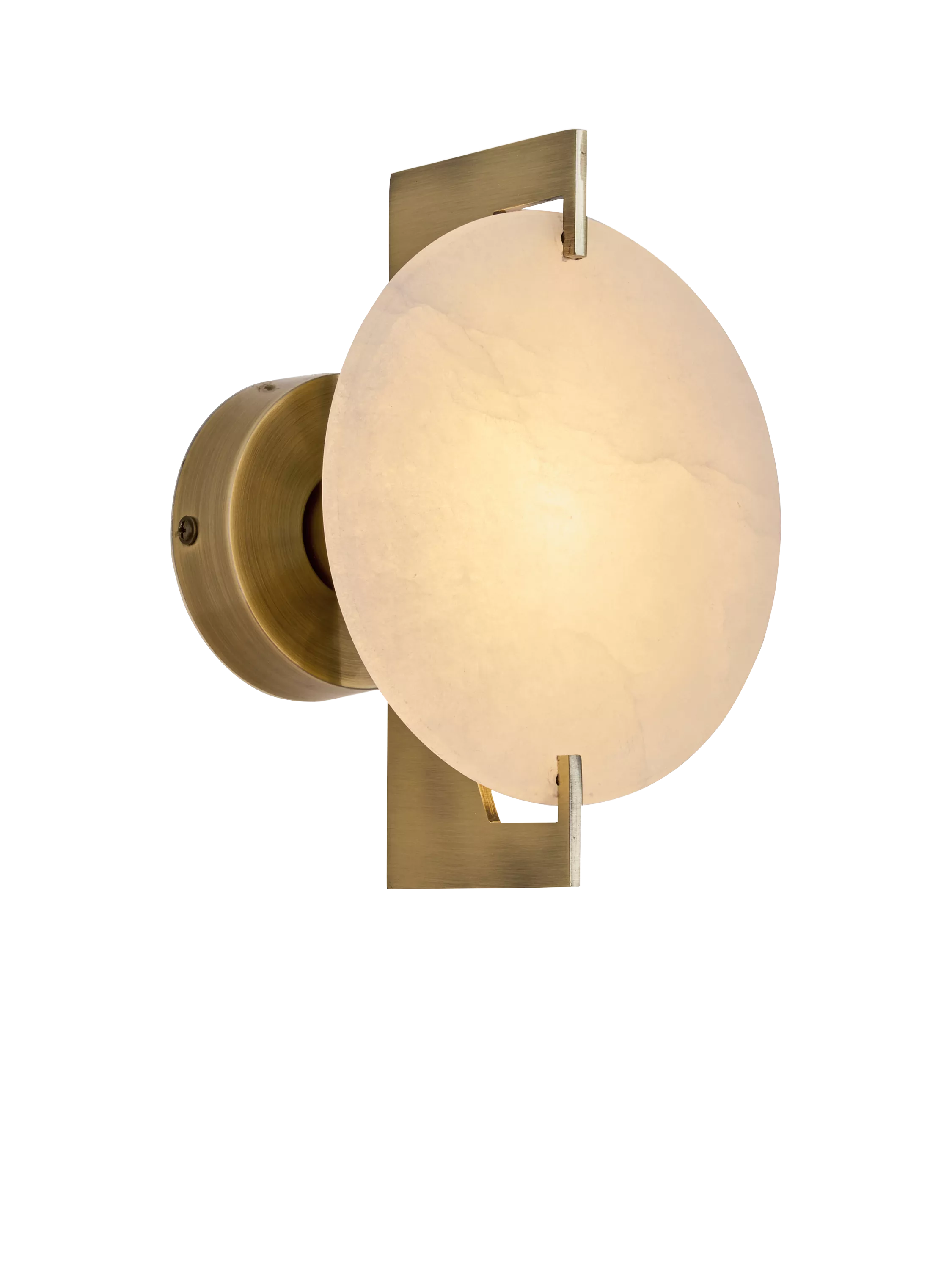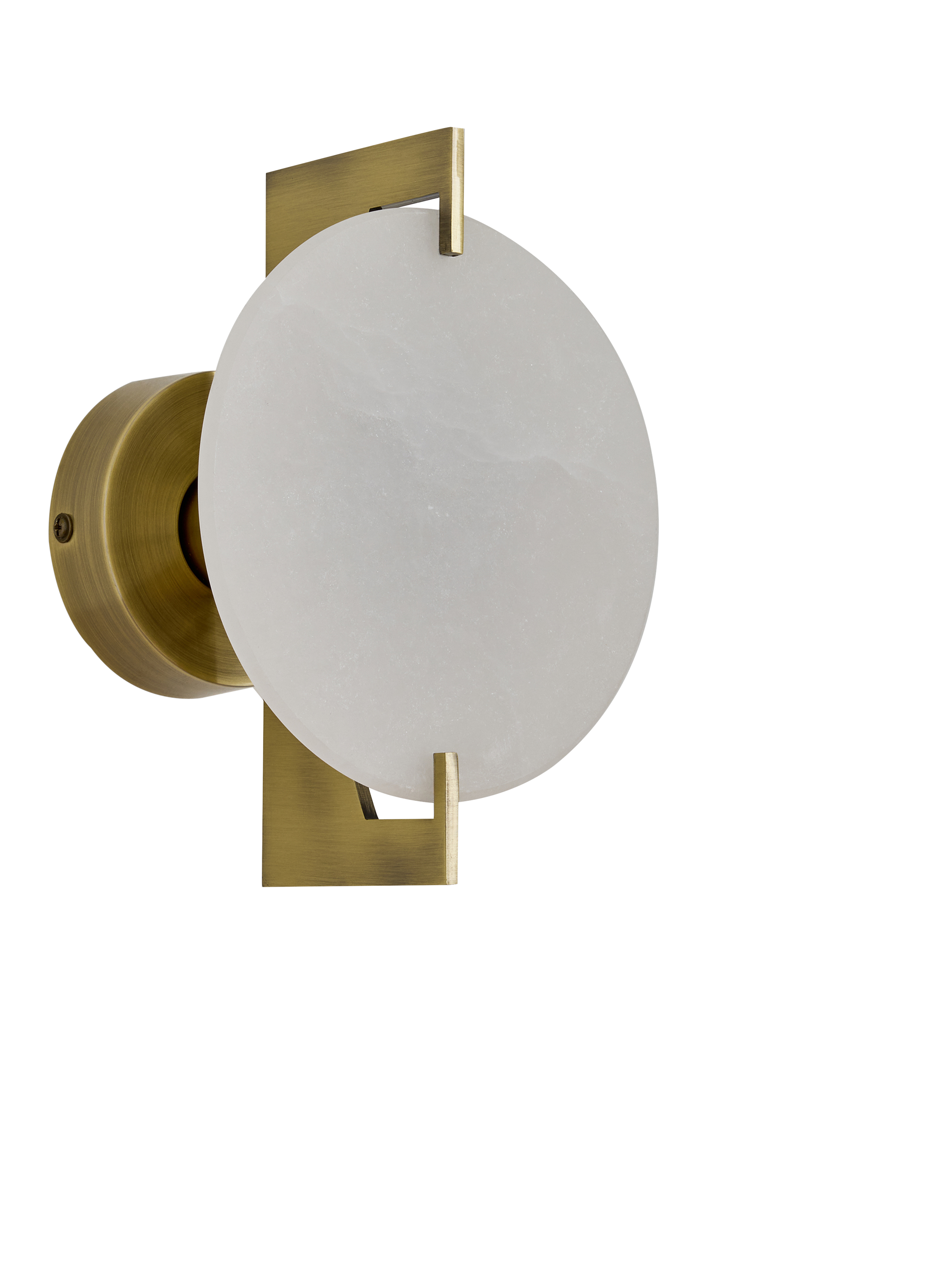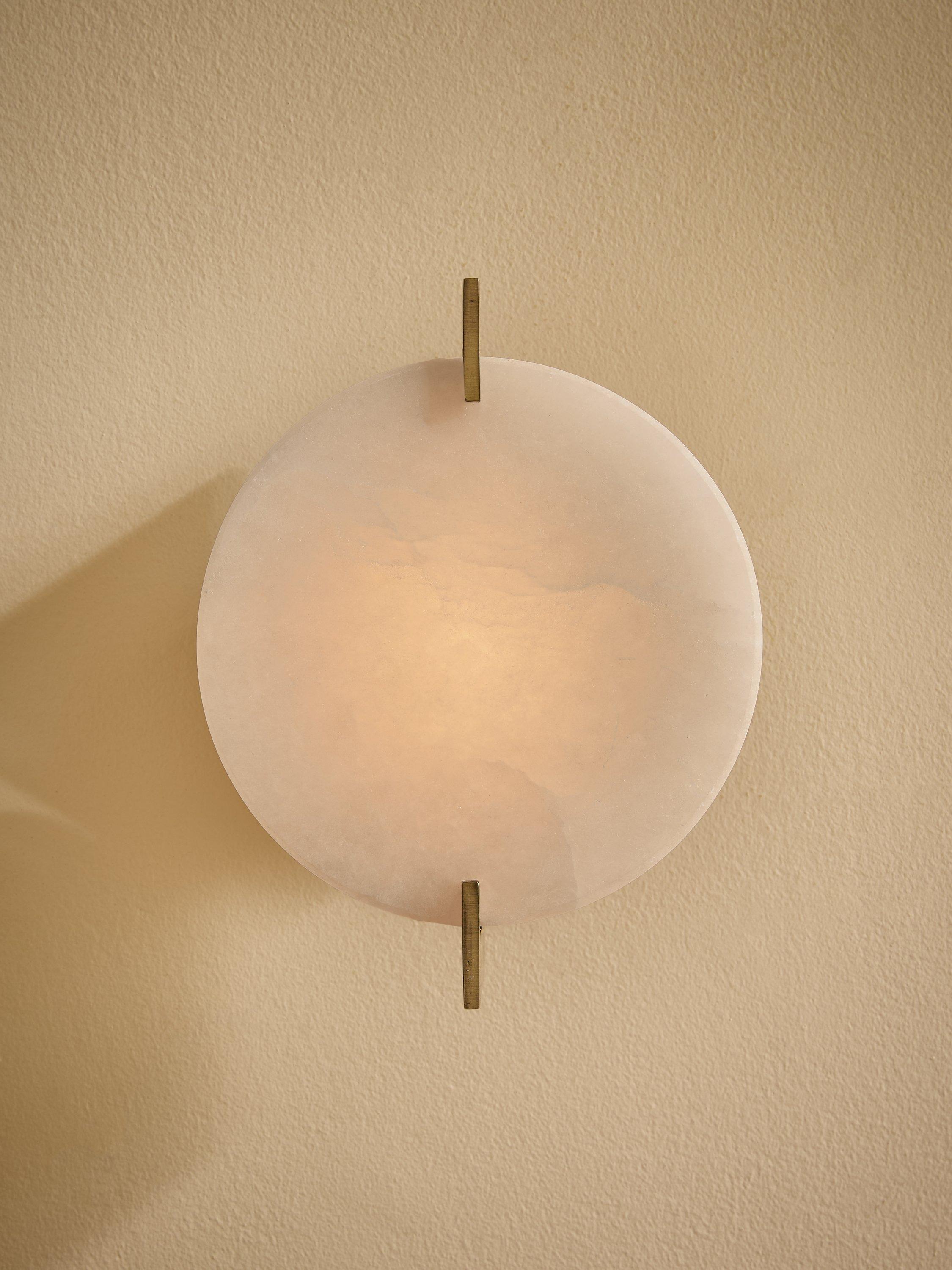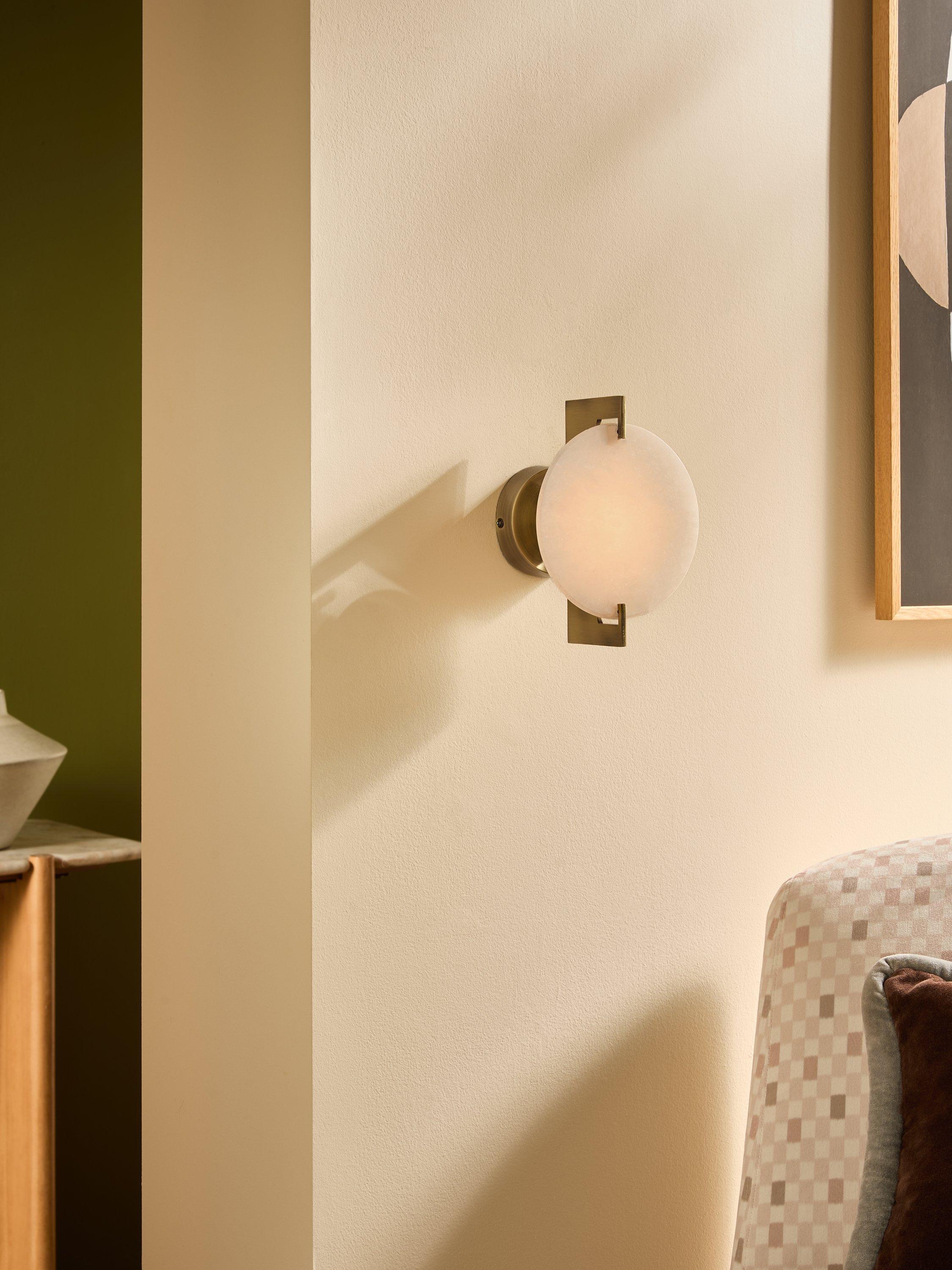 The MADE Quila Wall Light is a minimalist and artistic fixture that adds soft, ambient light to your wall. It features a striking circular diffuser with an organic, uneven surface texture, which is elegantly mounted to a round backplate using a modern brass metal frame. The combination of the warm brass finish and the gently diffused light creates a subtle, sculptural statement perfect for contemporary living spaces, hallways or beside a bed.