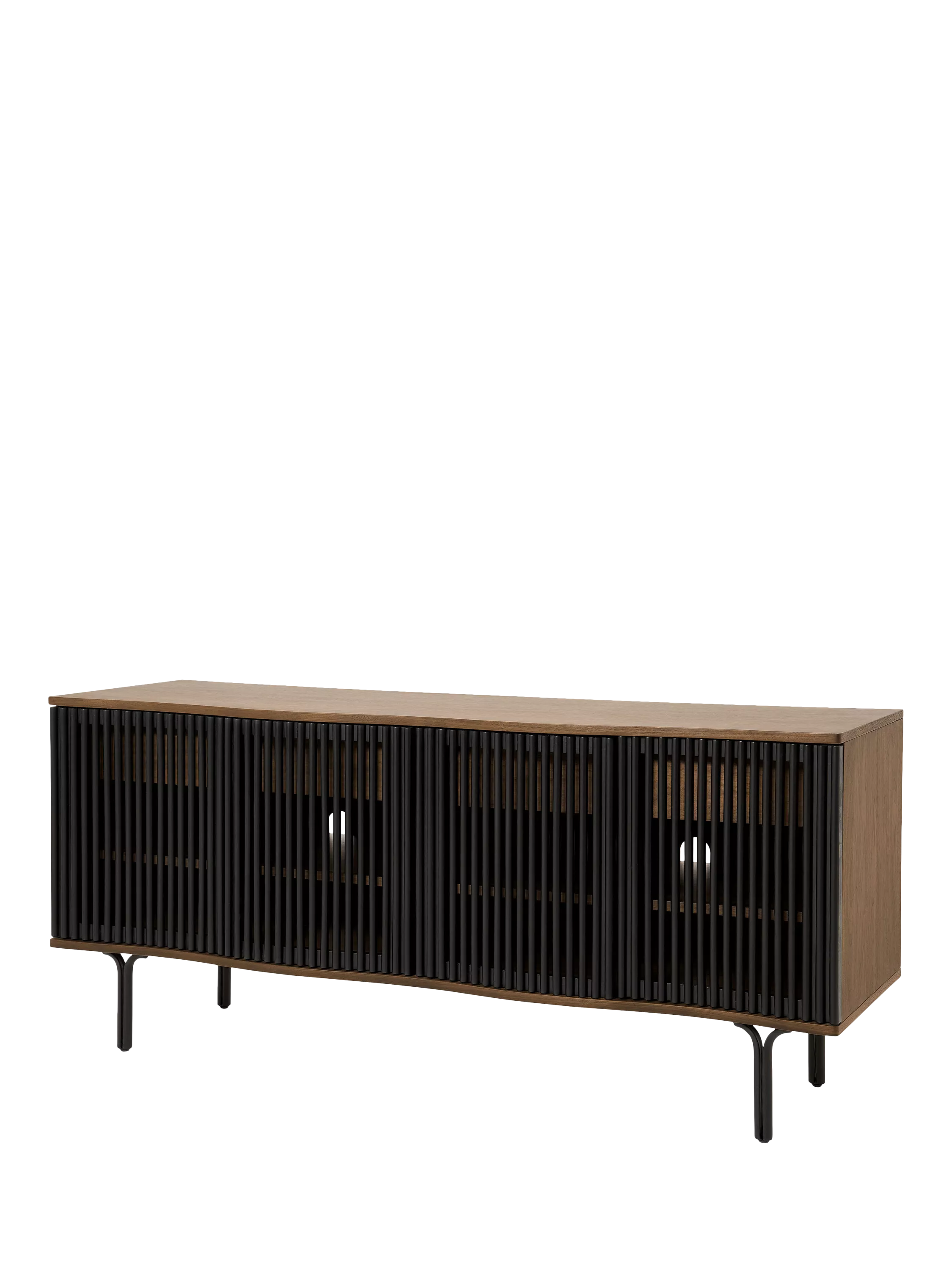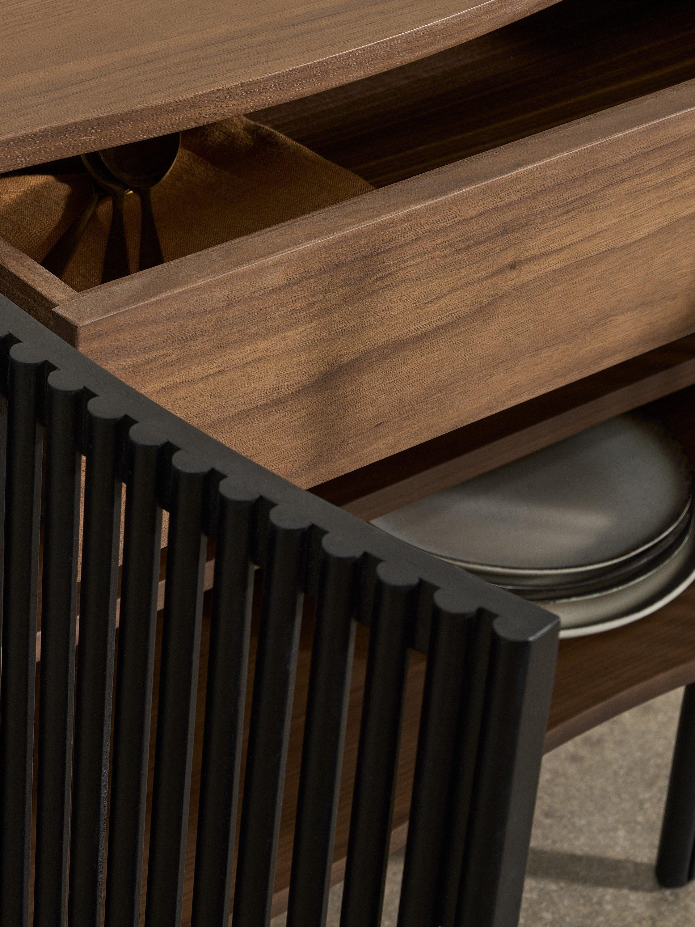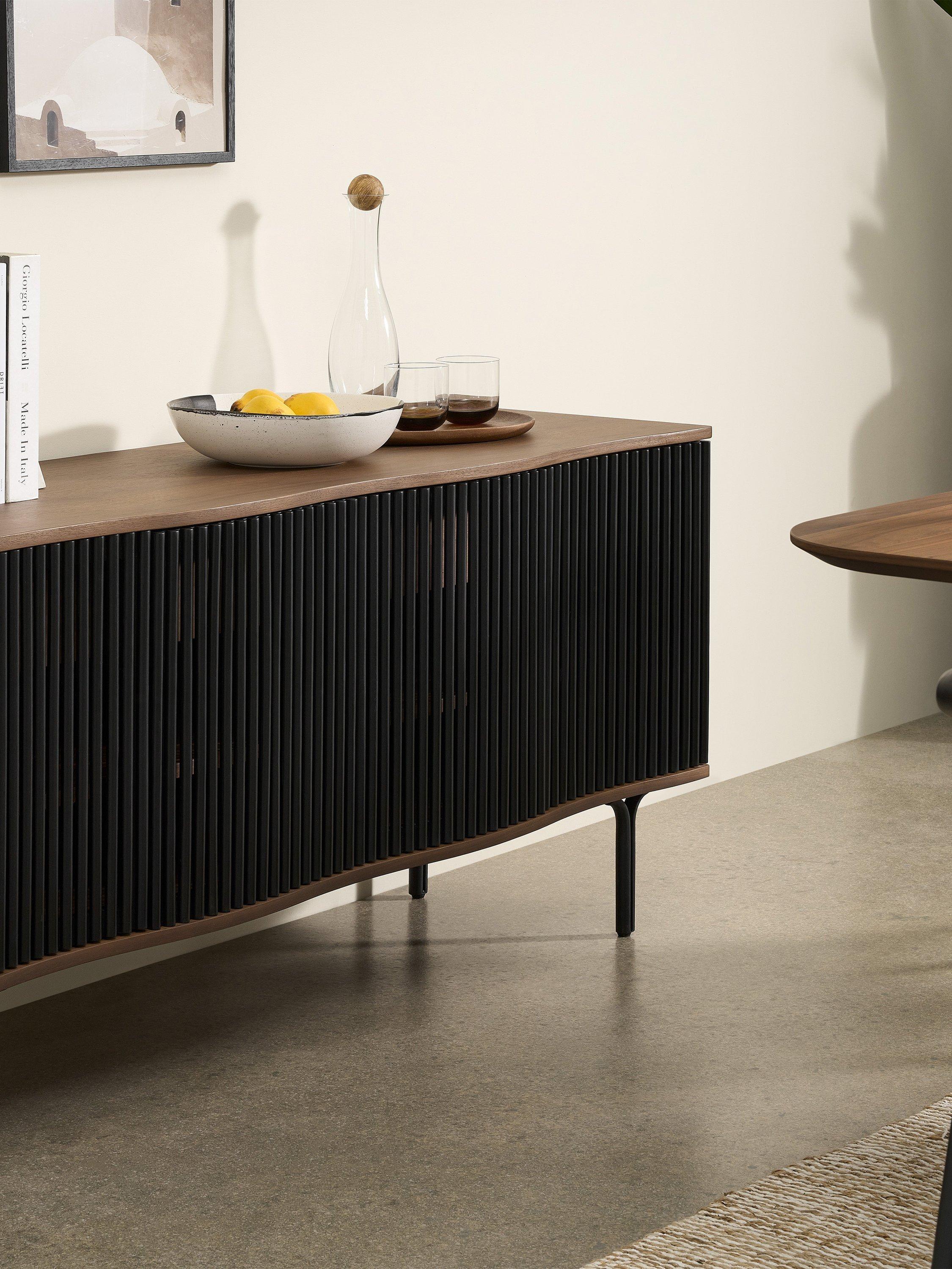 If you're looking for statement furniture, meet Zaragoza. This sideboard is designed in an organic walnut finish with slim black legs and a distinctive, slatted front. The front of the frame also has a subtle wavy edge that adds contemporary interest, so this piece will elevate your living space.