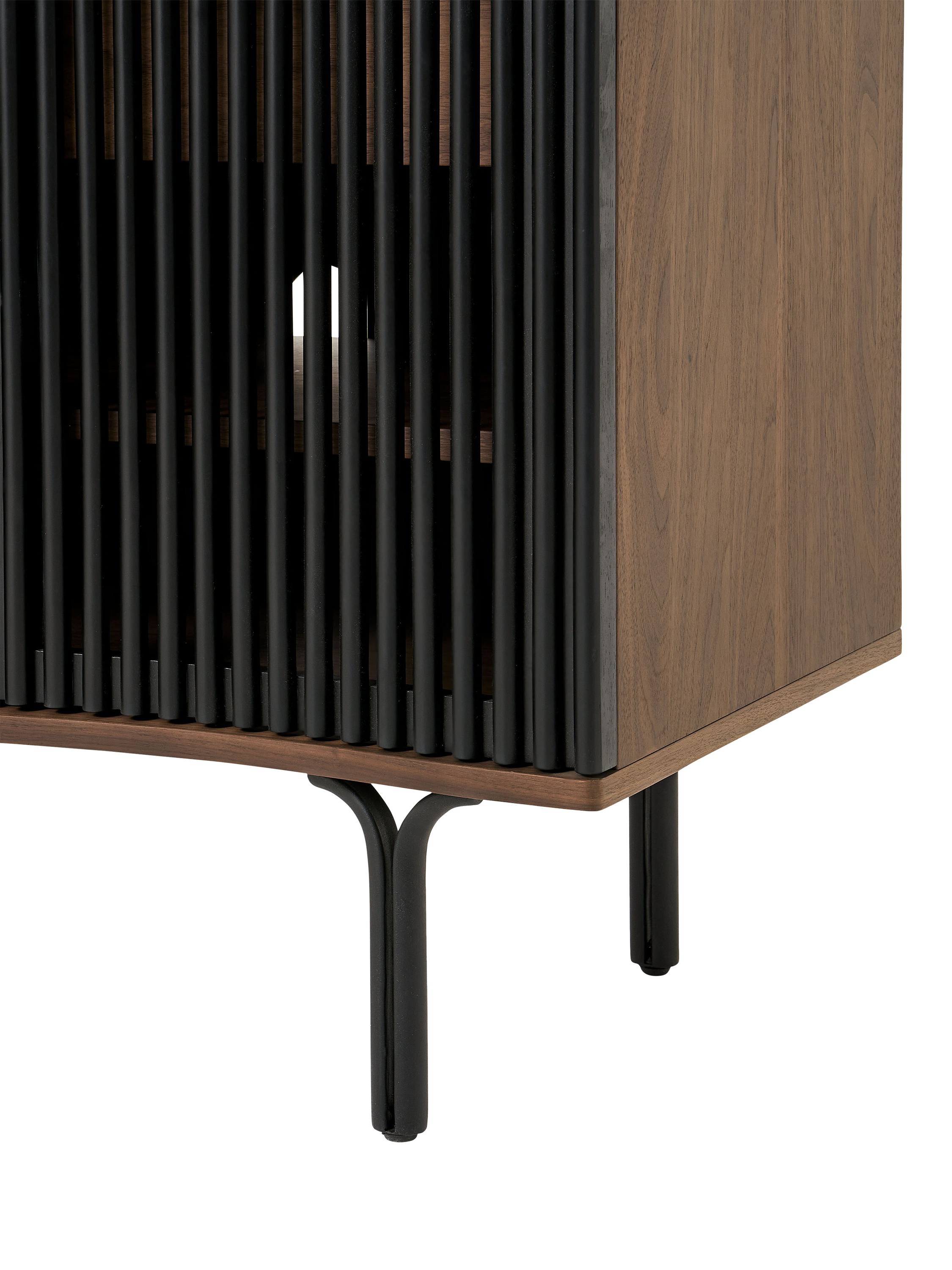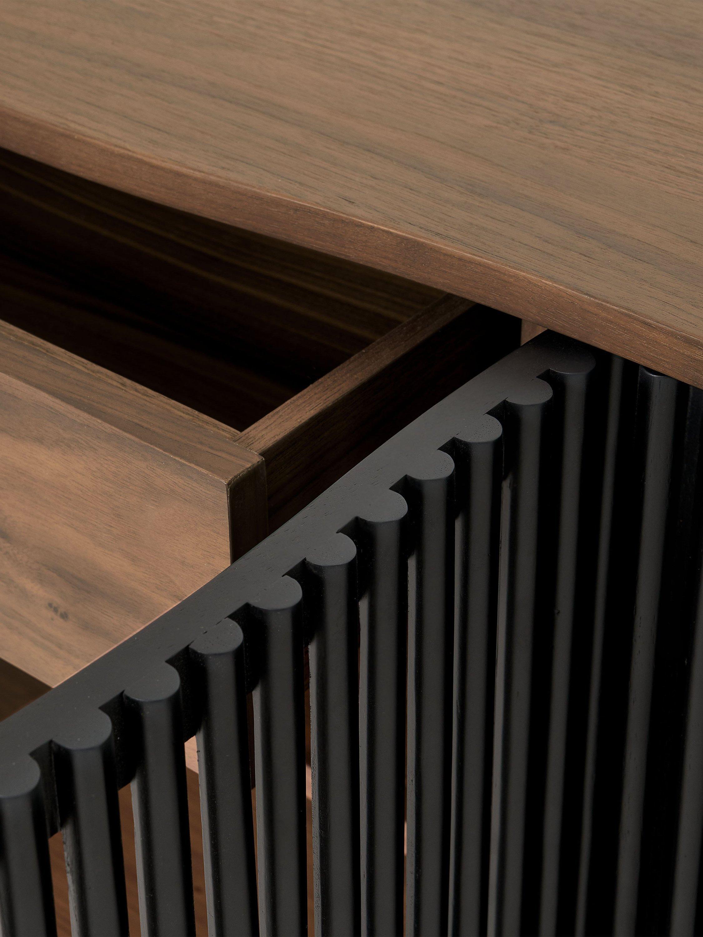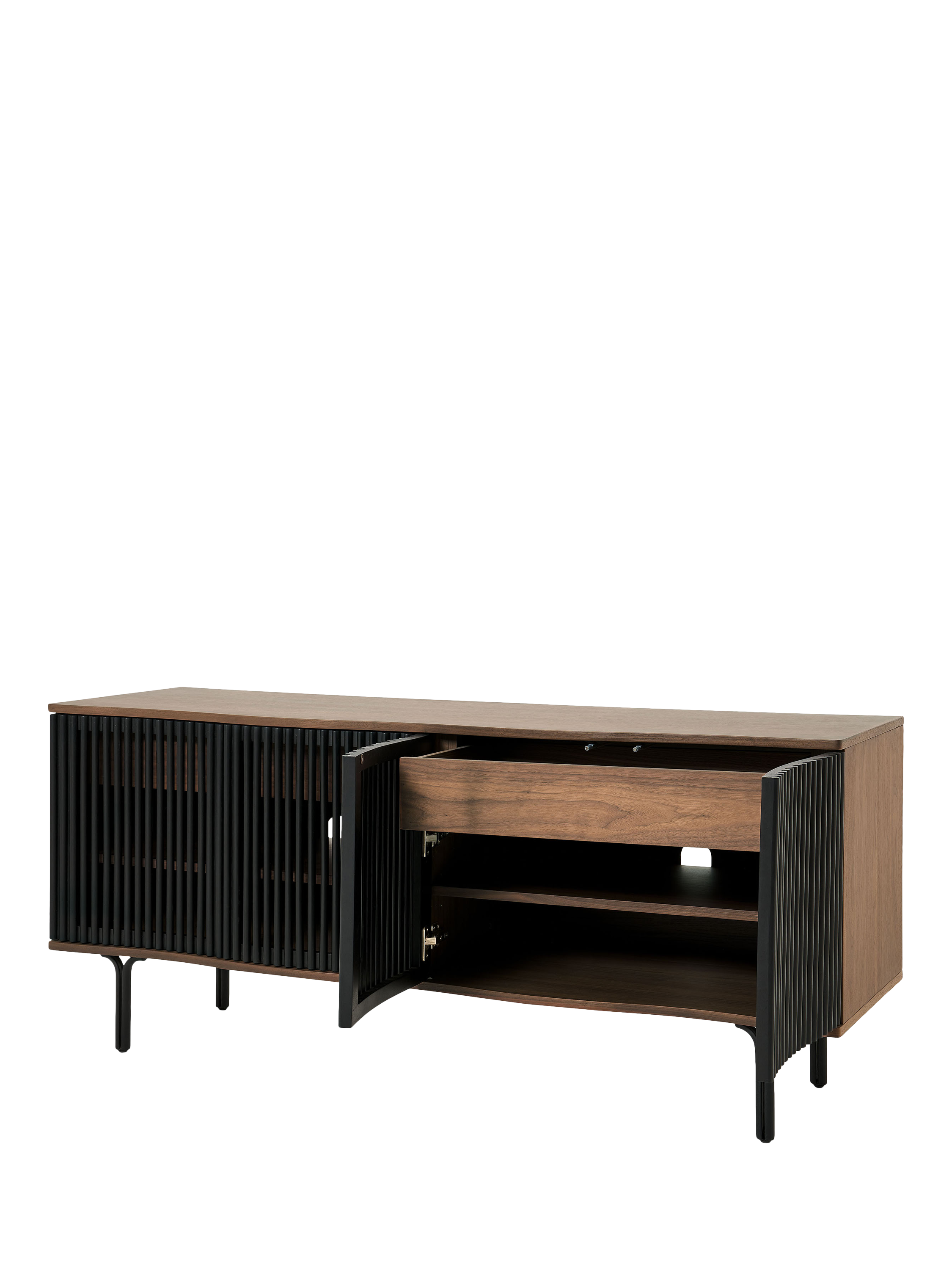 If you're looking for statement furniture, meet Zaragoza. This sideboard is designed in an organic walnut finish with slim black legs and a distinctive, slatted front. The front of the frame also has a subtle wavy edge that adds contemporary interest, so this piece will elevate your living space.