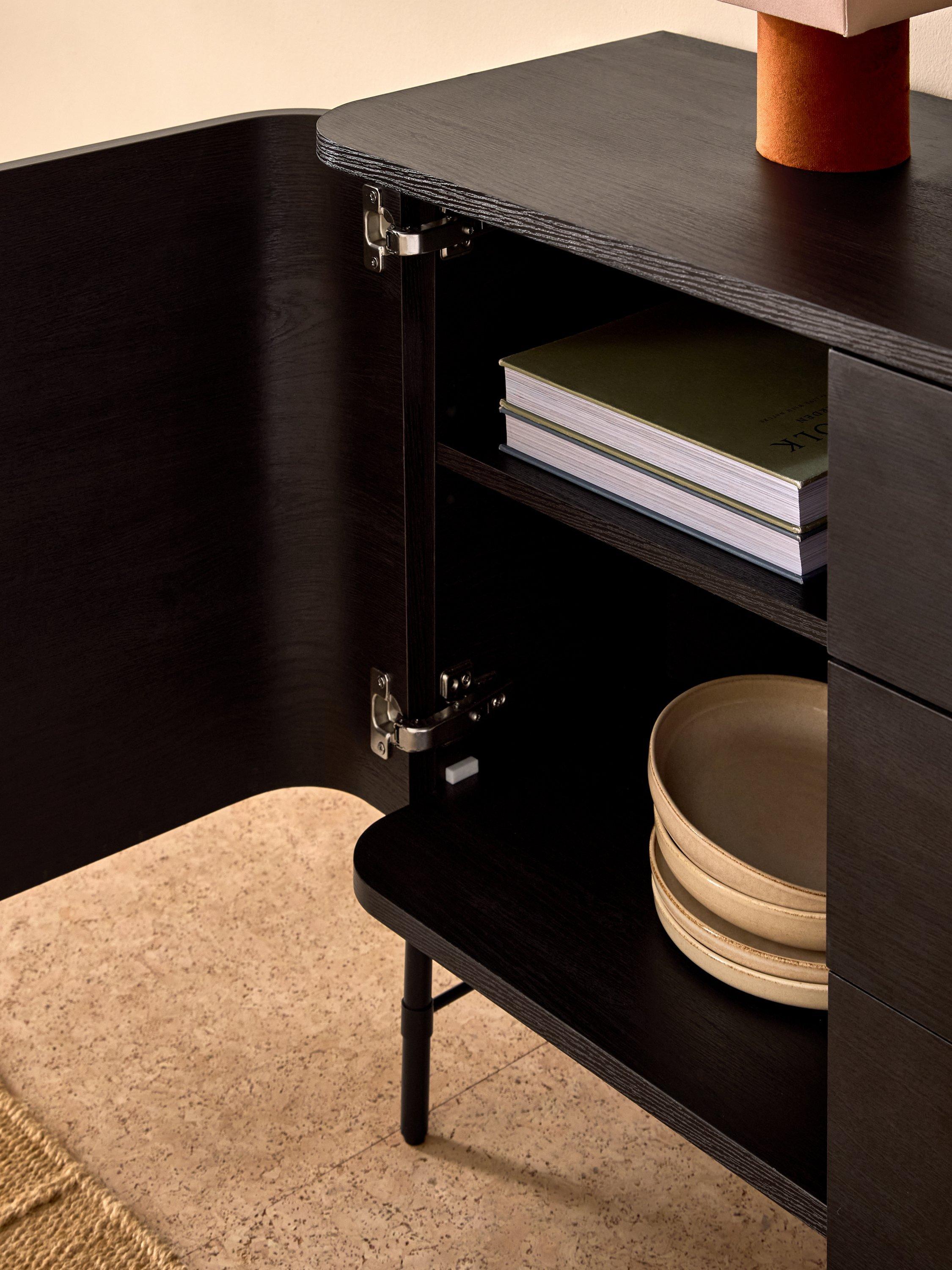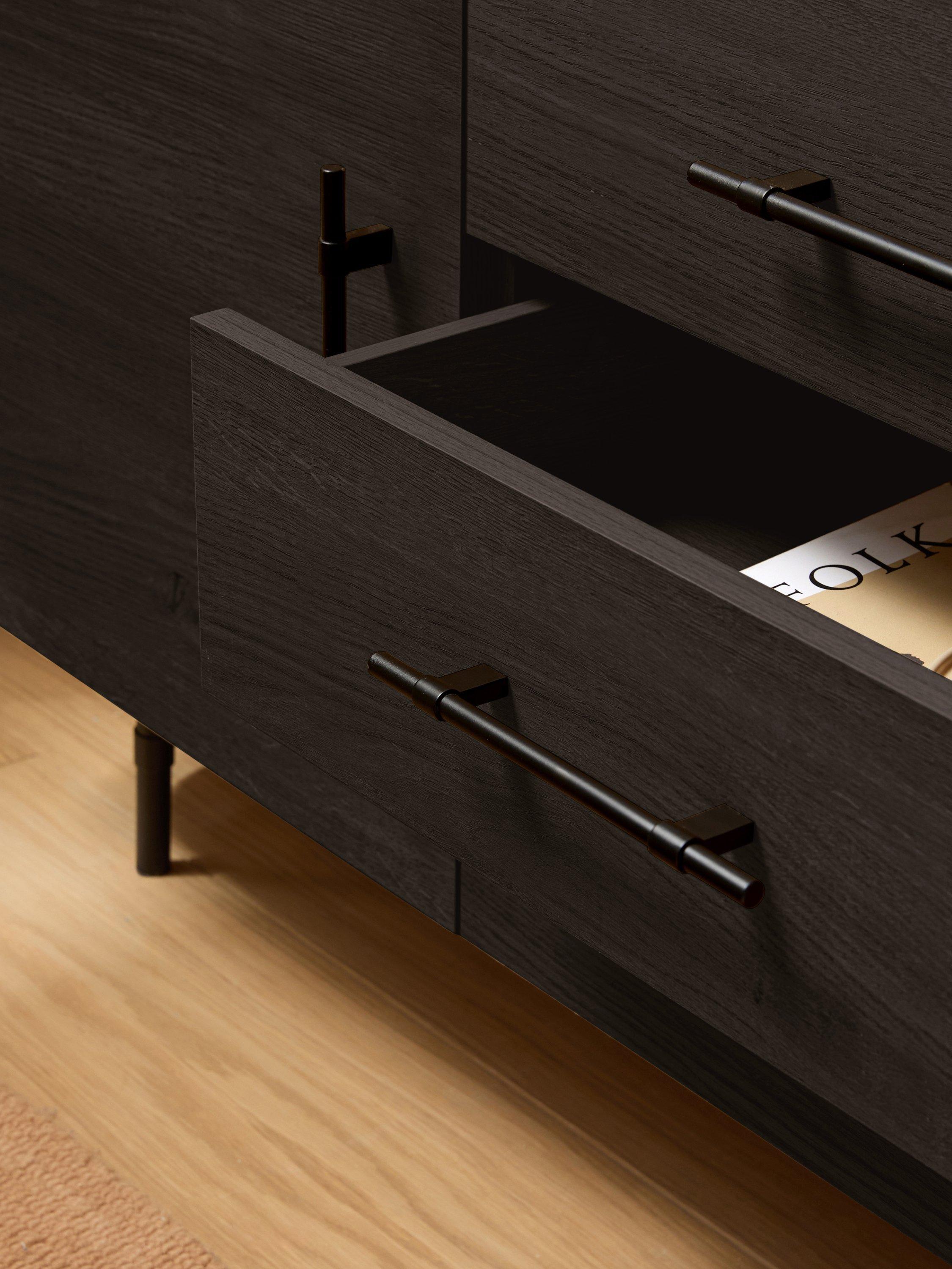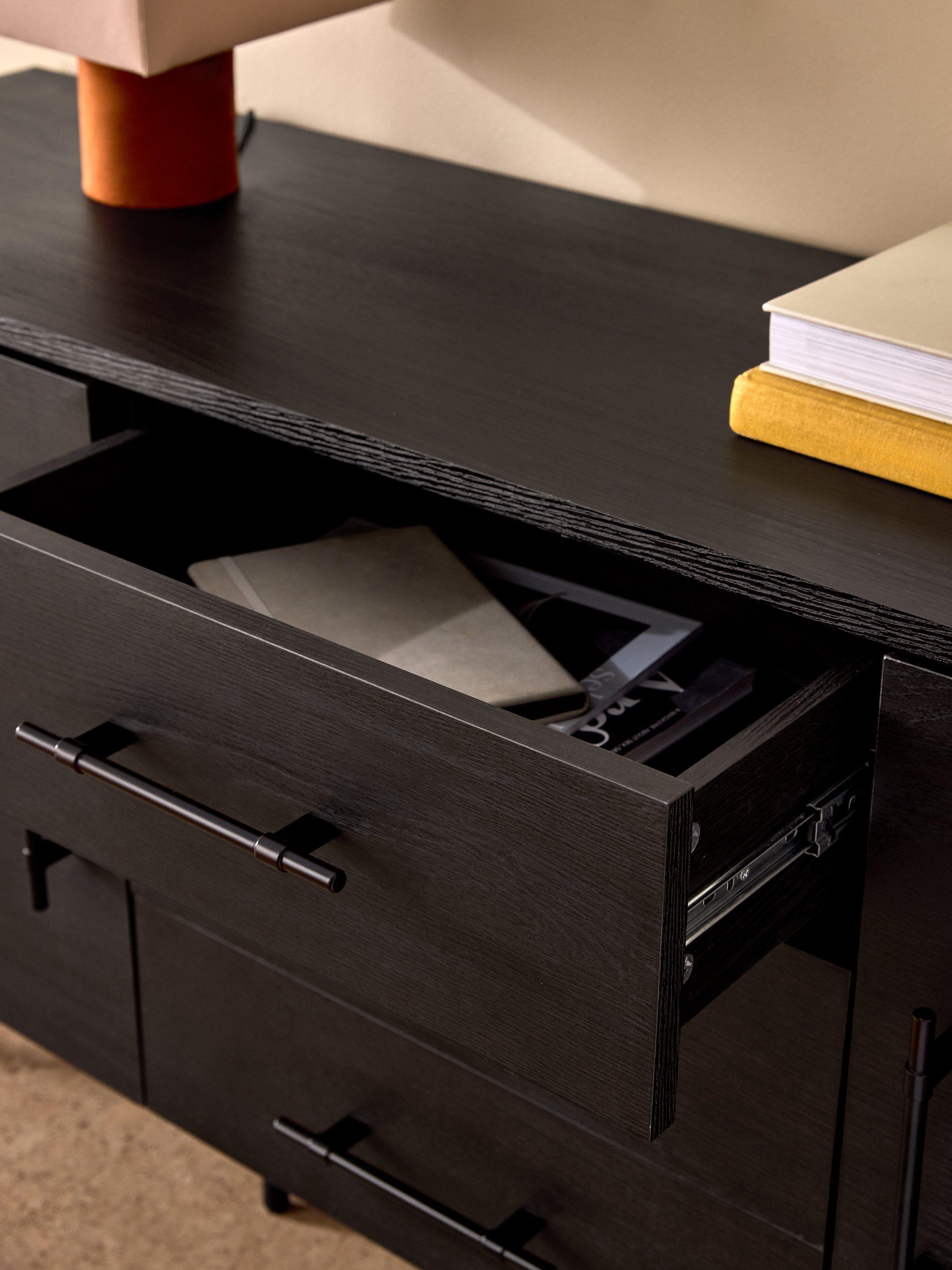 Clean lines, subtle curves and an oak finish nail this season's trends. This modern design features 3 drawers 2 doors sideboard in dark oak.