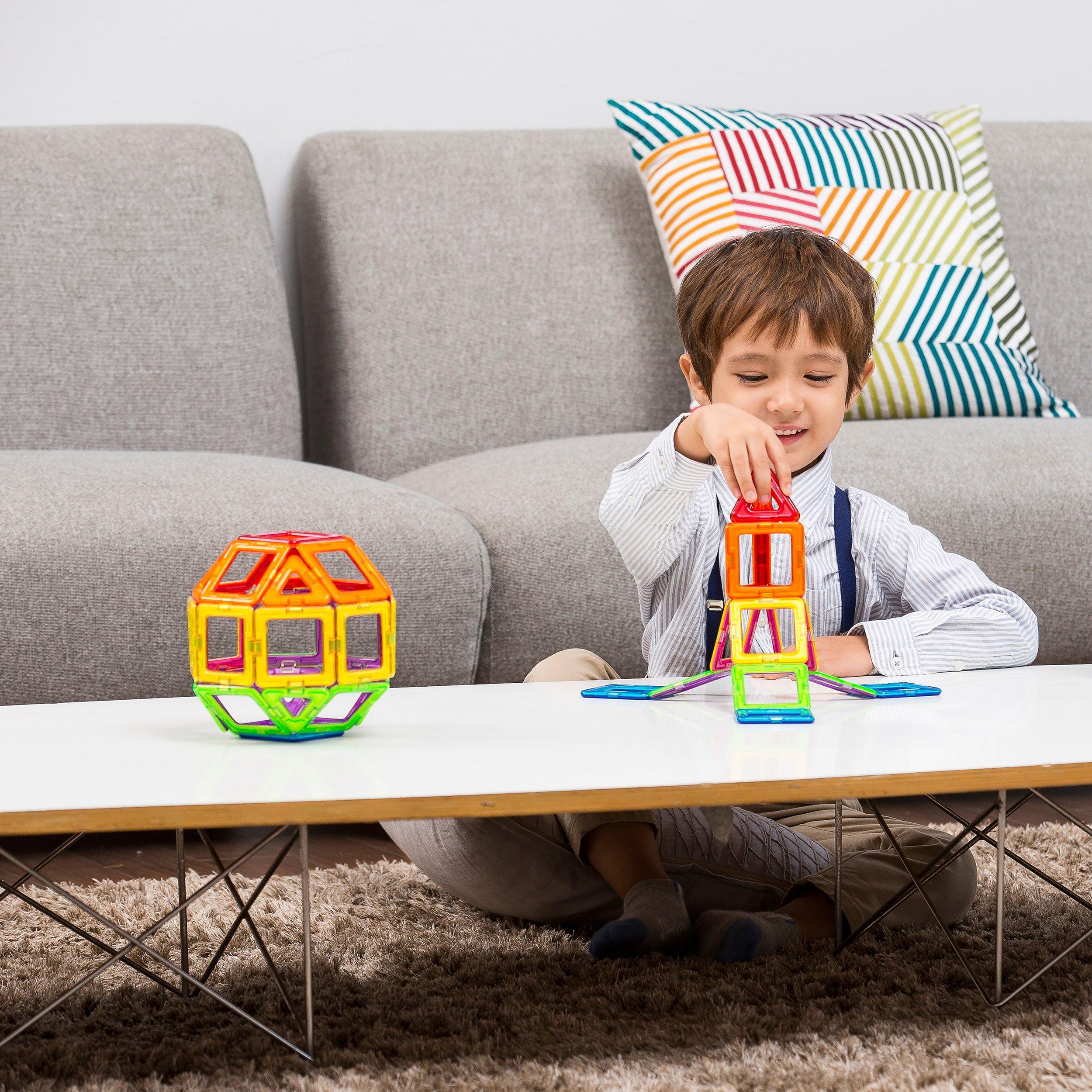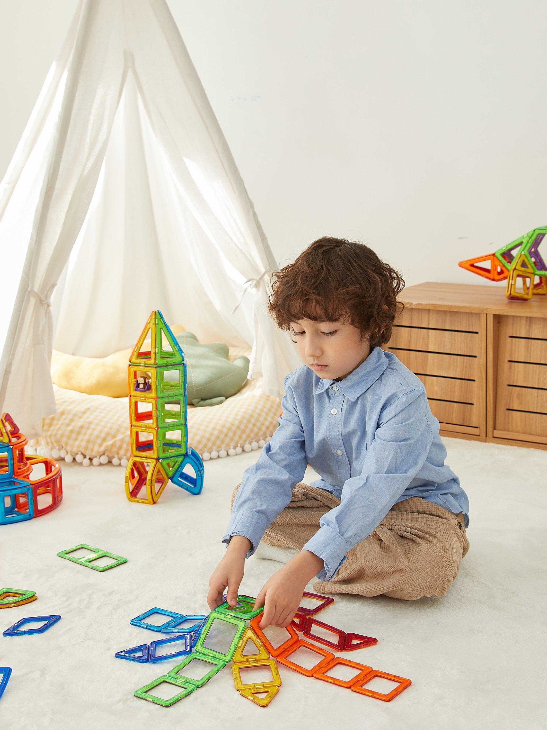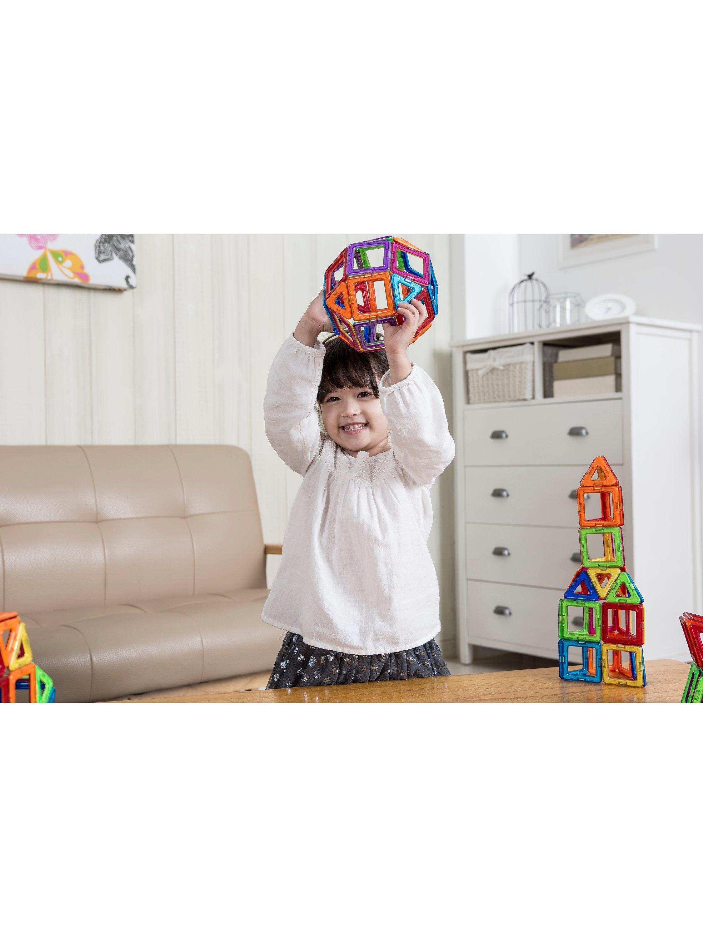 Featuring 30 rainbow coloured geometric pieces, each piece contains free-spinning magnets to easily connect to one another. Using their imagination, children can create any number of models and builds: from animals to buildings to vehicles and more!