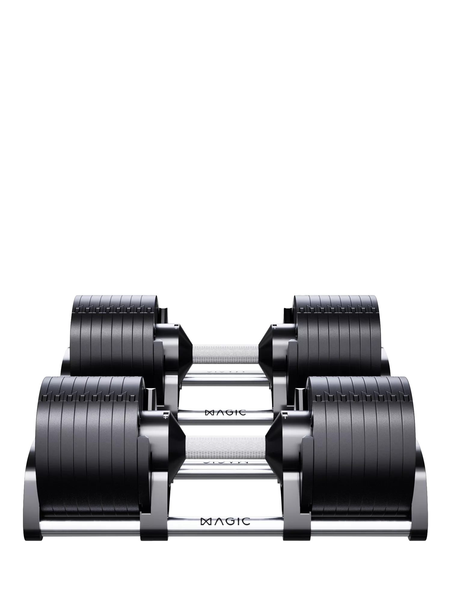 Replace an entire weight rack with a 16-in-1 weights solution. The patent-pending MAGIC smart dumbbells increase from 2KG all the way to 32KG in 2KG increments ensuring you can progress easily. Together they total 64KG of weight and are easily adjustable with a single twist of the handle.