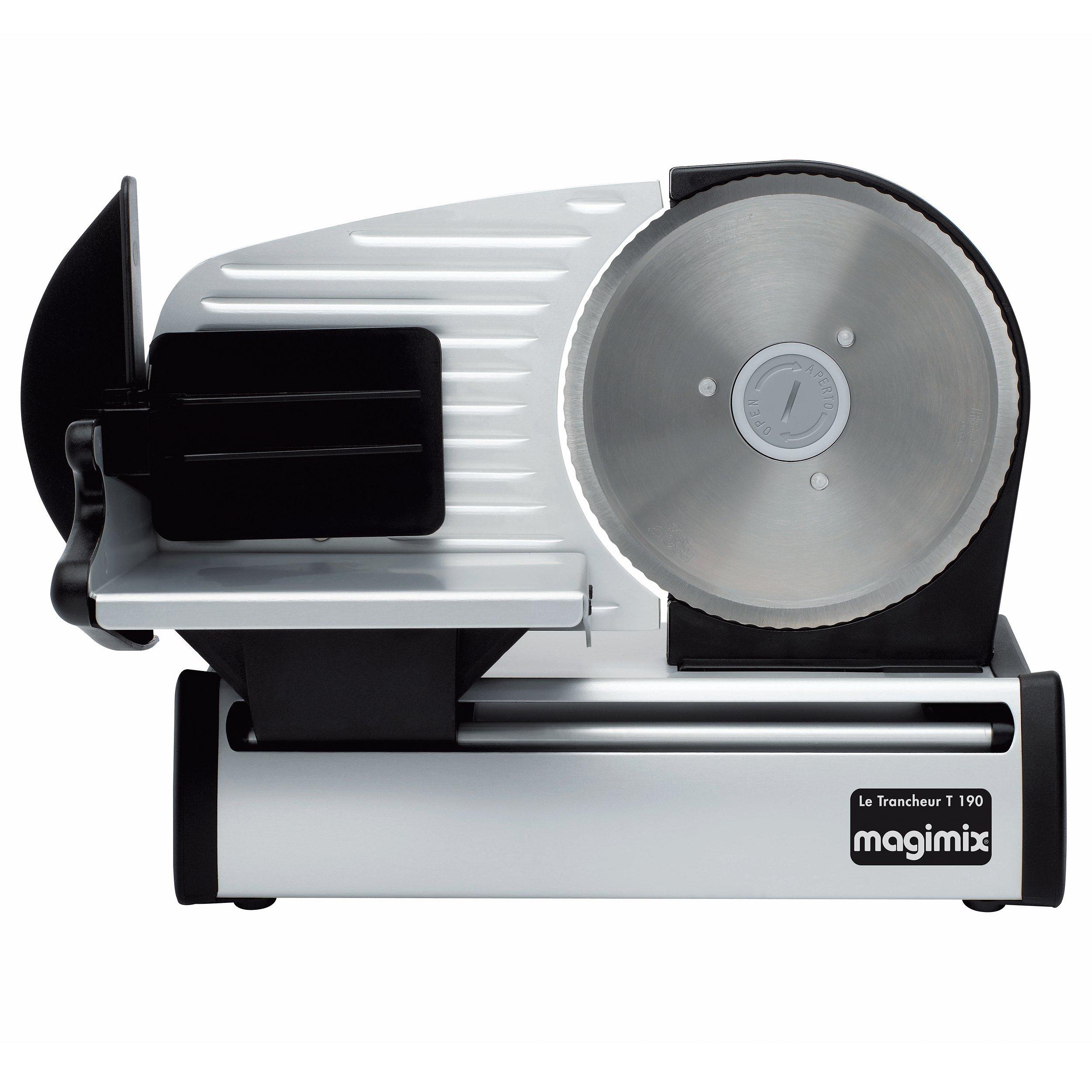With 130 rotations per minute, the all-metal Magimix 11650 slicer cuts up cooked meats, salami, sausages, bread or cheese accurately and speedily. Its 19cm stainless steel blade cuts a variety of thicknesses - from 1mm to 1.4cm - and can be removed for easy cleaning. Its easy glide carriage has a safety guard for piece of mind, and can also be removed for cleaning.