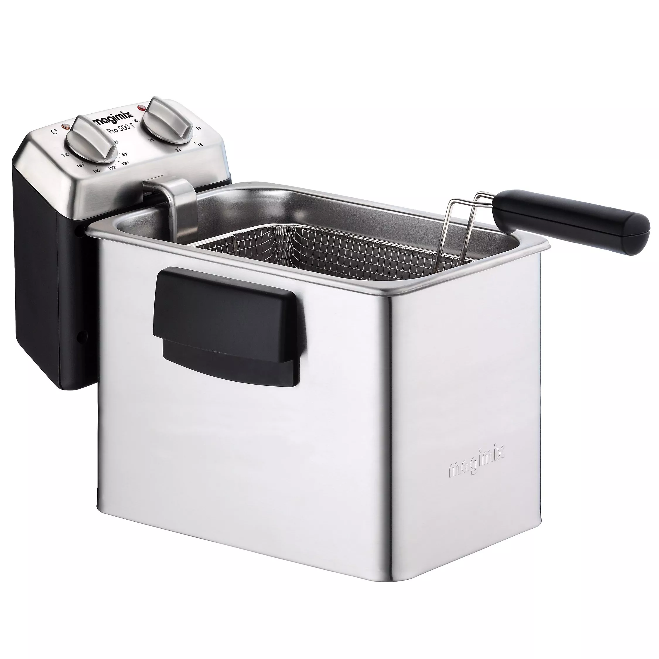 The professional quality Magimix Pro 500 will give you superb results on a substantial scale. This brushed, finger mark-free stainless steel fryer, heats up to 4L of oil in just 6 minutes, enabling you to deep-fry up to 1.5kg of food quickly and crisply. And its cool zone prolongs the life of the oil.