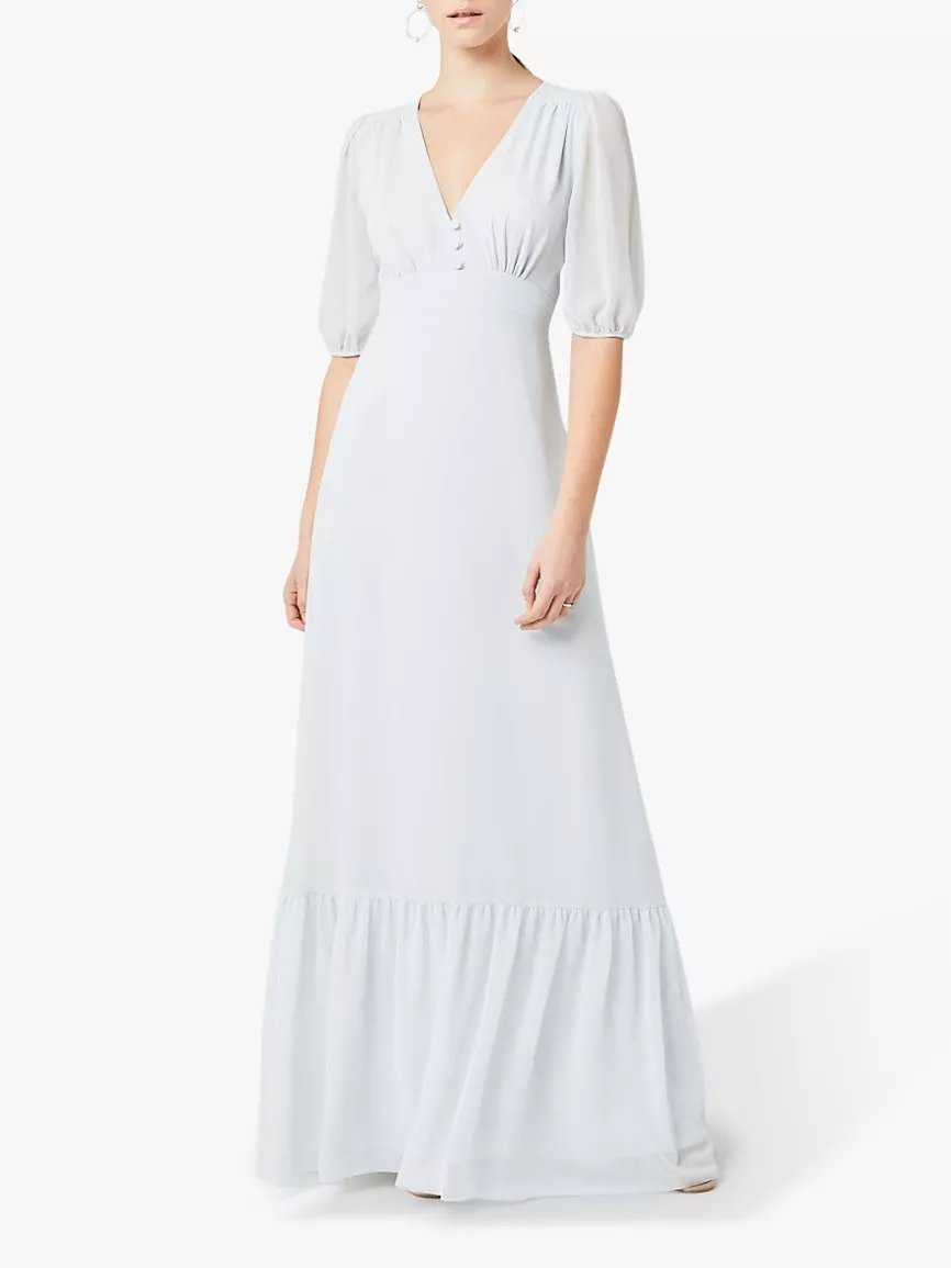 An ideal option for bridesmaids and special occasions, this elegant dress from Maids to Measure is made from chiffon for a light, floaty feel. The gown cinches in at the waist and ties at the back in a soft bow and is detailed with fabric-covered buttons to the v-neckline. The long skirt has a graceful flow with a tiered hem, while the sheer blouson sleeves beautifully showcase the delicate chiffon fabric. Complement with matching coloured heels and sparkling jewellery.