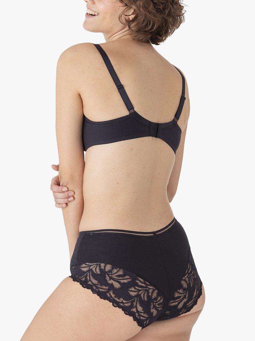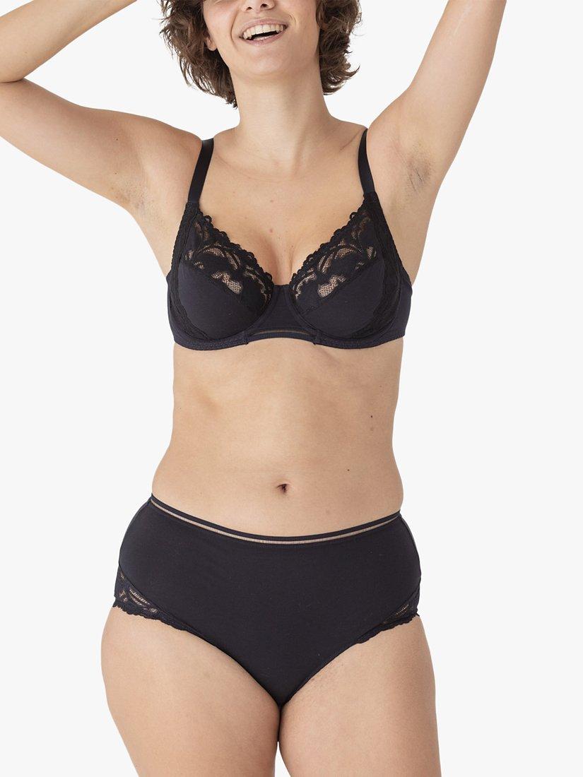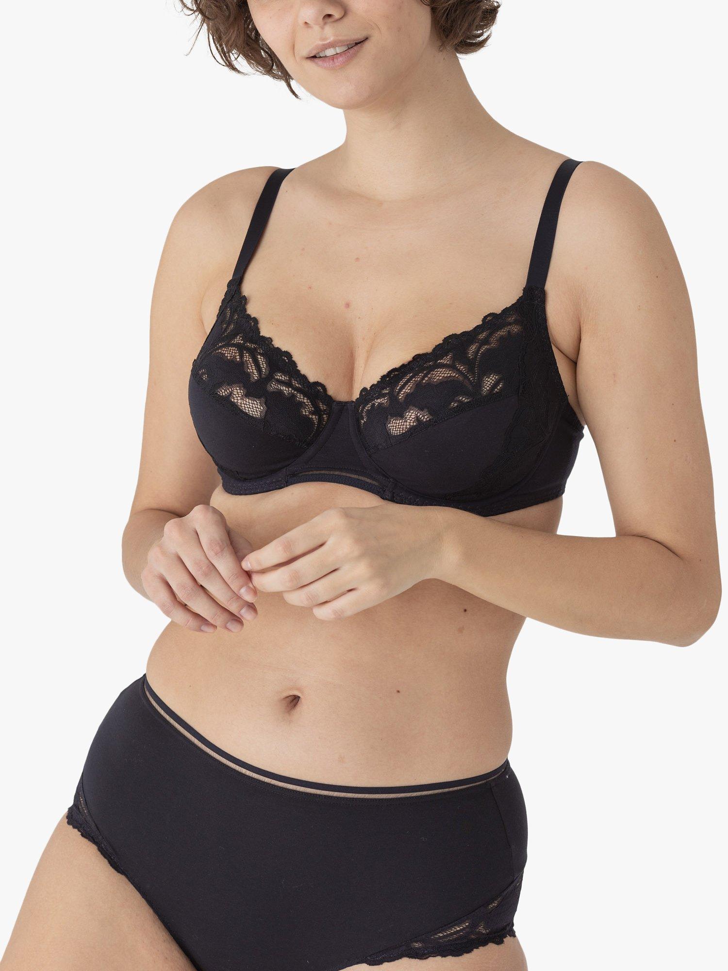 Designed with a 3-piece shape with cotton lace at top of the cup and on the side panel for comfort and support up to cup size H. Specifically designed for fuller busts the whole of the cup is lined with tulle for optimal comfort and support. Perfect for everyday wear, the back and shoulder-strap width increases with size to meet the needs of fuller busts.