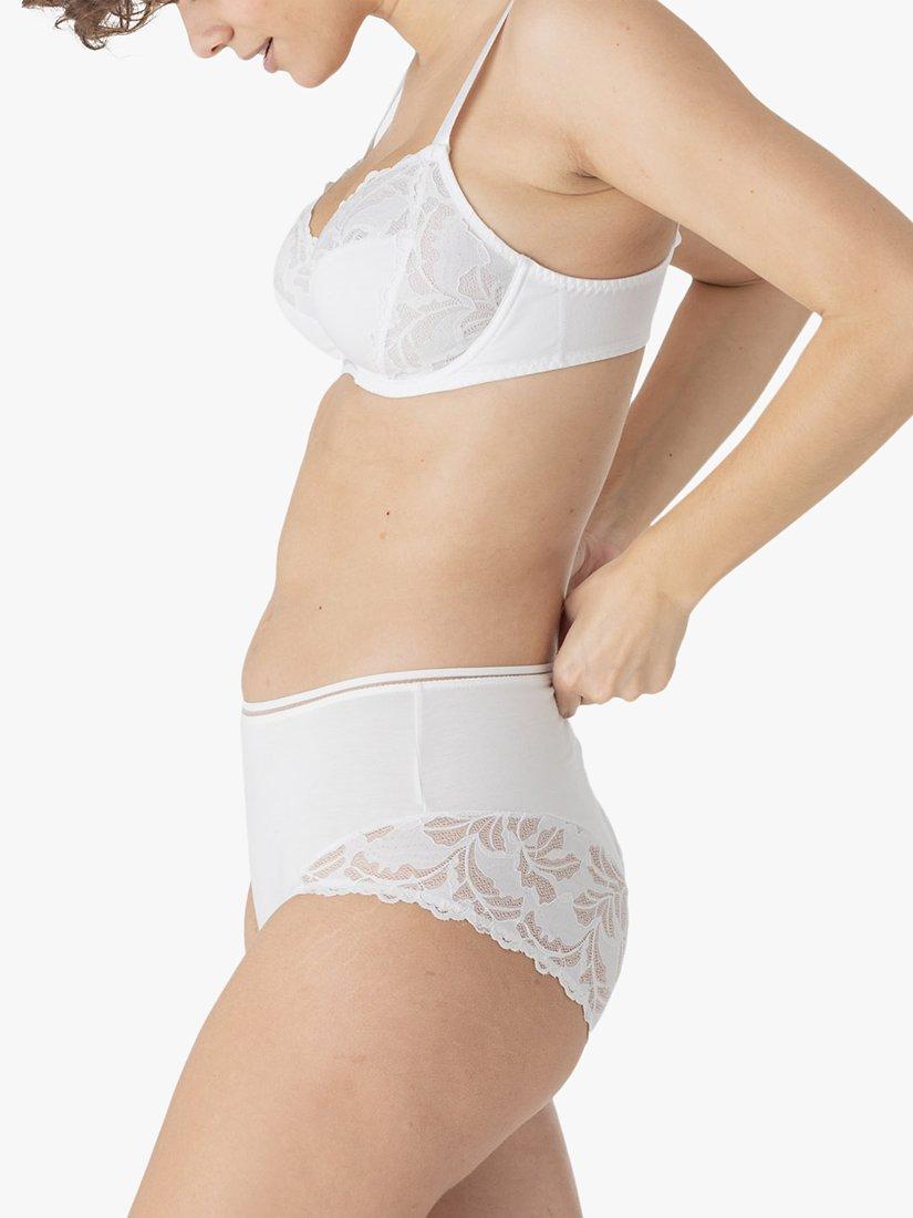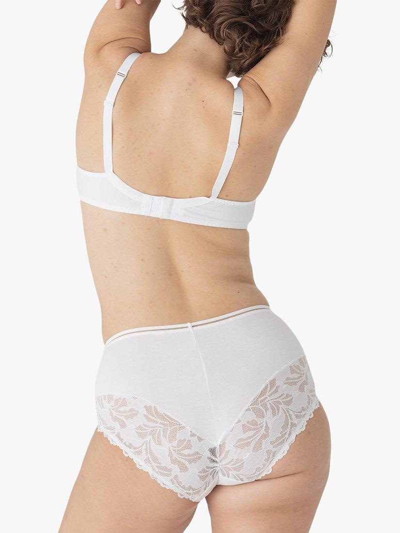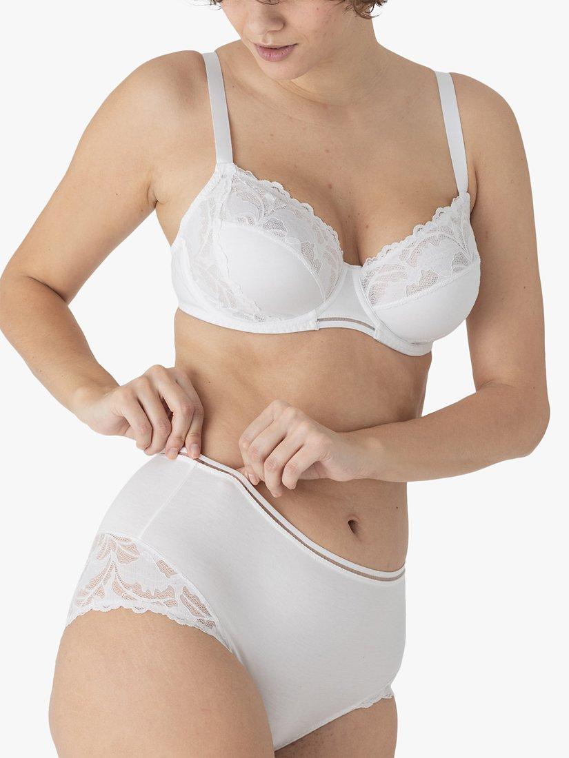 Designed with a 3-piece shape with cotton lace at top of the cup and on the side panel for comfort and support up to cup size H. Specifically designed for fuller busts the whole of the cup is lined with tulle for optimal comfort and support. Perfect for everyday wear, the back and shoulder-strap width increases with size to meet the needs of fuller busts.