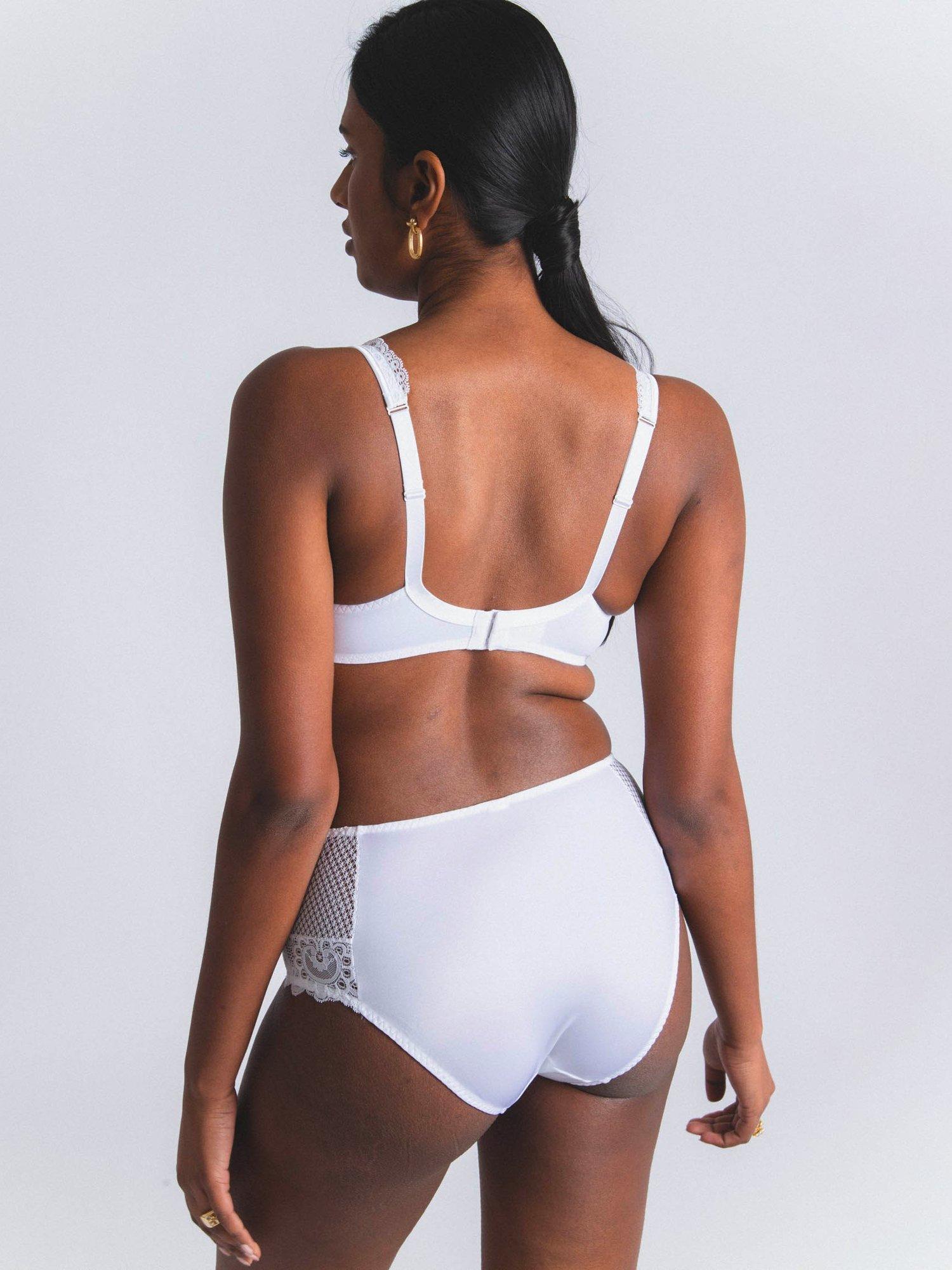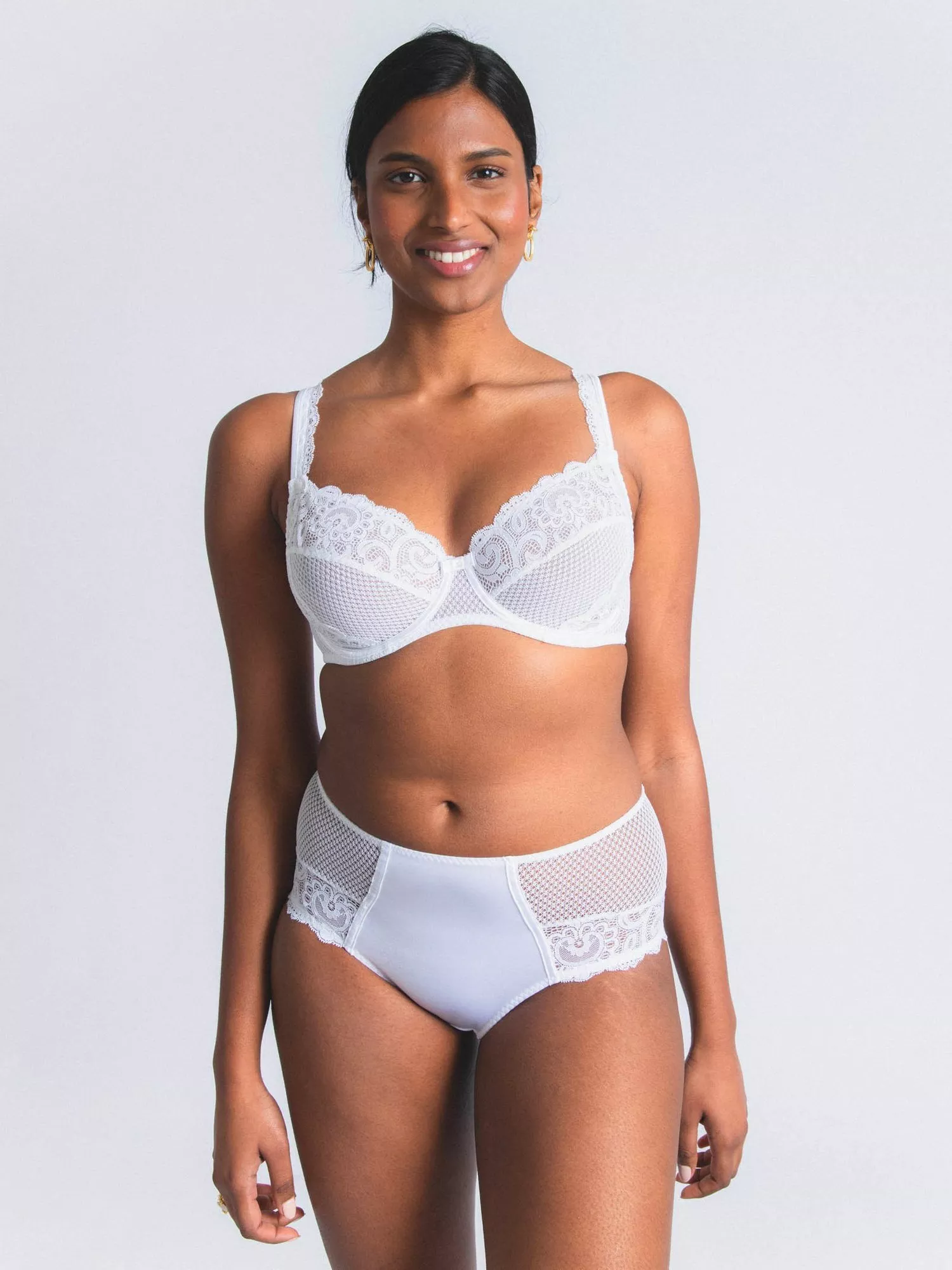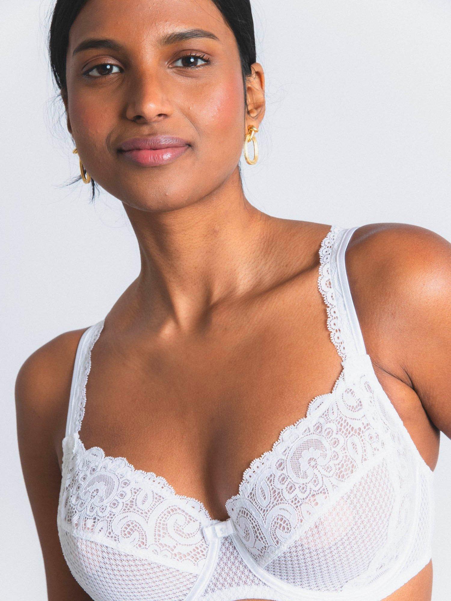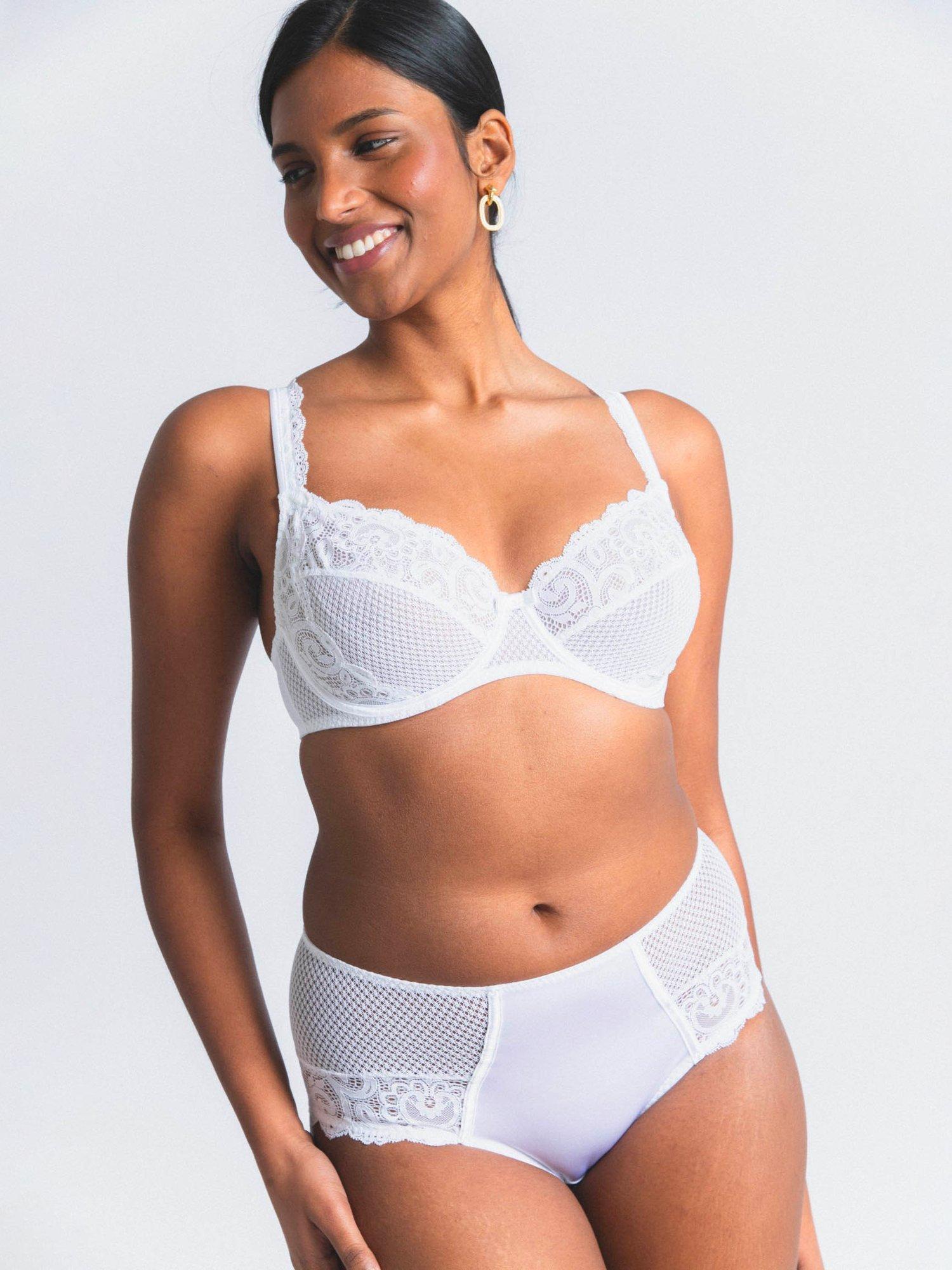An all-encompassing underwired bra in French lace, with a reassuring shape for optimal support up to an H cup. Features fully lined low cups and wide sides suitable for deep cups. Designed with feminine, soft and comfortable satin finishes.
