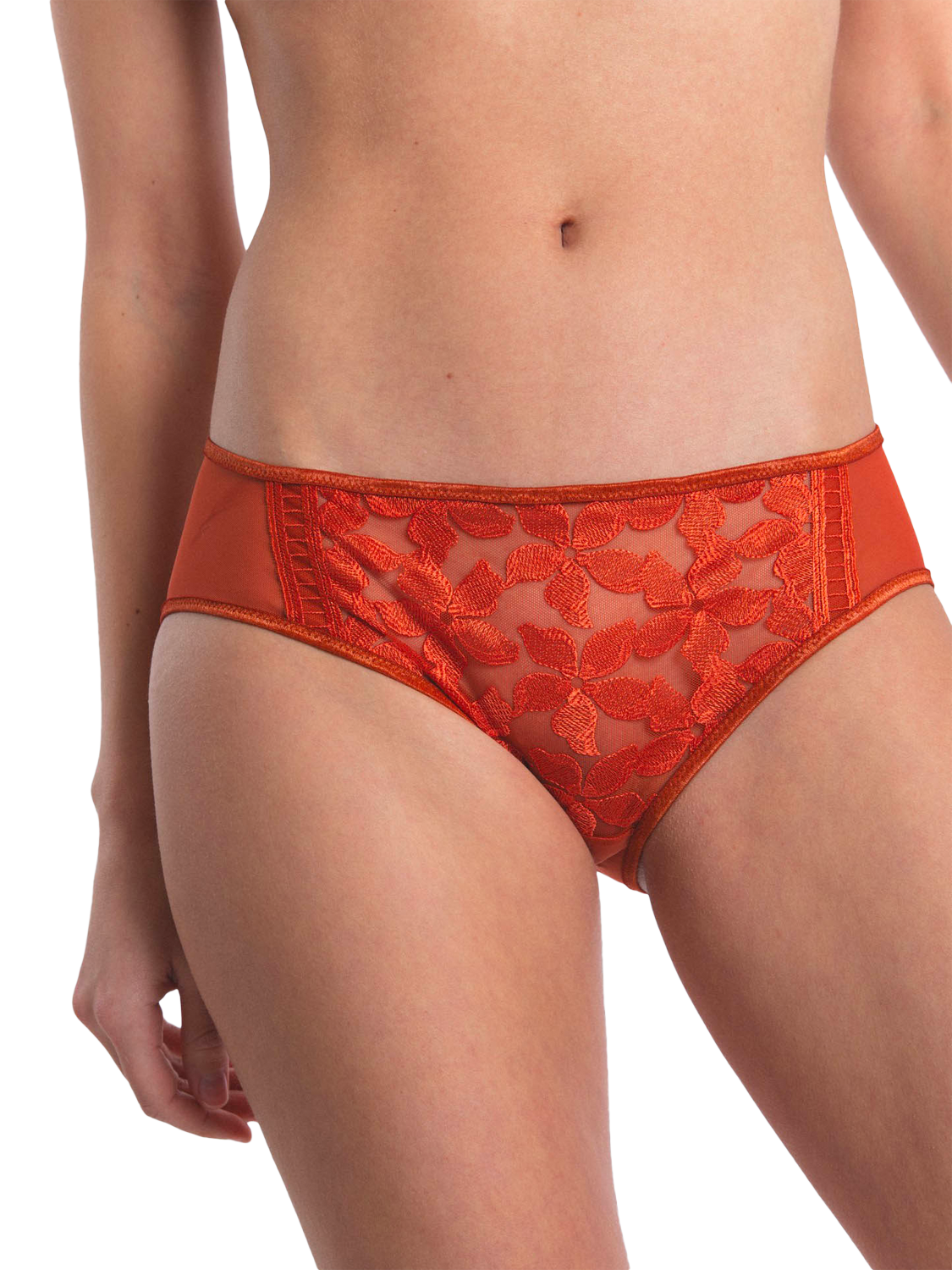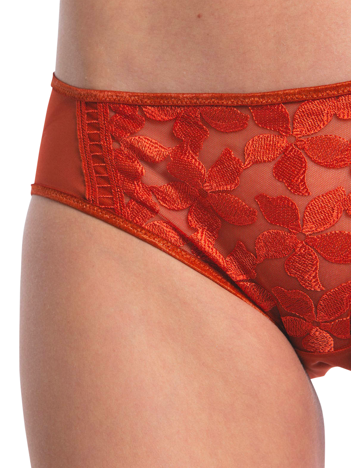 A pair of floral embroidered, semi opaque briefs providing seduction and sensuality.