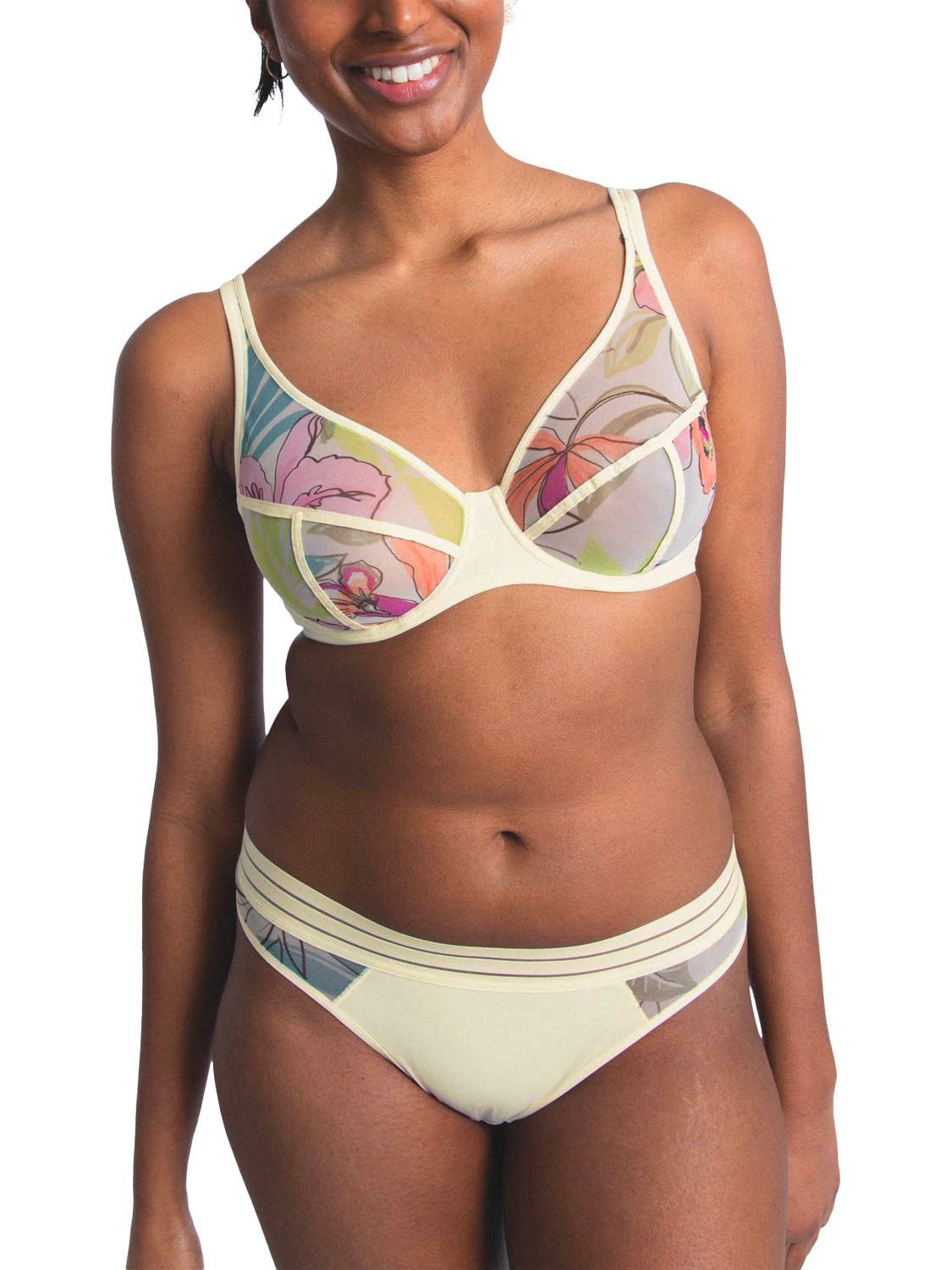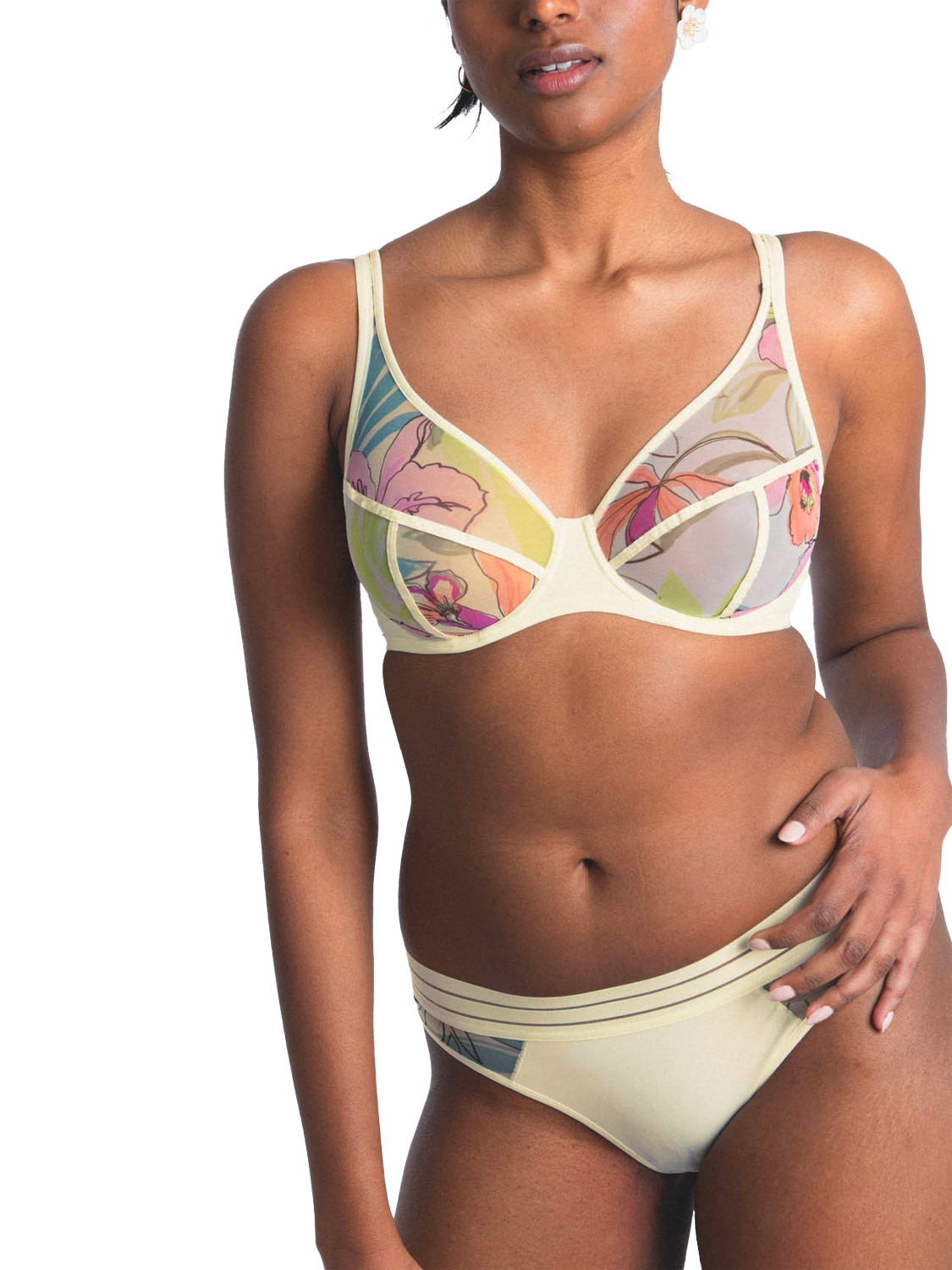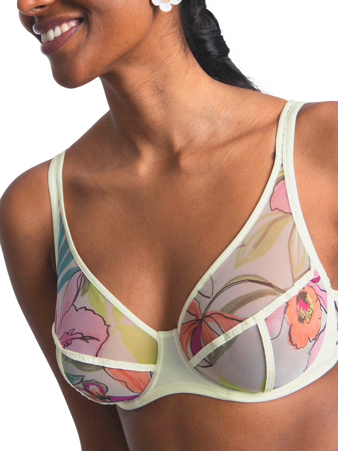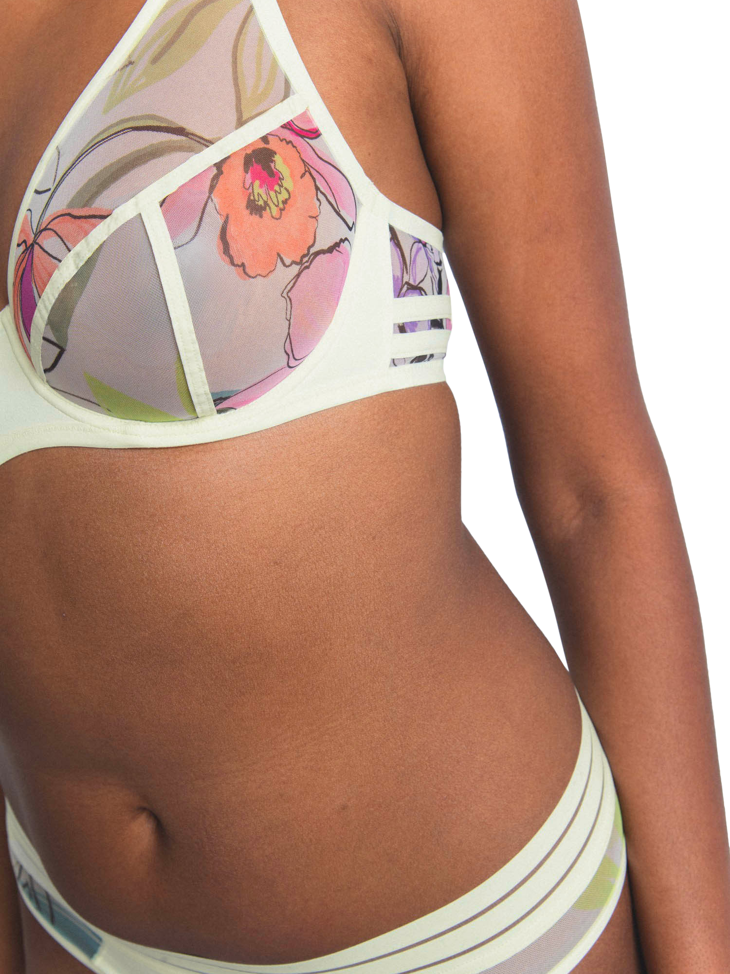 An underwired bra with a "sporty-chic" style and an abstract floral pattern.