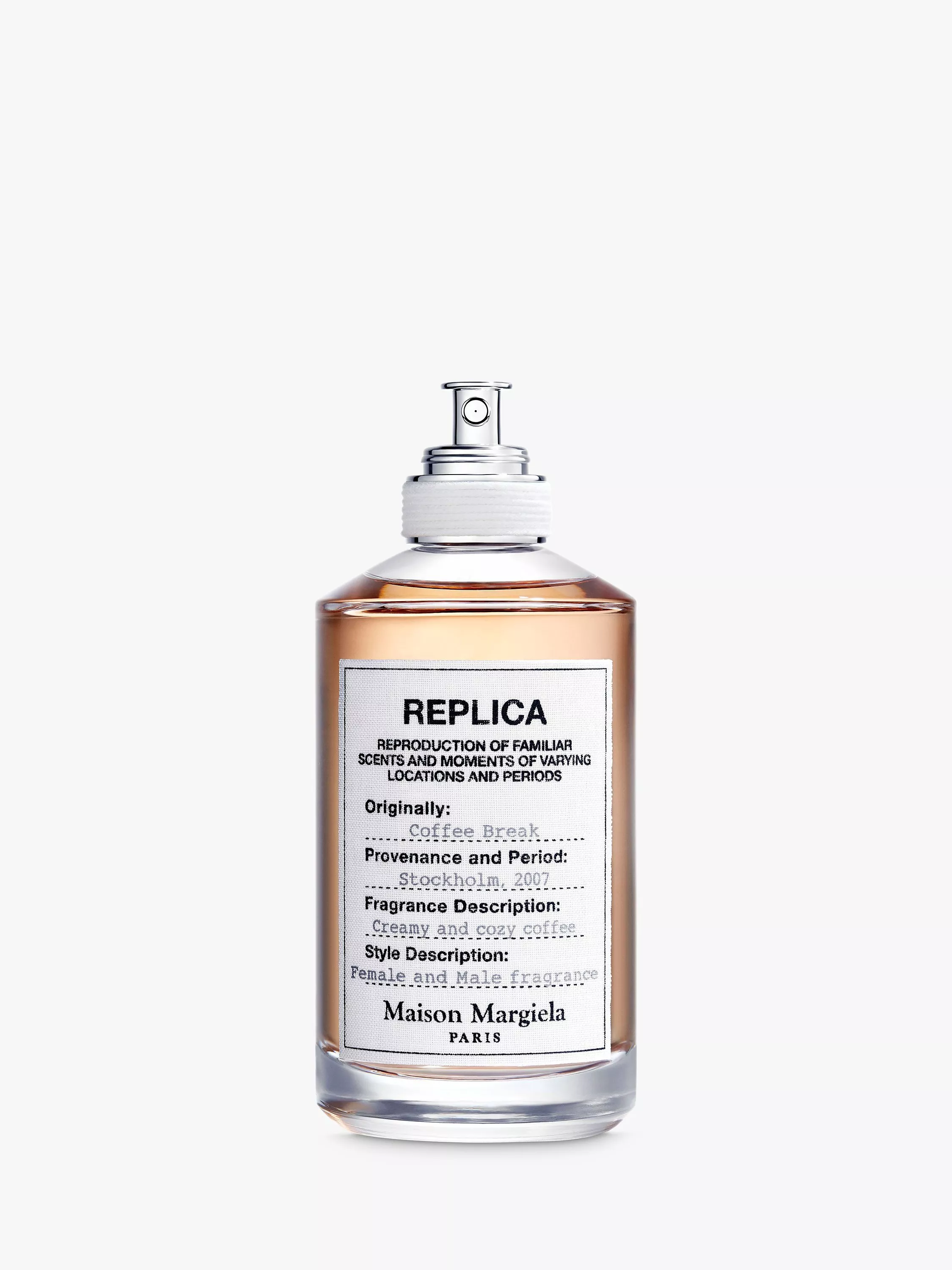 Coffee Break Eau de Toilette, by Maison Margiela, captures a comforting coffee break in a bottle. Coffee and Milk Mousse Accord bring a sweet warmth to the fragrance, like the first sip of a hot drink. Refreshing notes of Lavender and Spearmint Essence evoke the freshness and vibrance of a busy café, before developing into long-lasting, woody base notes of Sandalwood and Cedarwood.