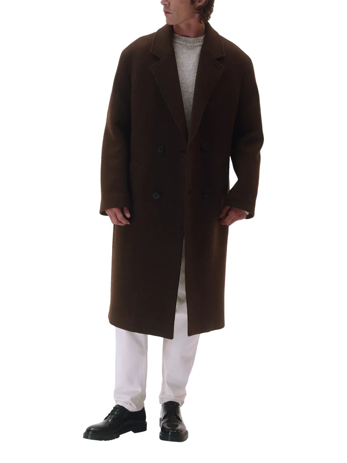 This coat is a true staple, featuring a long, ultra-oversized fit and a tailored double-breasted collar. Crafted from a slightly textured Italian fabric, it's well-suited for the cooler seasons.