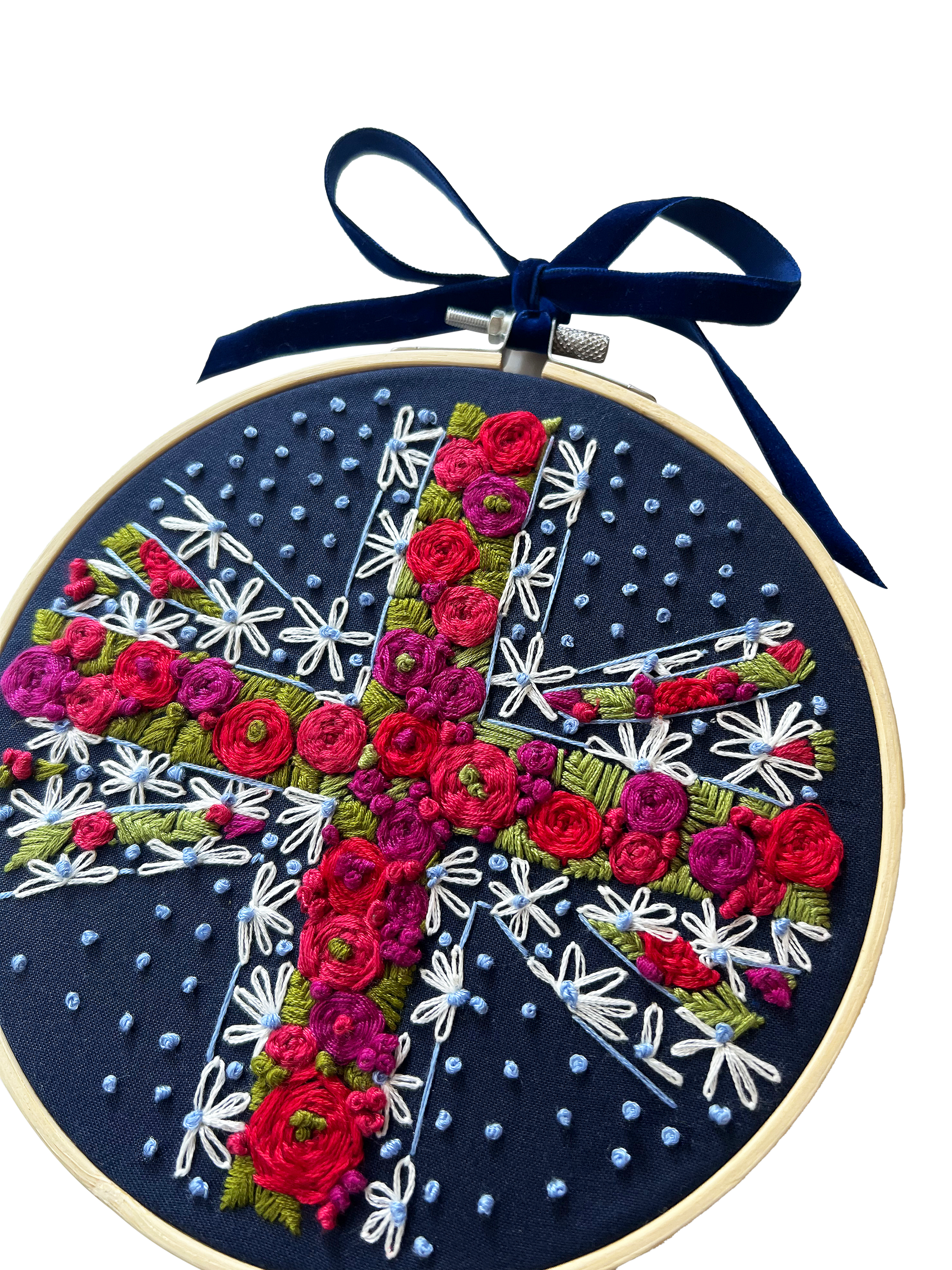 A a wonderful keepsake stitched with the flag of the United Kingdom and made up of textural, floral stitches giving a three dimensional finish.