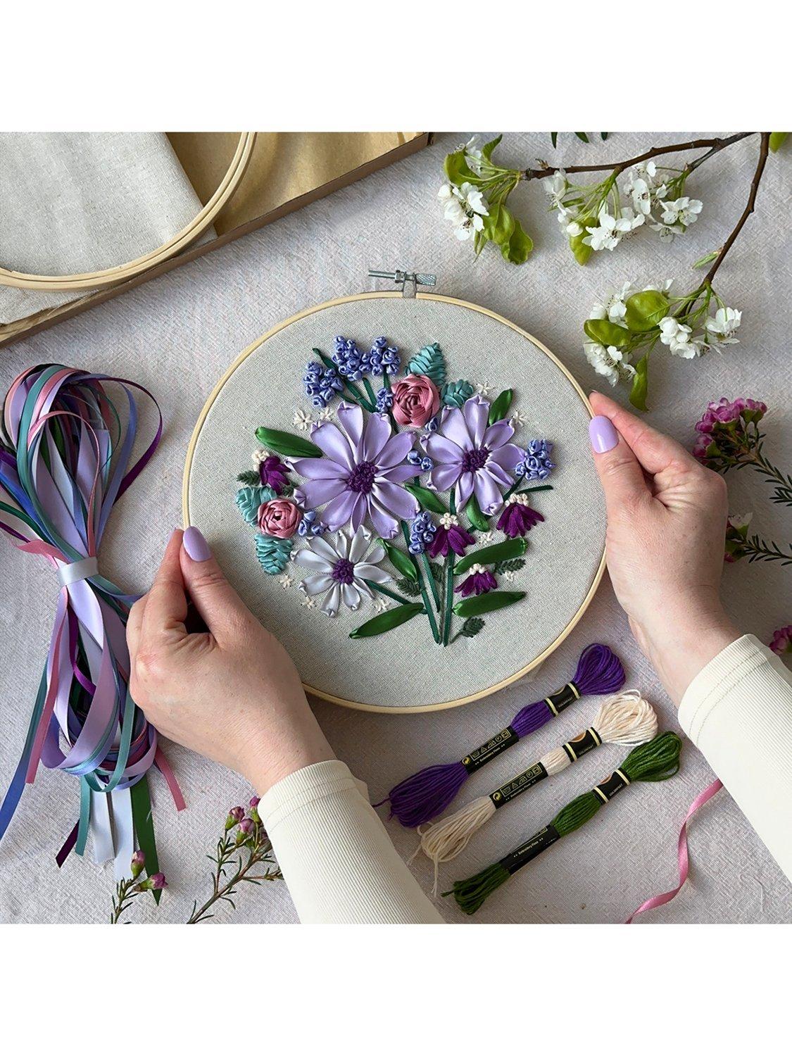 Within this box, you'll have the opportunity to explore various stitch techniques, some of which are inspired by classic embroidery. You’ll work with a large needle and a collection of 8 luxurious double-faced satin ribbons of different sizes. The fabric base is supreme Irish Linen, providing an ideal texture for your artistic endeavours.