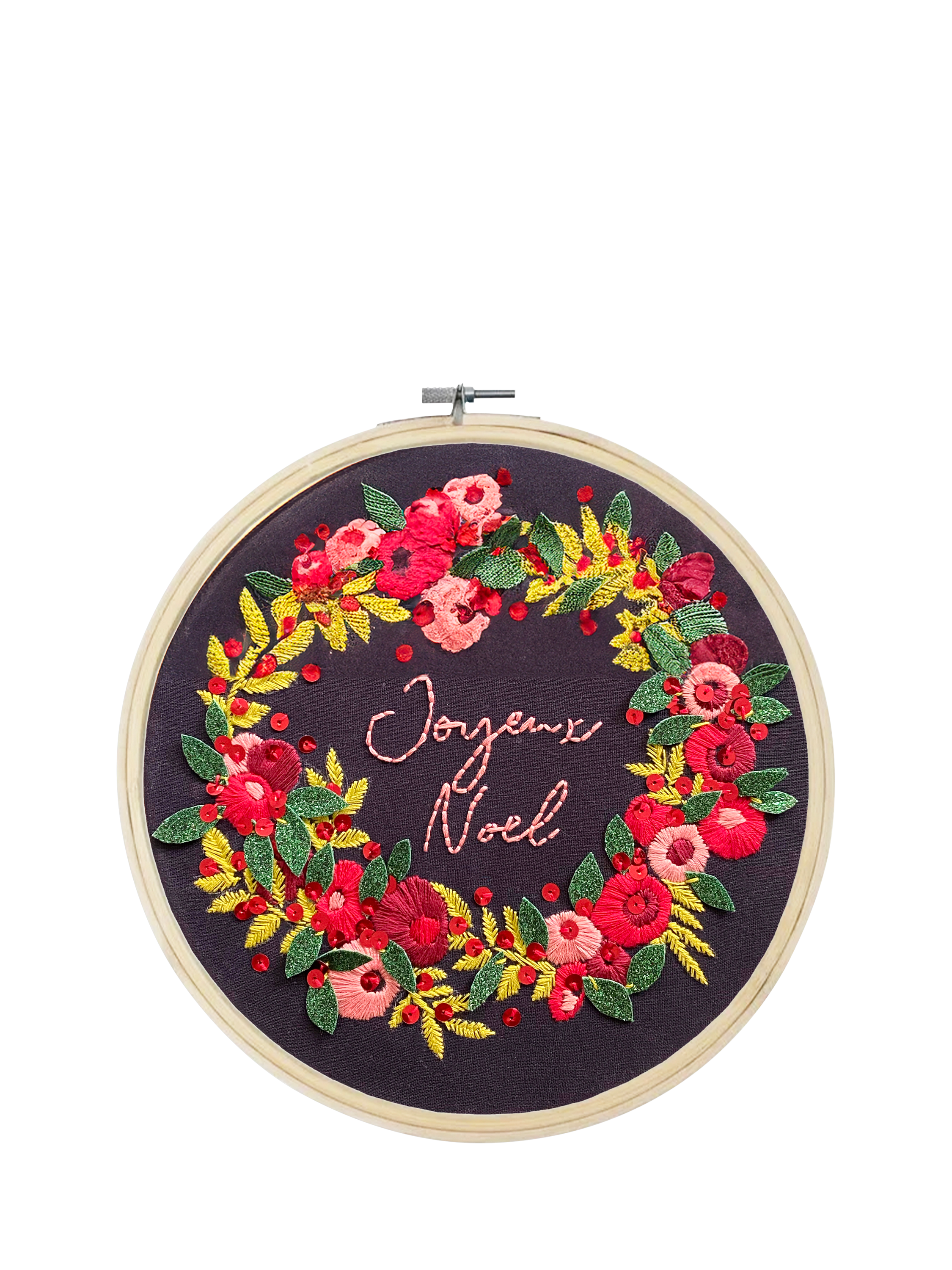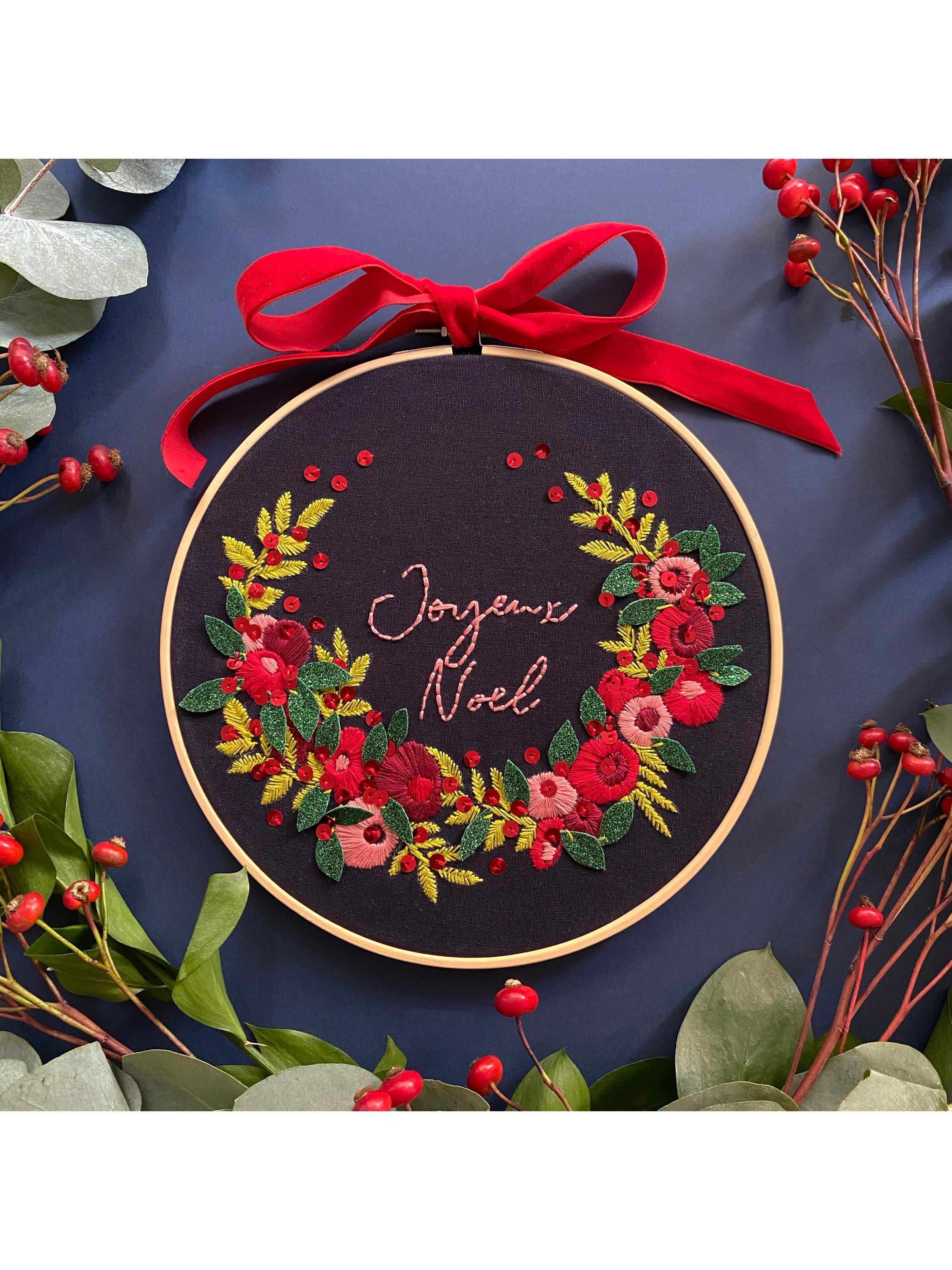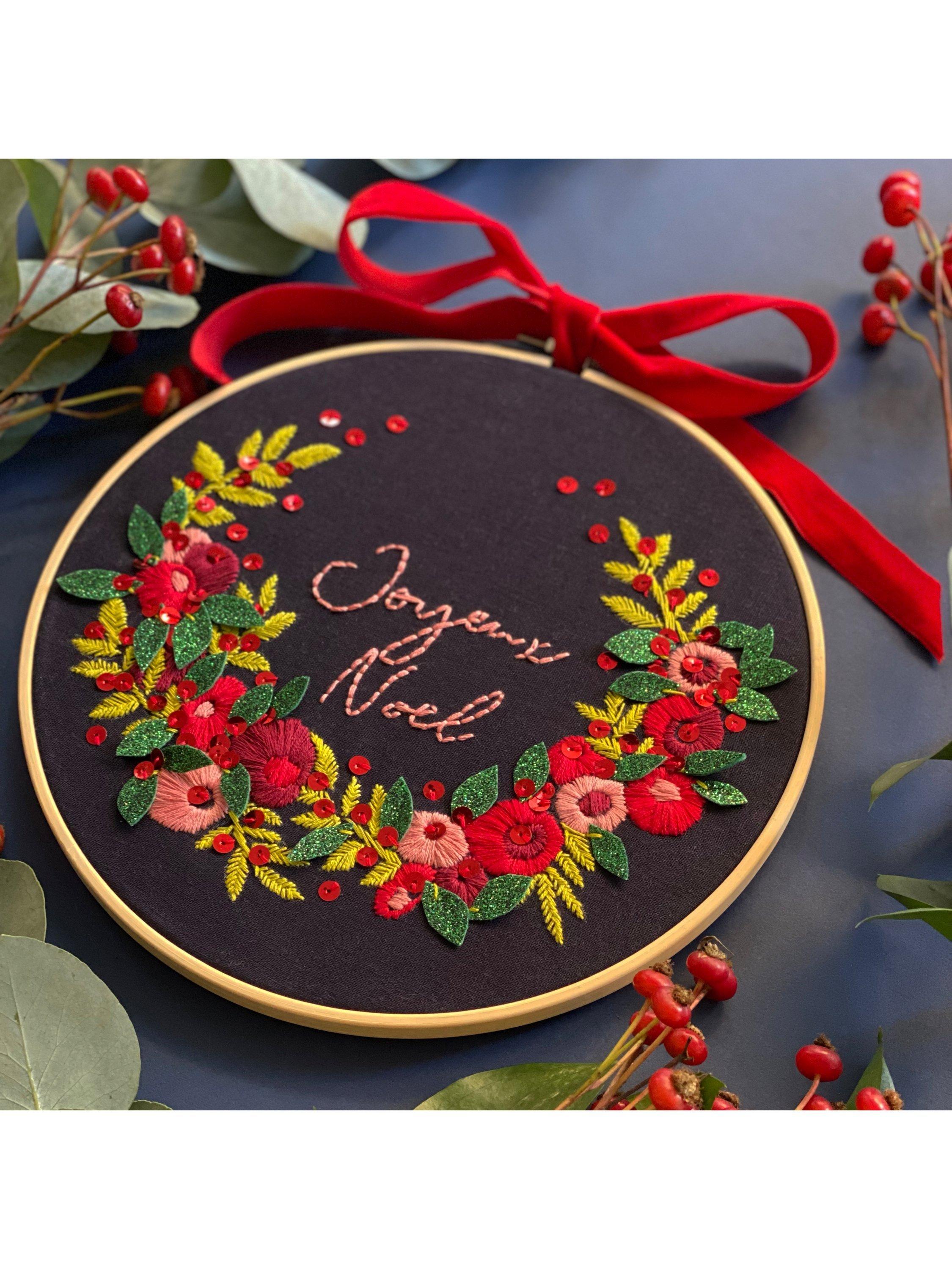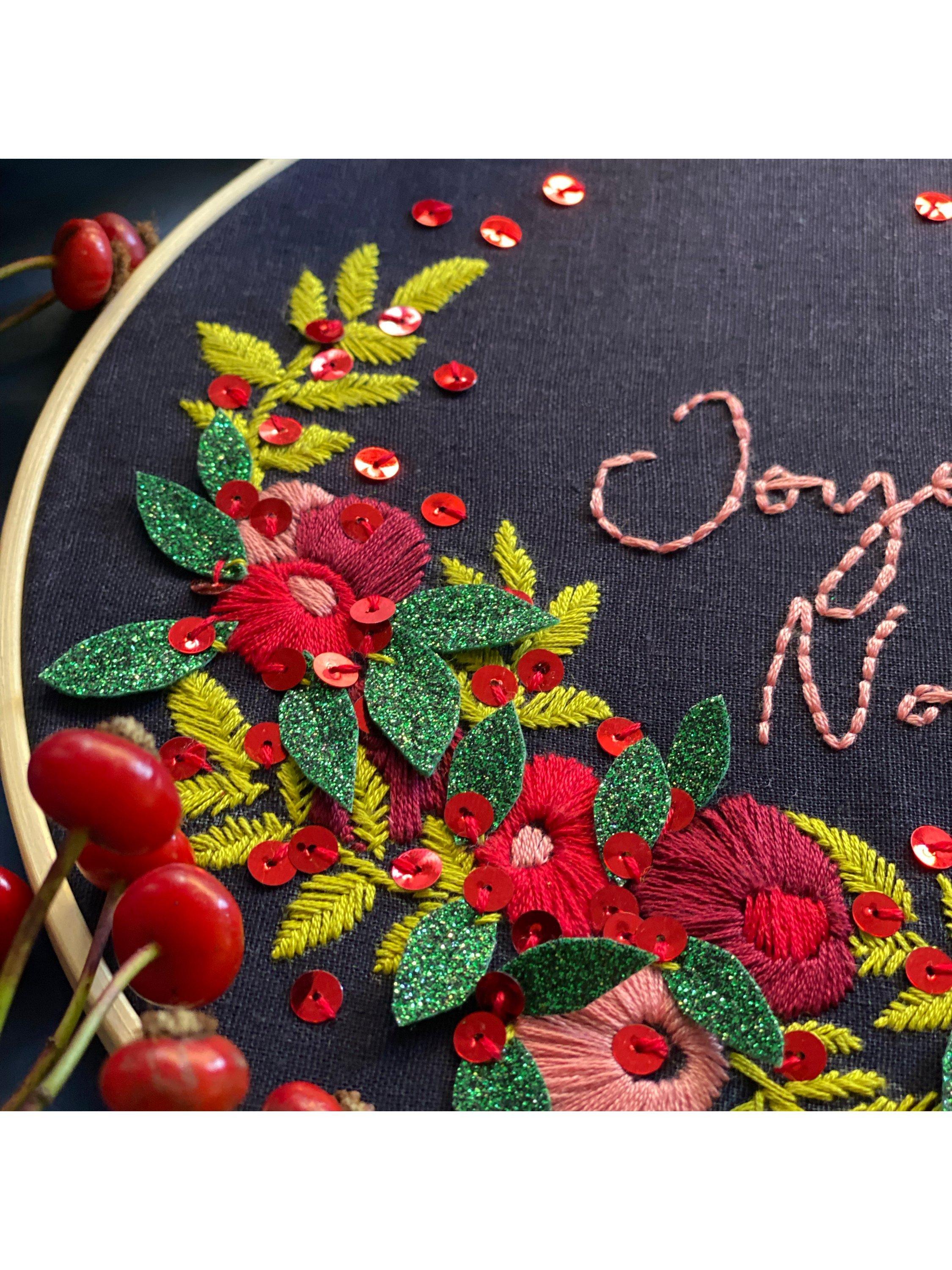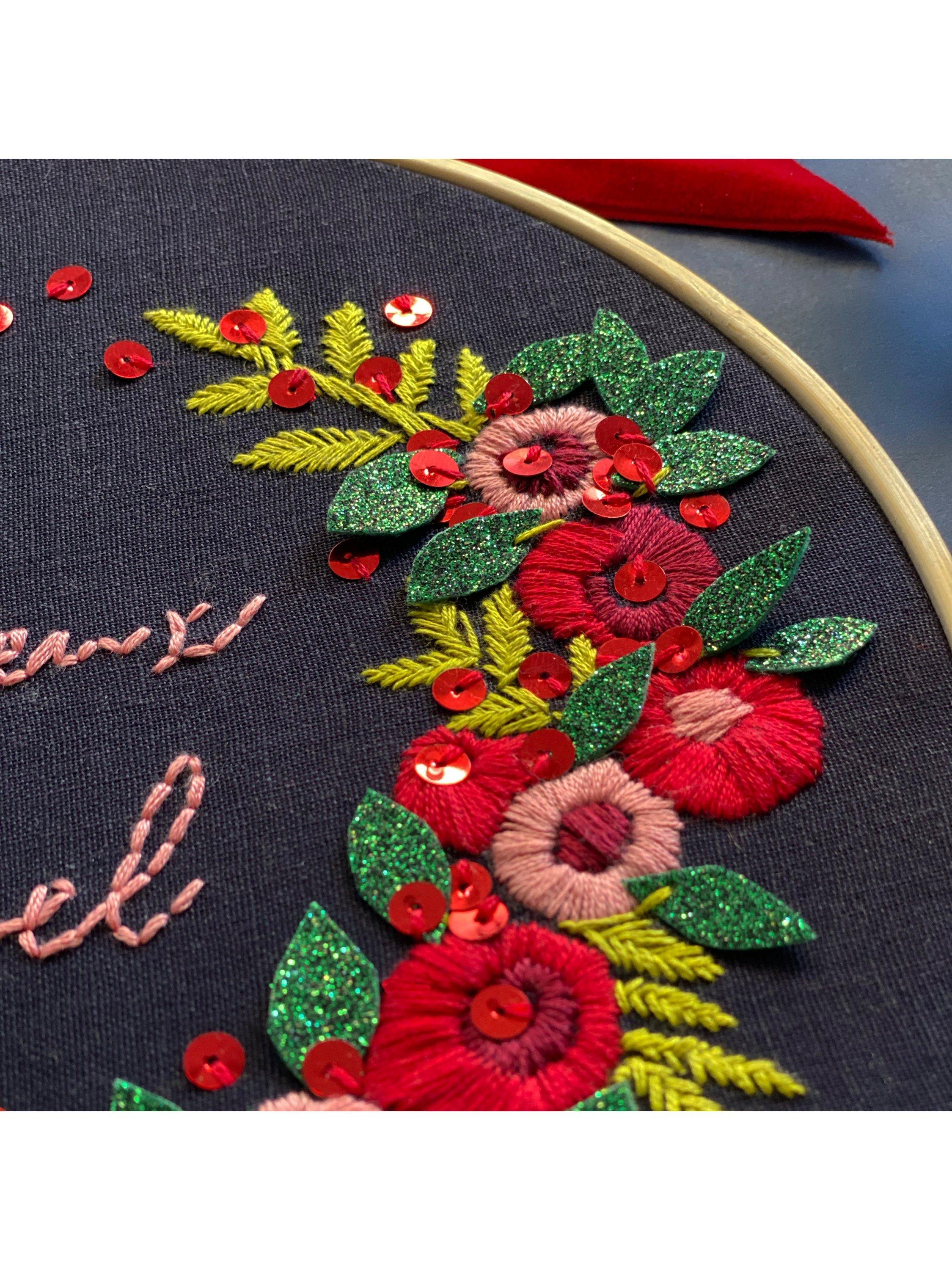 Working with premium threads, you will love stitching the elements over the festive period, then taking things to the next level, finishing with red sequins and sumptuous green glitter felt, creating textural magic and a piece you will love bringing out year on year.