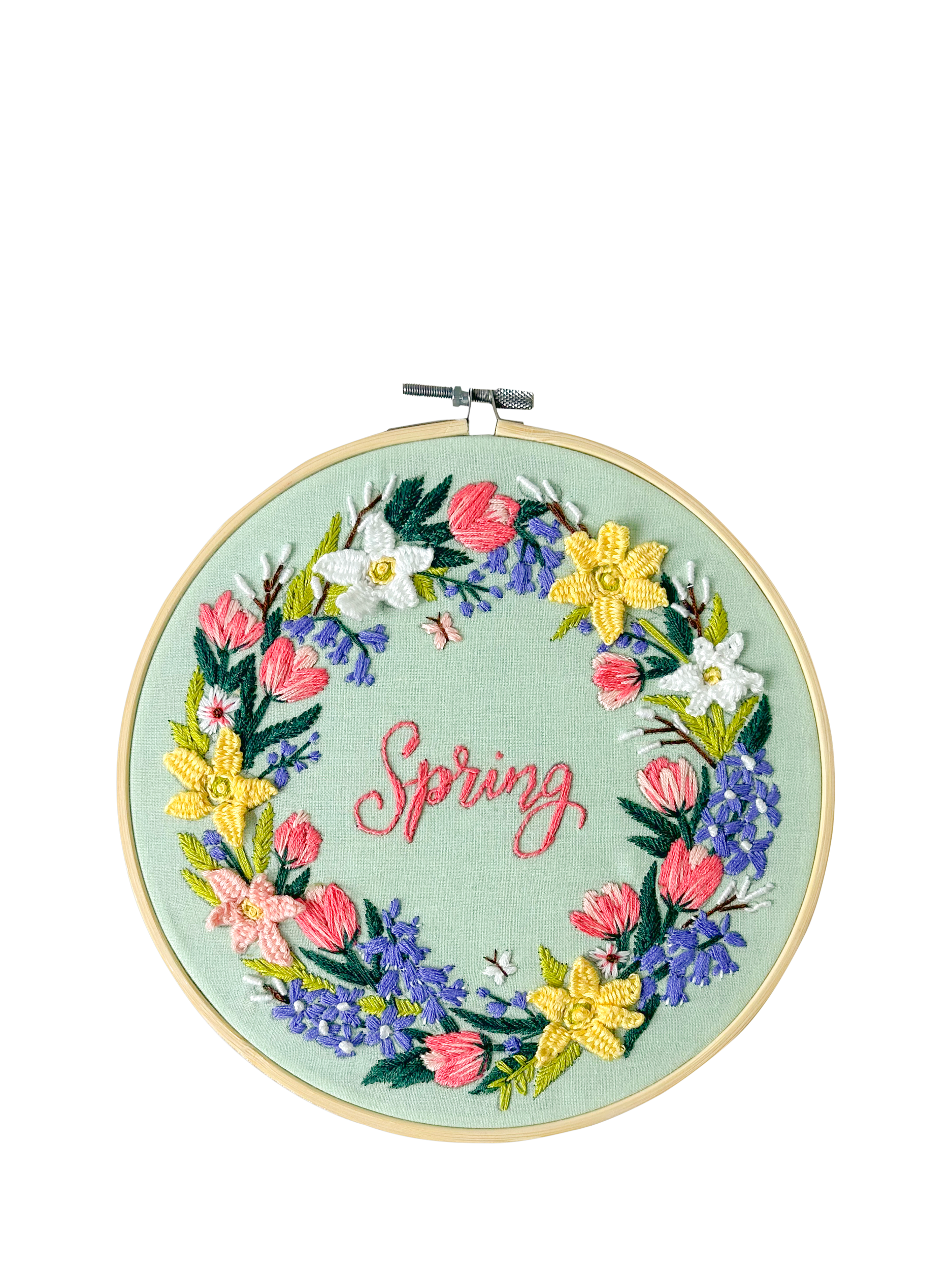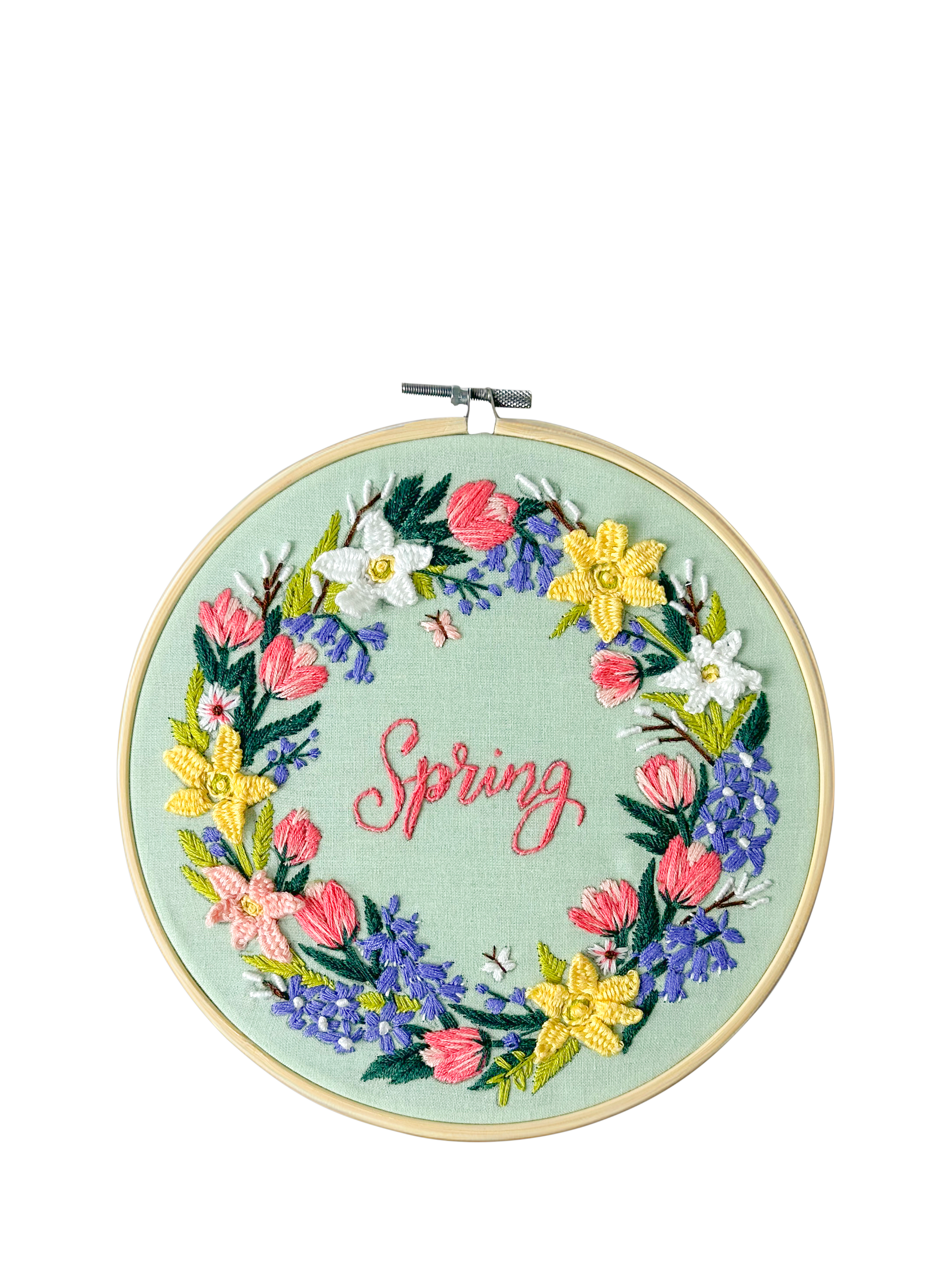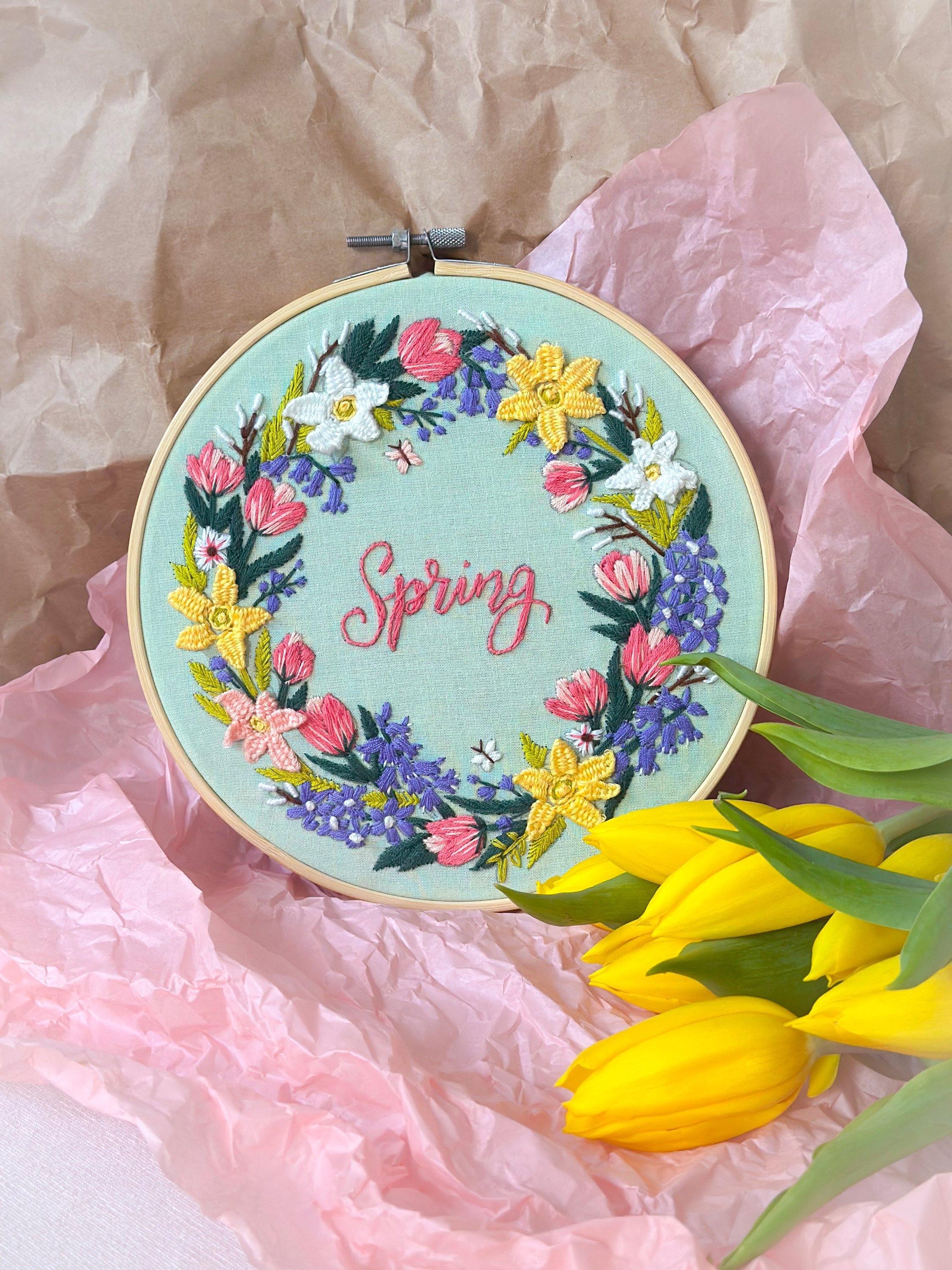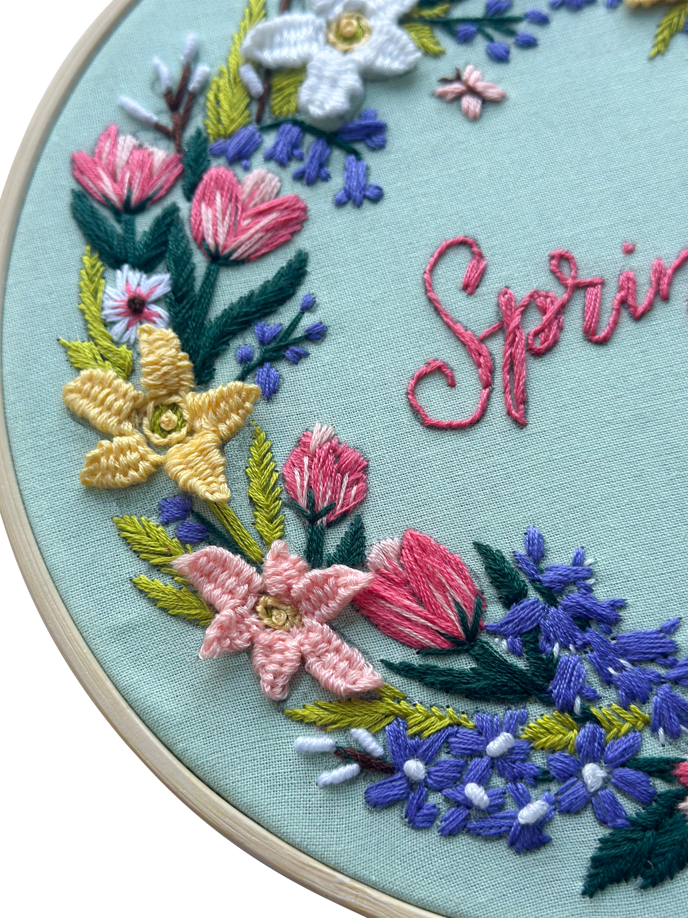 This piece is a joyful chorus of the season's first colours. A wreath of tender green shoots becomes the perfect stage for delicate bluebells, blushing pink tulips, and soft drifts of cherry blossom. Little butterflies dance within the flowers, crowned with sunny, three-dimensional daffodils, their golden trumpets brought to life with three dimensional Picot stitches, rising from the fabric as if reaching for the sun.