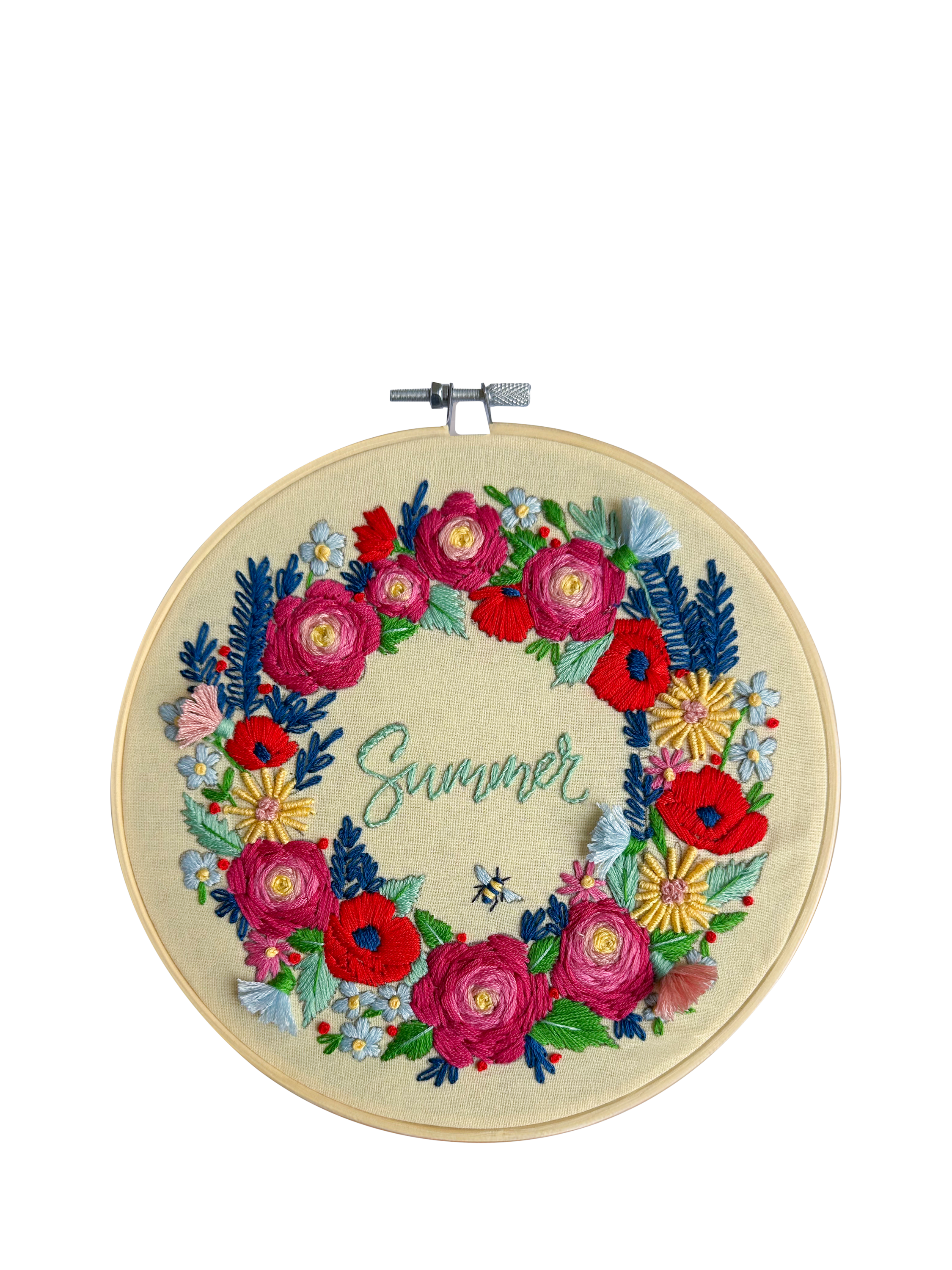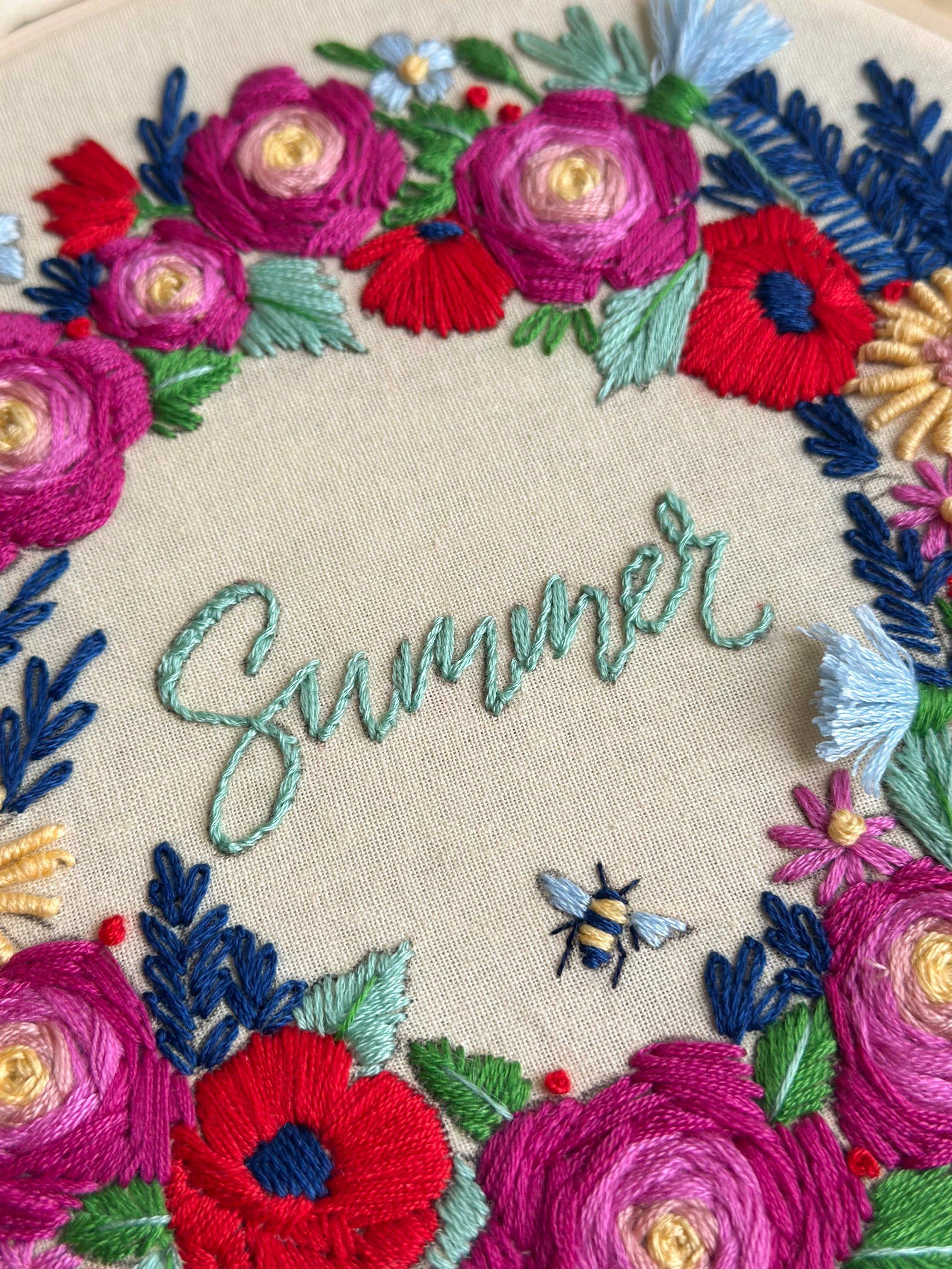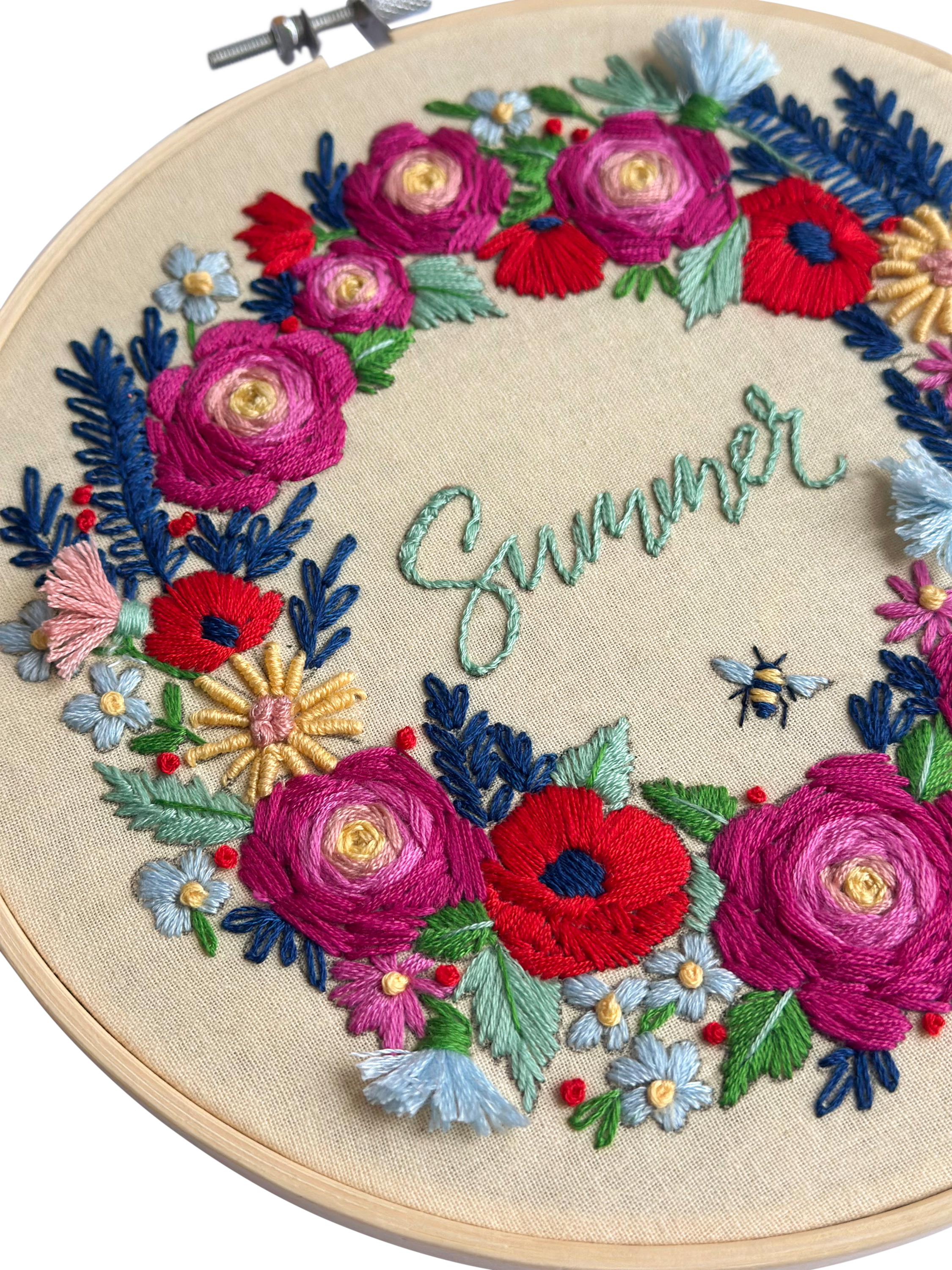 This design gathers a vibrant meadow of the season's treasures. Stitch showstopping, fiery red poppies alongside a delicate whisper of blue forget-me-nots. Sunshine-yellow daisies, tied with intricate Bullion Knots, bloom beside sprays of wild heather. At the heart of this joyful riot are the gorgeous Heirloom roses, their velvety petals unfurling from the fabric in stunning three-dimensional detail. Look closely, and you’ll find a tiny, embroidered bee humming busily as it gathers golden nectar.
