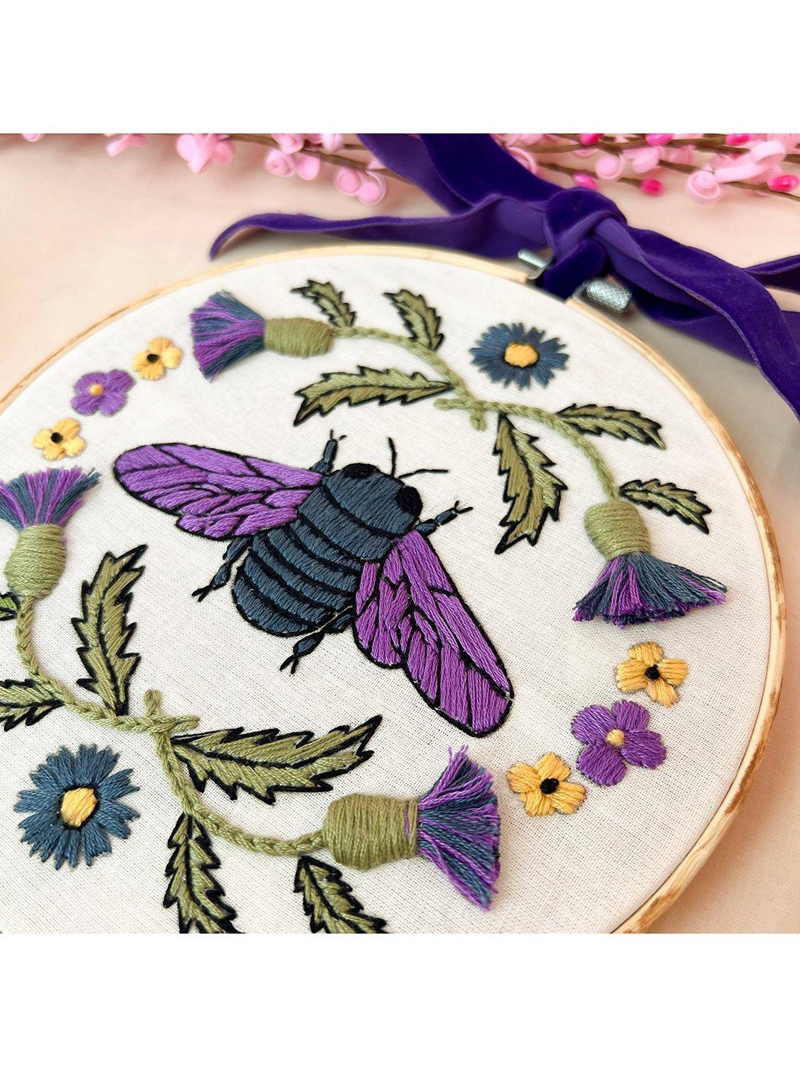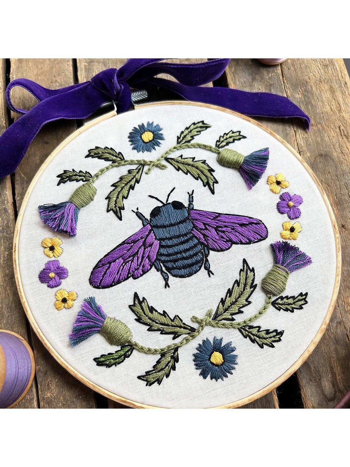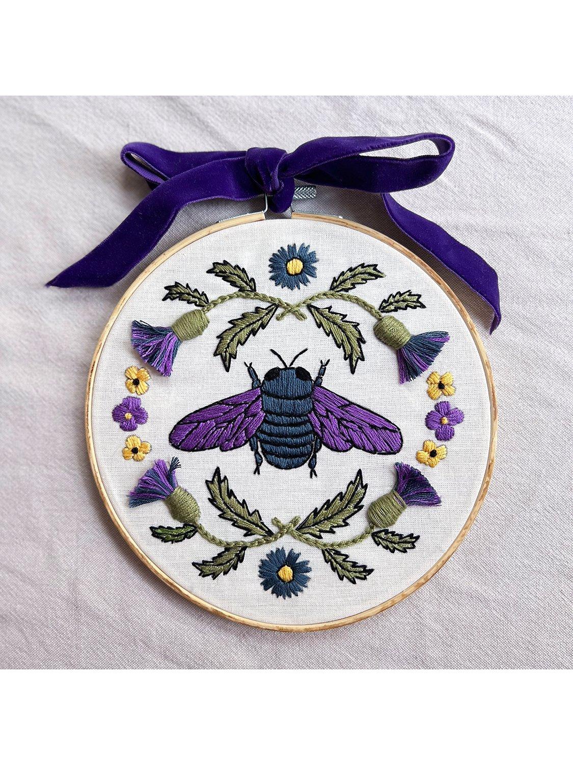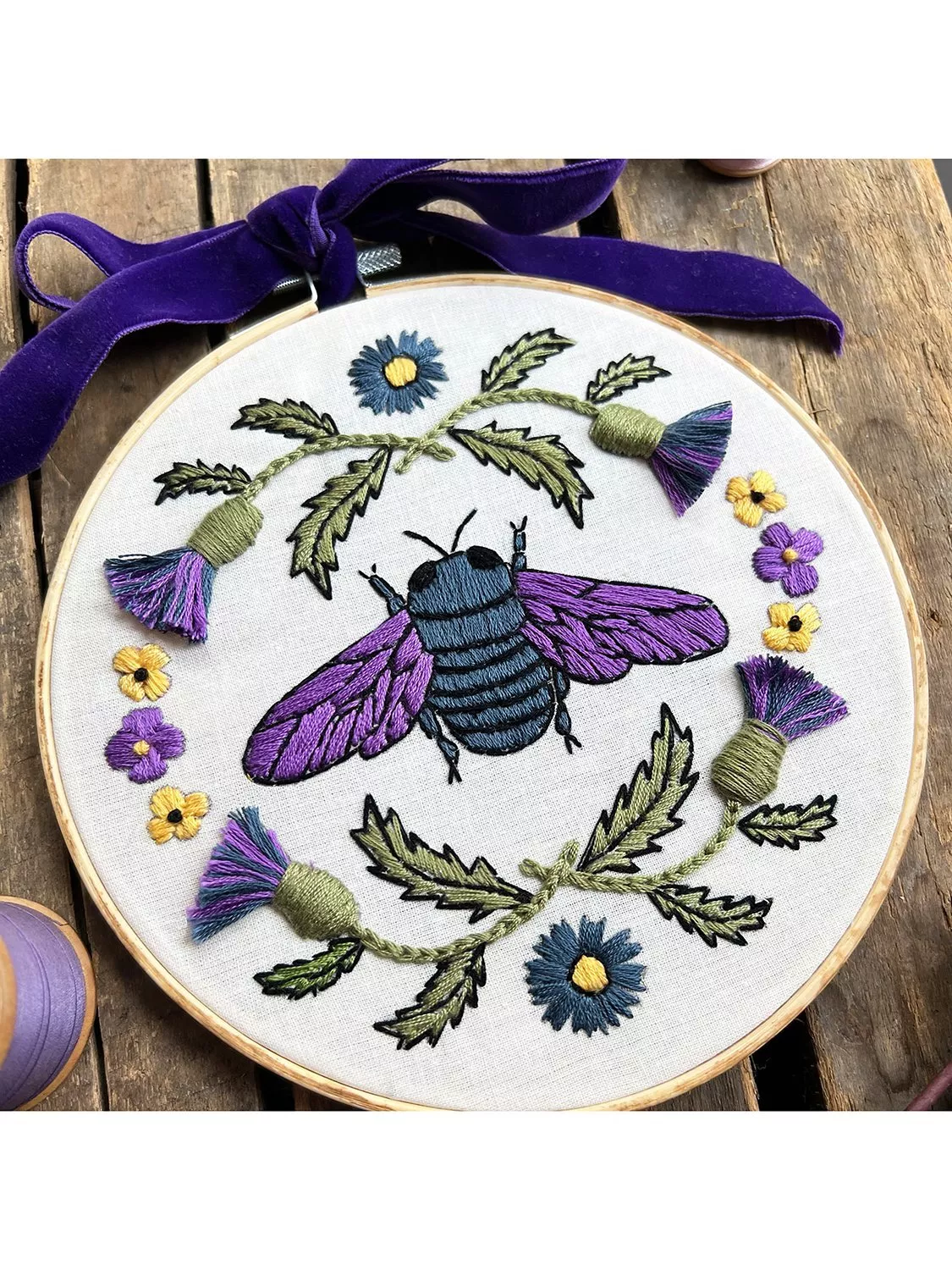 This beautiful embroidery features Violet Bee at the centre, surrounded by this species' favourite flowers including purple thistles. This design plays with some wonderful embroidery techniques from the tassel stitch to raised chain stitches. Finished with a piece of luxury violet velvet ribbon to hang.