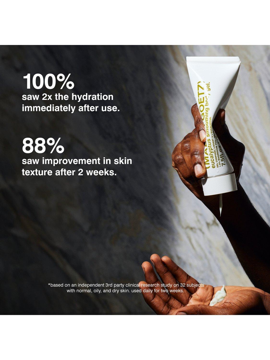 What it is: Our face-quality eucalyptus smoothing body gel is a multi-use serum formulated with a transformative water-droplet texture to bring skin texture, smoothness and barrier function to the next level. Revitalising eucalyptus cools and restores, so your body looks and feels as good as your face.