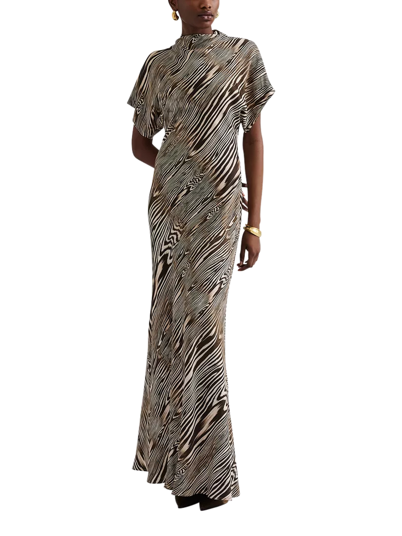 Malina’s maxi A-line dress, featuring a striking animal pattern, high neckline, and playful drop sleeves. A concealed zip offers effortless elegance for day or evening, letting you make each moment memorable.
