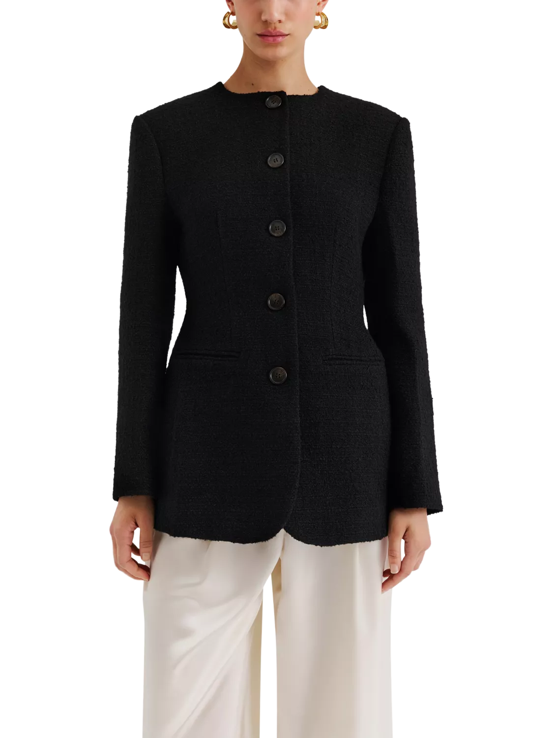 A smart outerwear piece that will pull any look together, this blazer from Malina sits at the hip for versatile coverage.