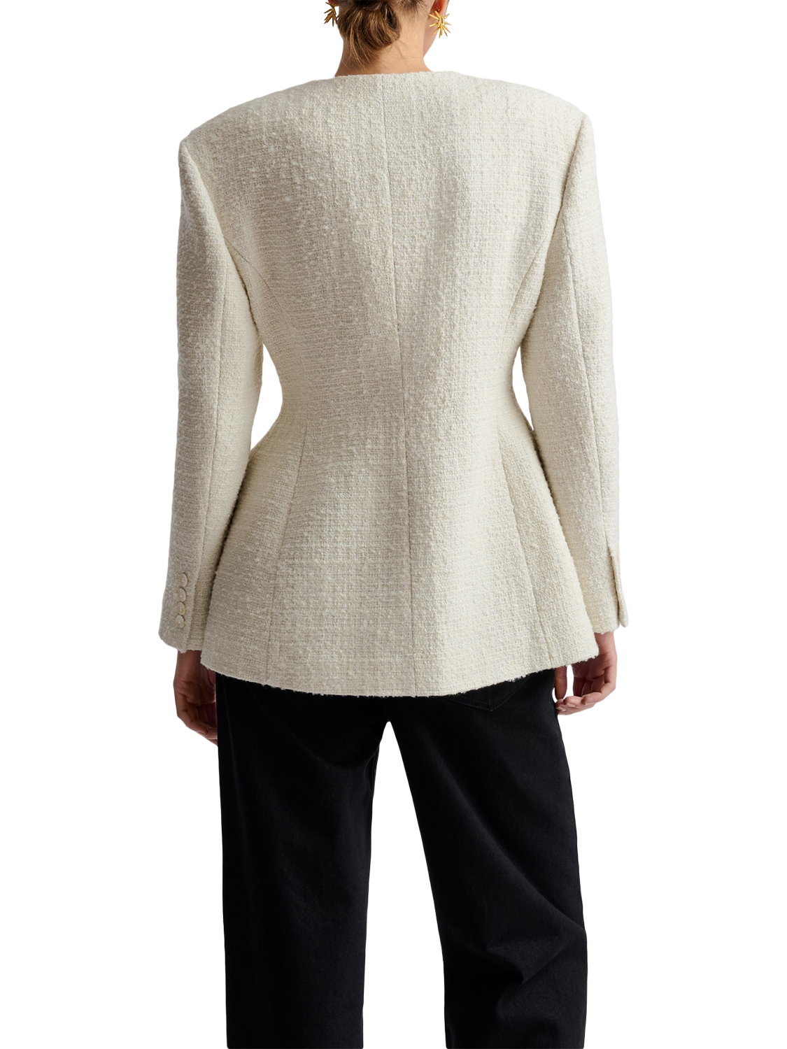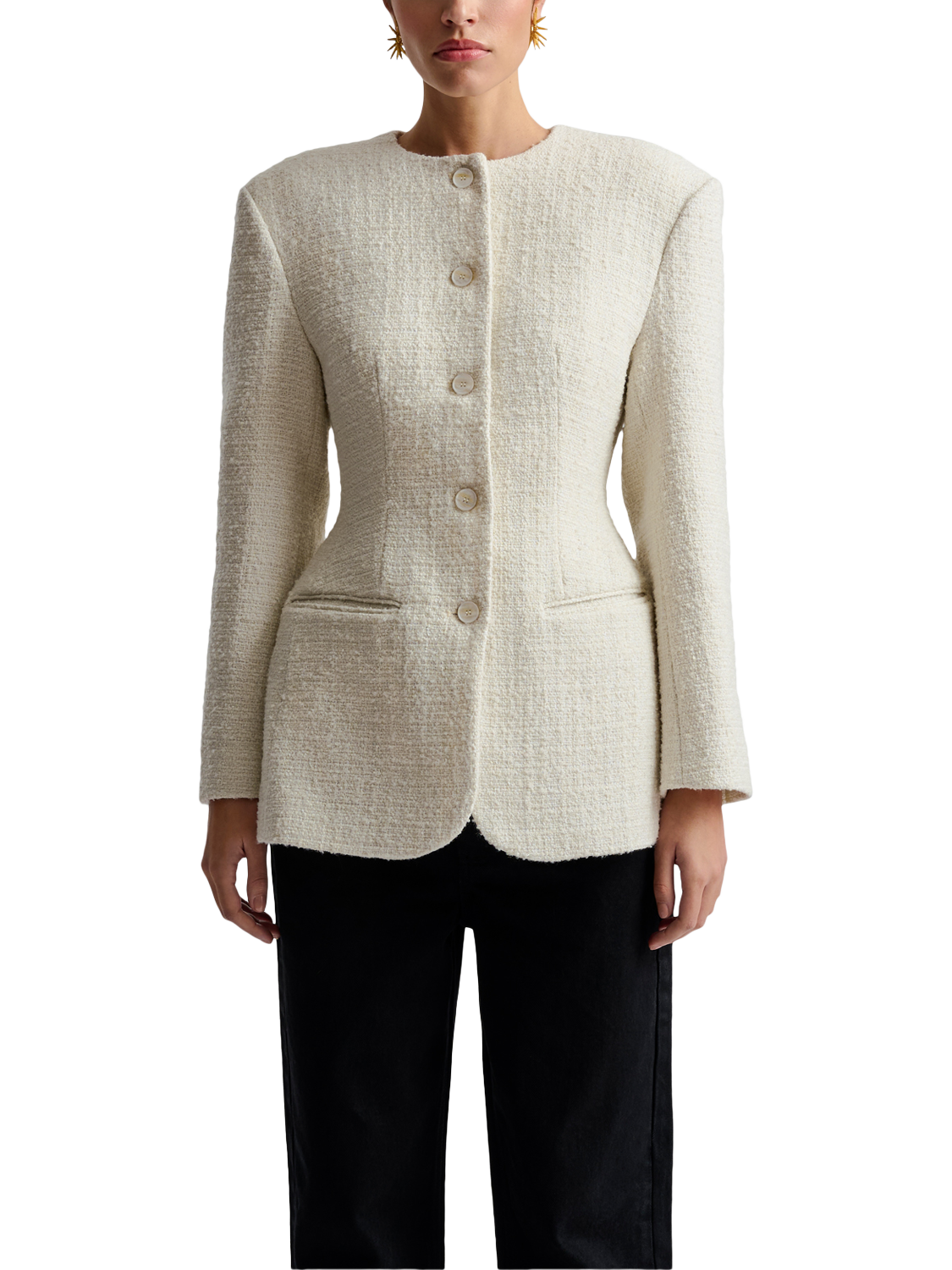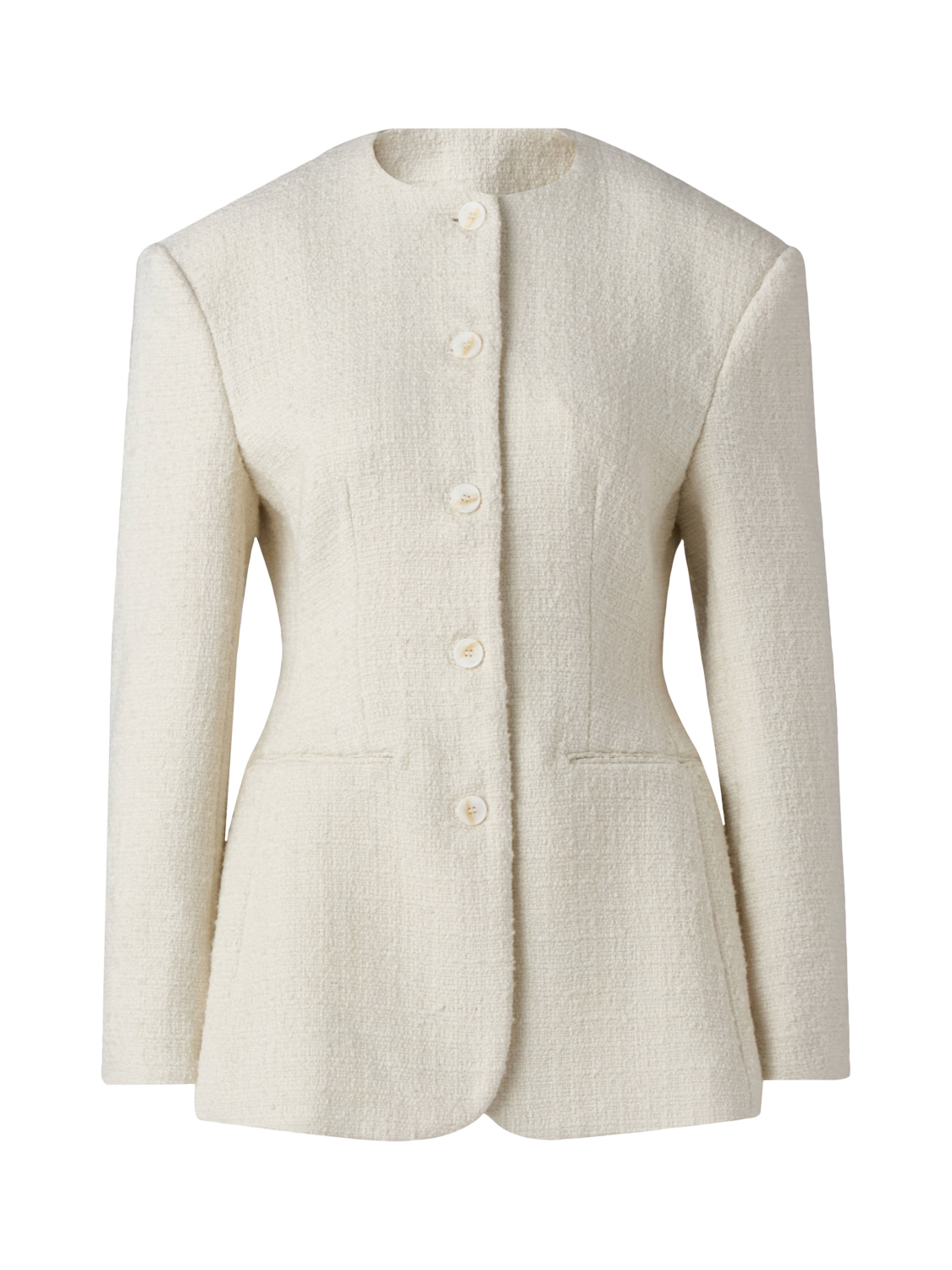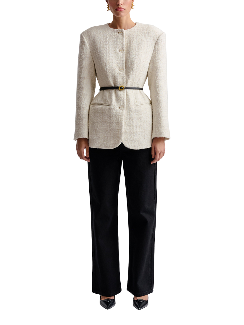 A smart outerwear piece that will pull any look together, this blazer from Malina sits at the hip and makes for a warming choice thanks to its wool blend fabric.