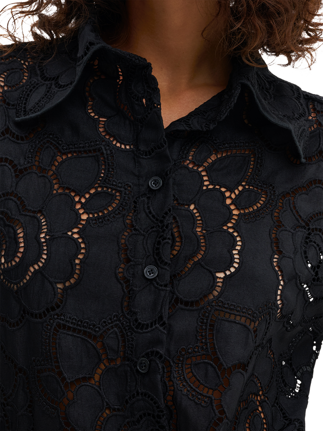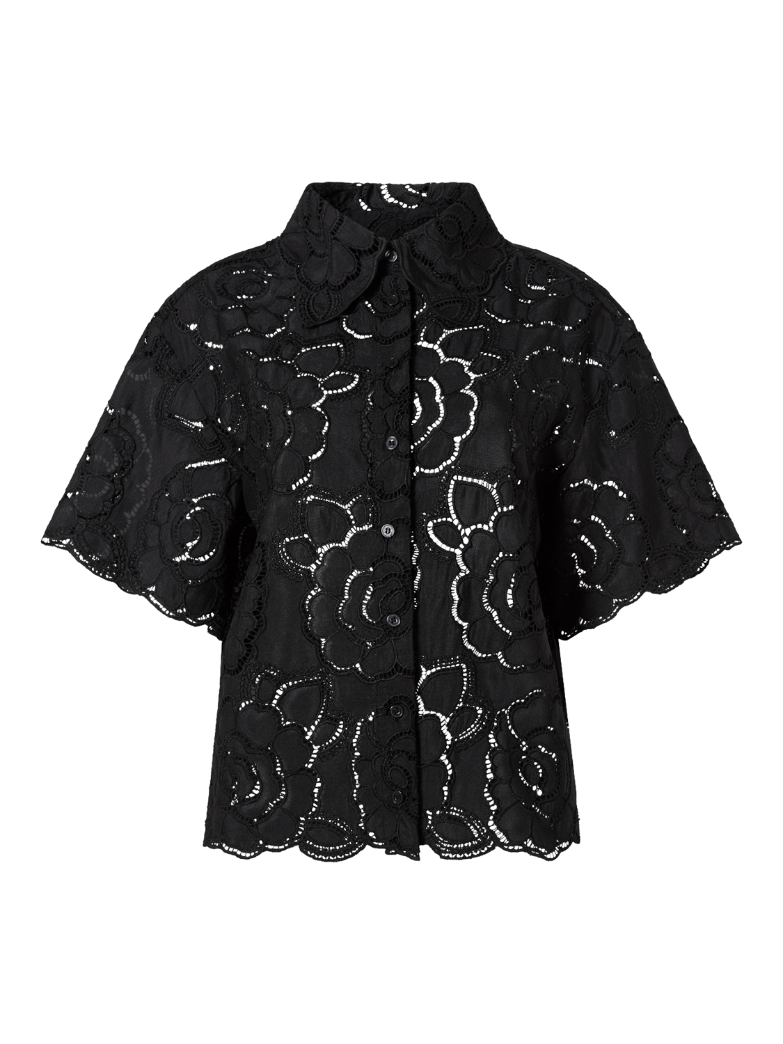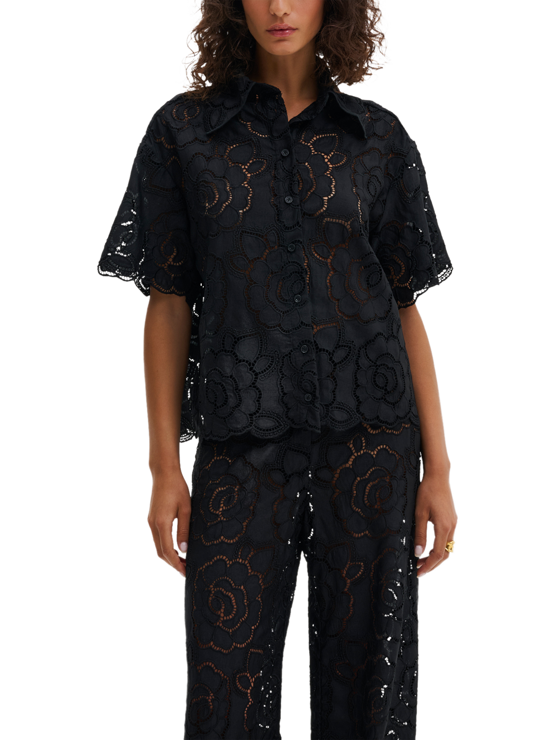 Intricate lacework paired with a relaxed tailored silhouette, offering airy drape and a striking presence for evening occasions or sunlit gatherings.