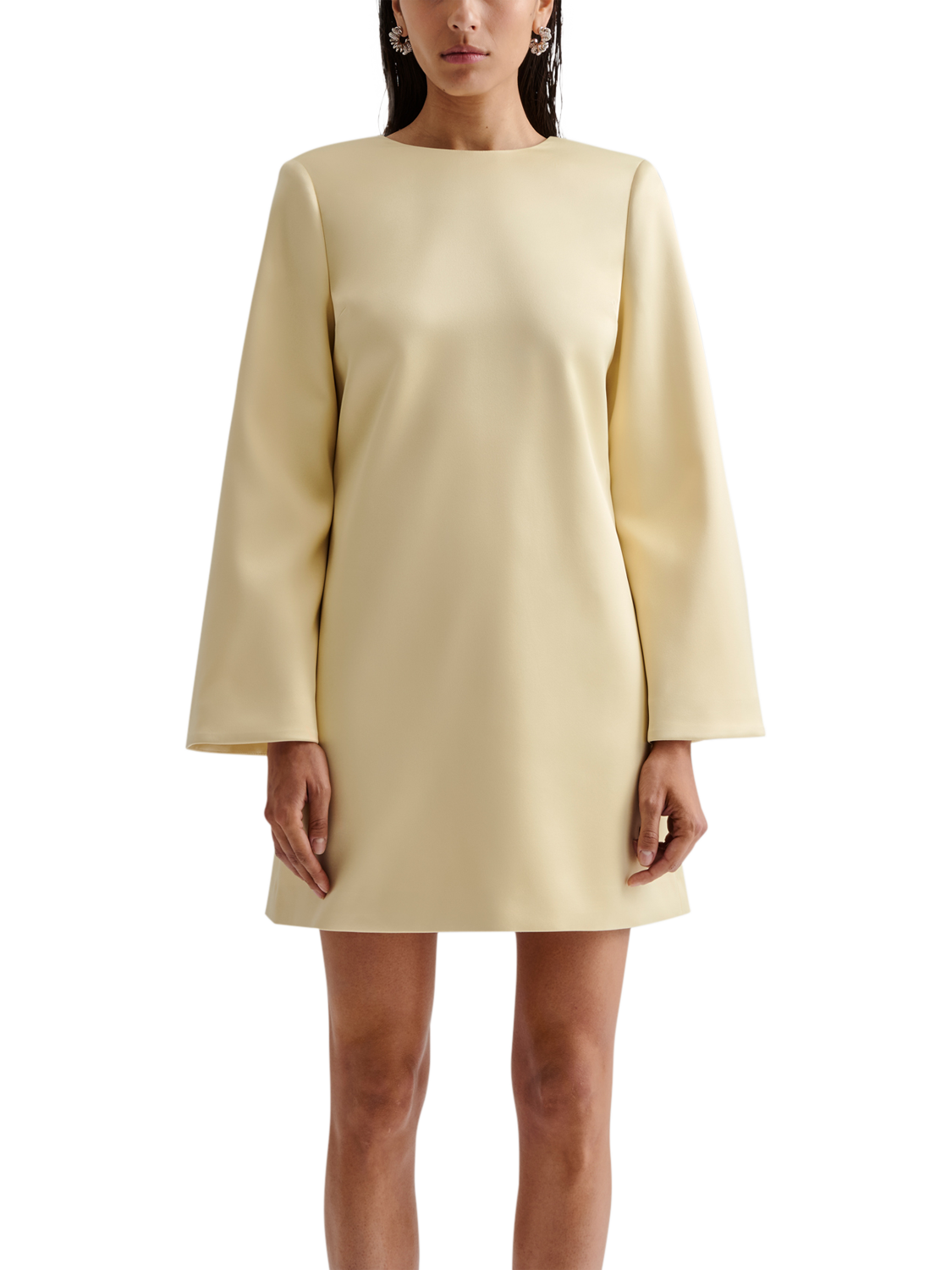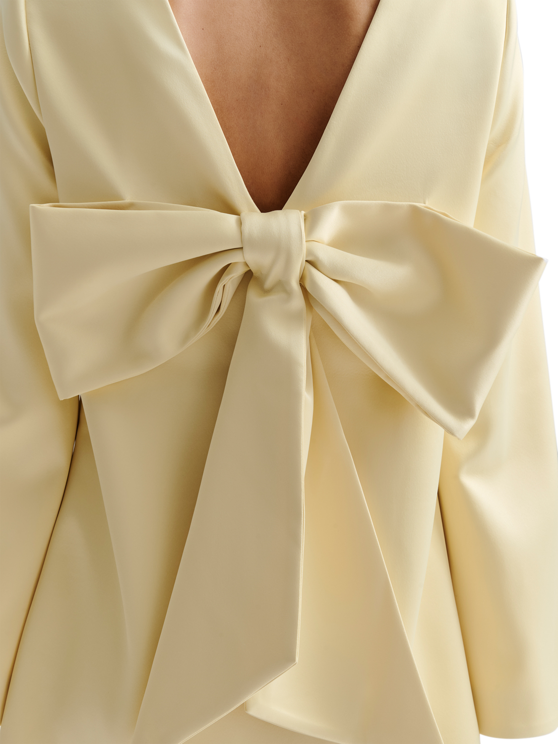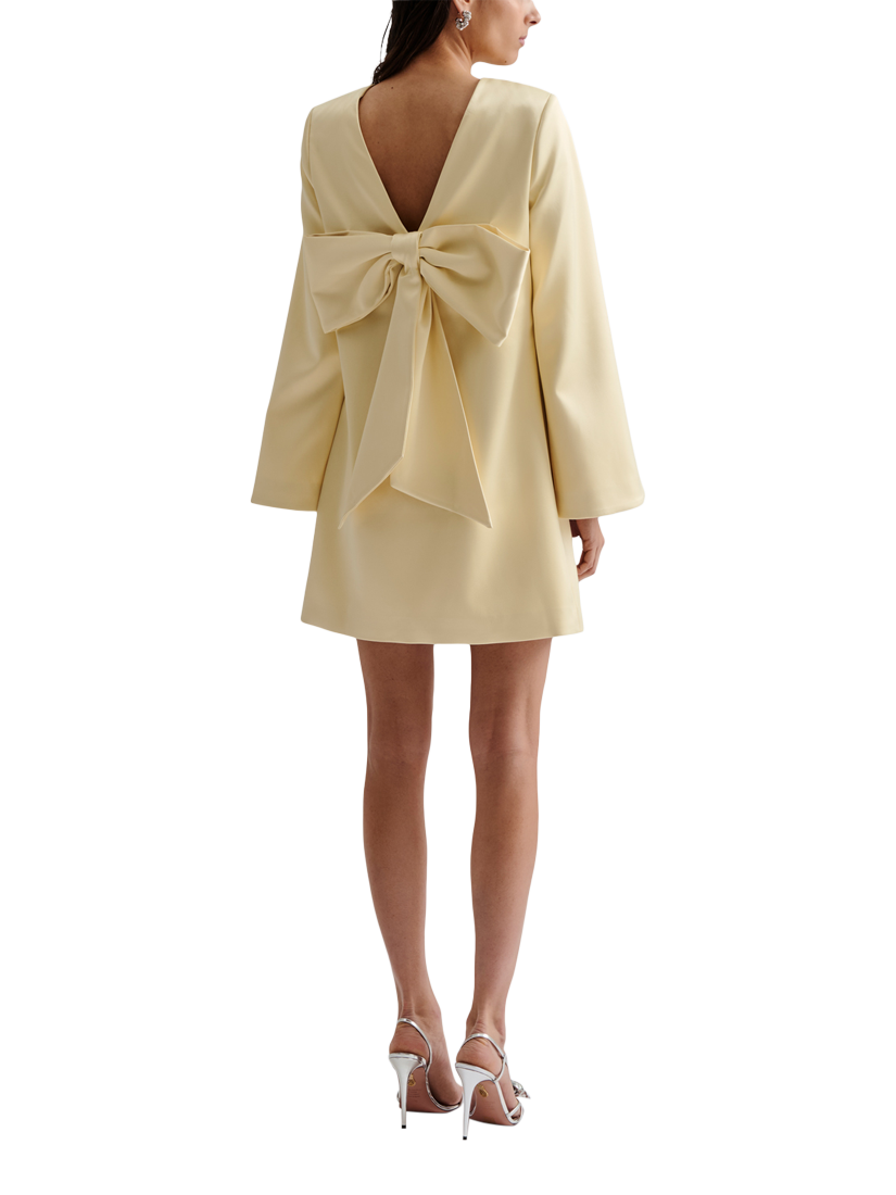 Carved to a simple sheath silhouette, this mini dress from Malina is made from soft satin in the season's go-to lemon yellow. Defined with a conventional round neckline and long wide sleeves, it features an open v-neck back with an oversized bow detail.