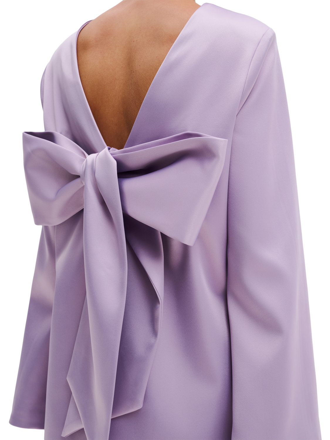 This long sleeved mini dress by Malina has a simple round neckline and is finished with an oversized bow detail and open back.