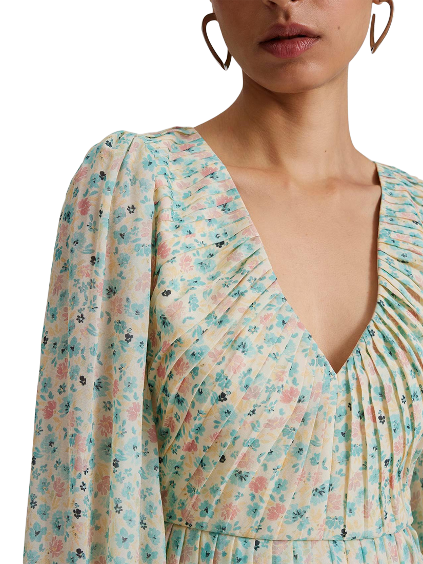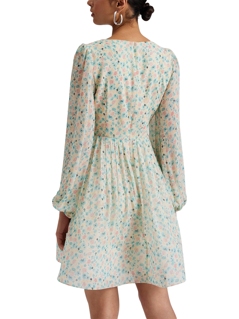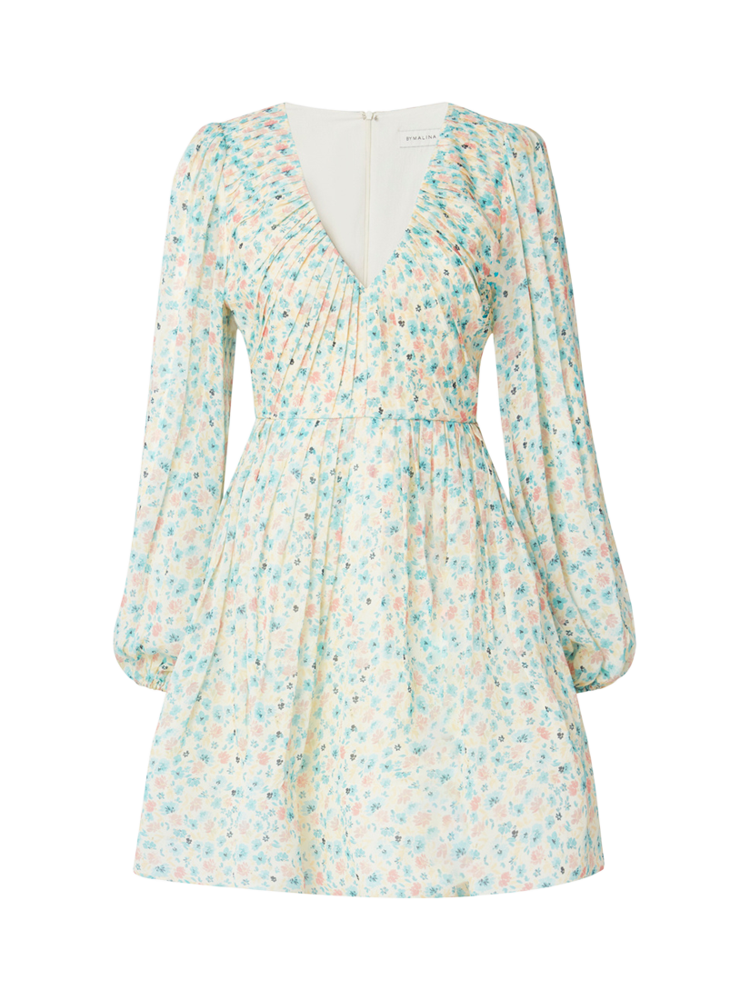 V-neck chiffon mini dress with a whimsical floral pattern, pleated details, and a fitted waist. Designed for chic and elegant occasions.