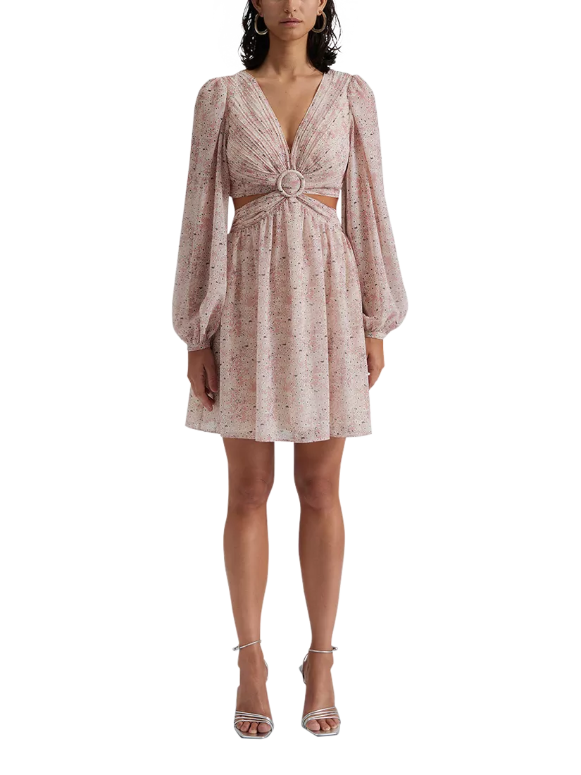 Chiffon flower mini dress with cut-out waist details, open back, ring detail and long sleeve.