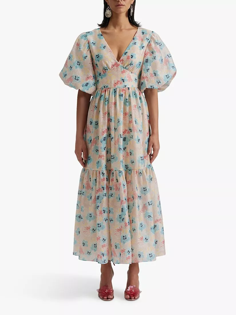 Tiered for a dramatic touch, this maxi dress from Malina is rendered in a cotton blend. Carved with a plunging neckline and puff sleeves, this stye is proof that florals are groundbreaking all year round.