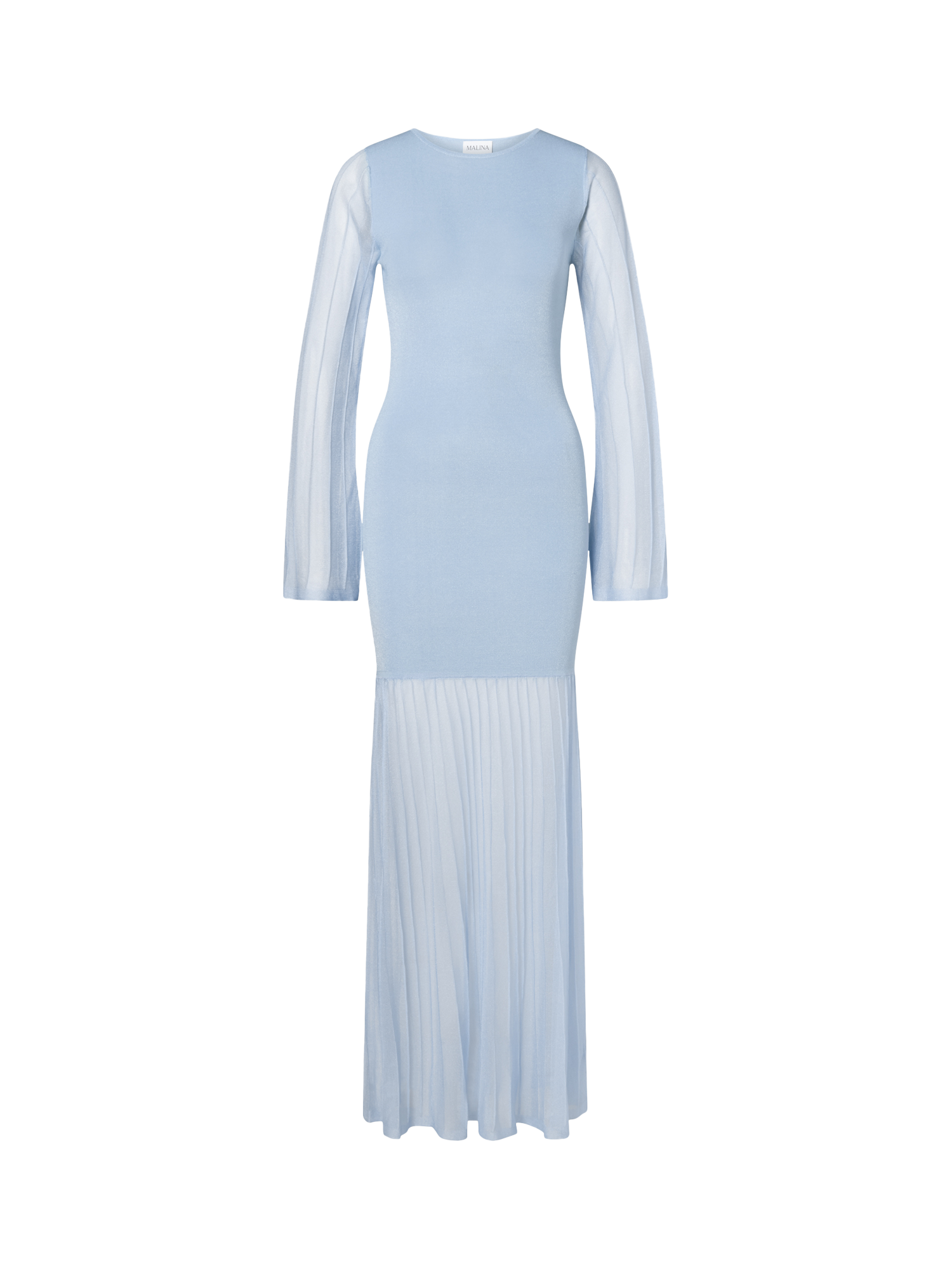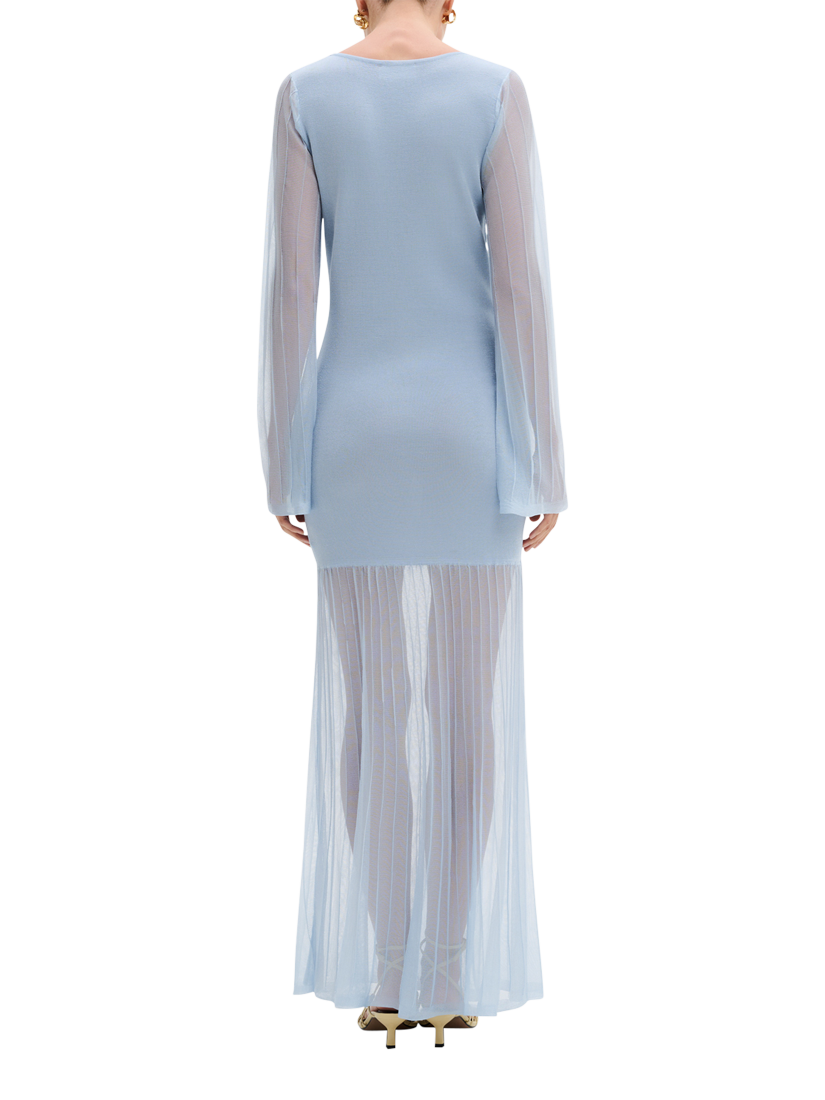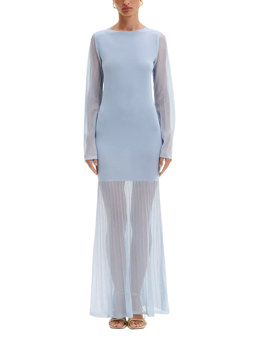 An A line maxi dress by Malina. With a flattering shape and comfortable knitted bodice, it feature a striped sheer long sleeves and skirt. Keeping you feeling confident all evening, it adds charm and impact to any occasion.