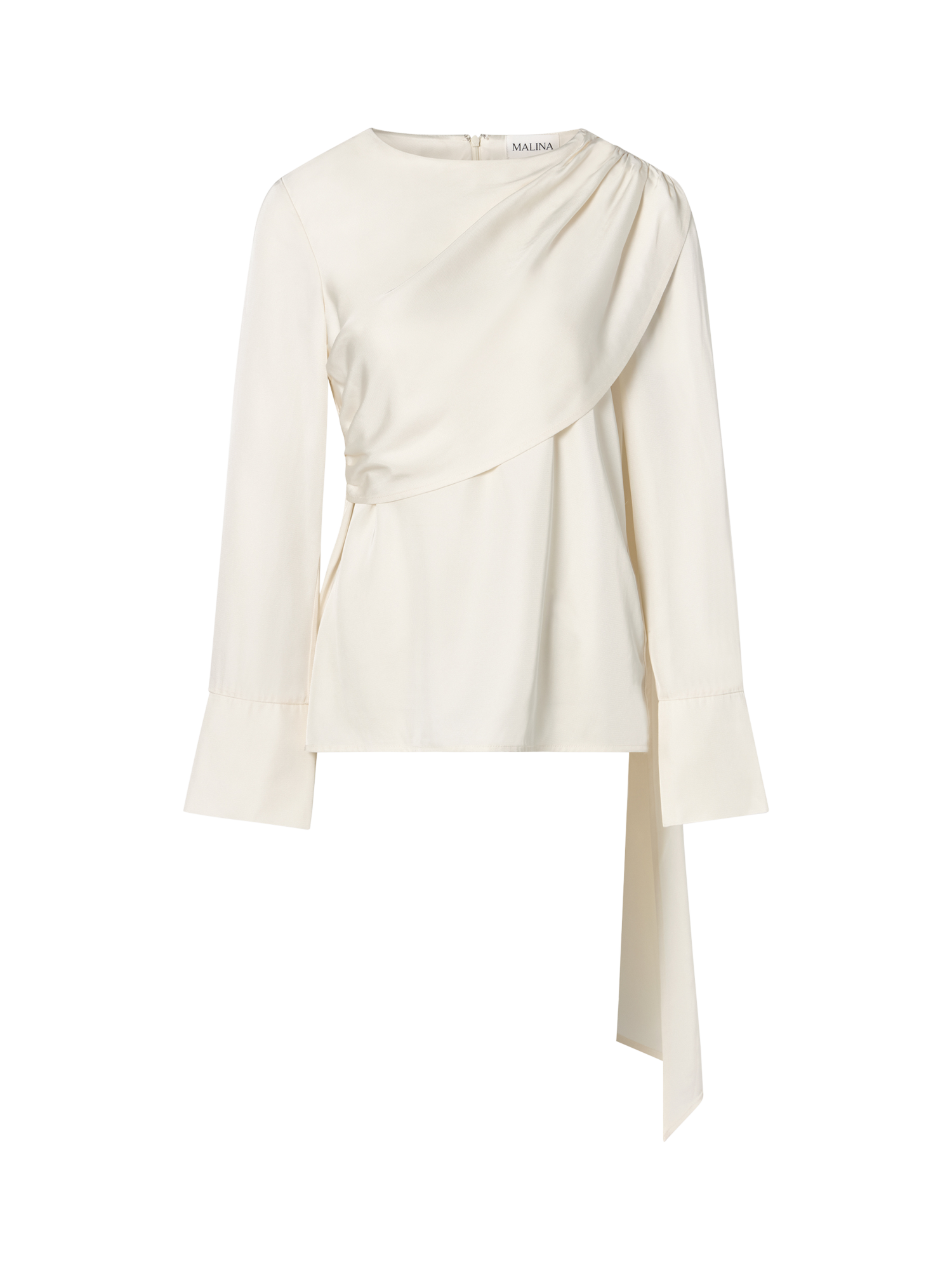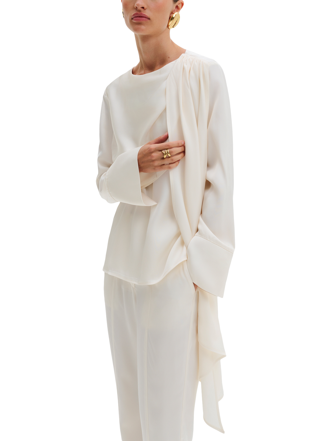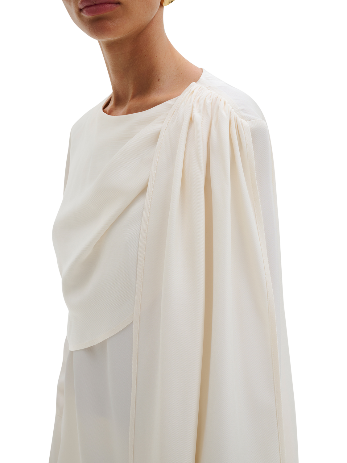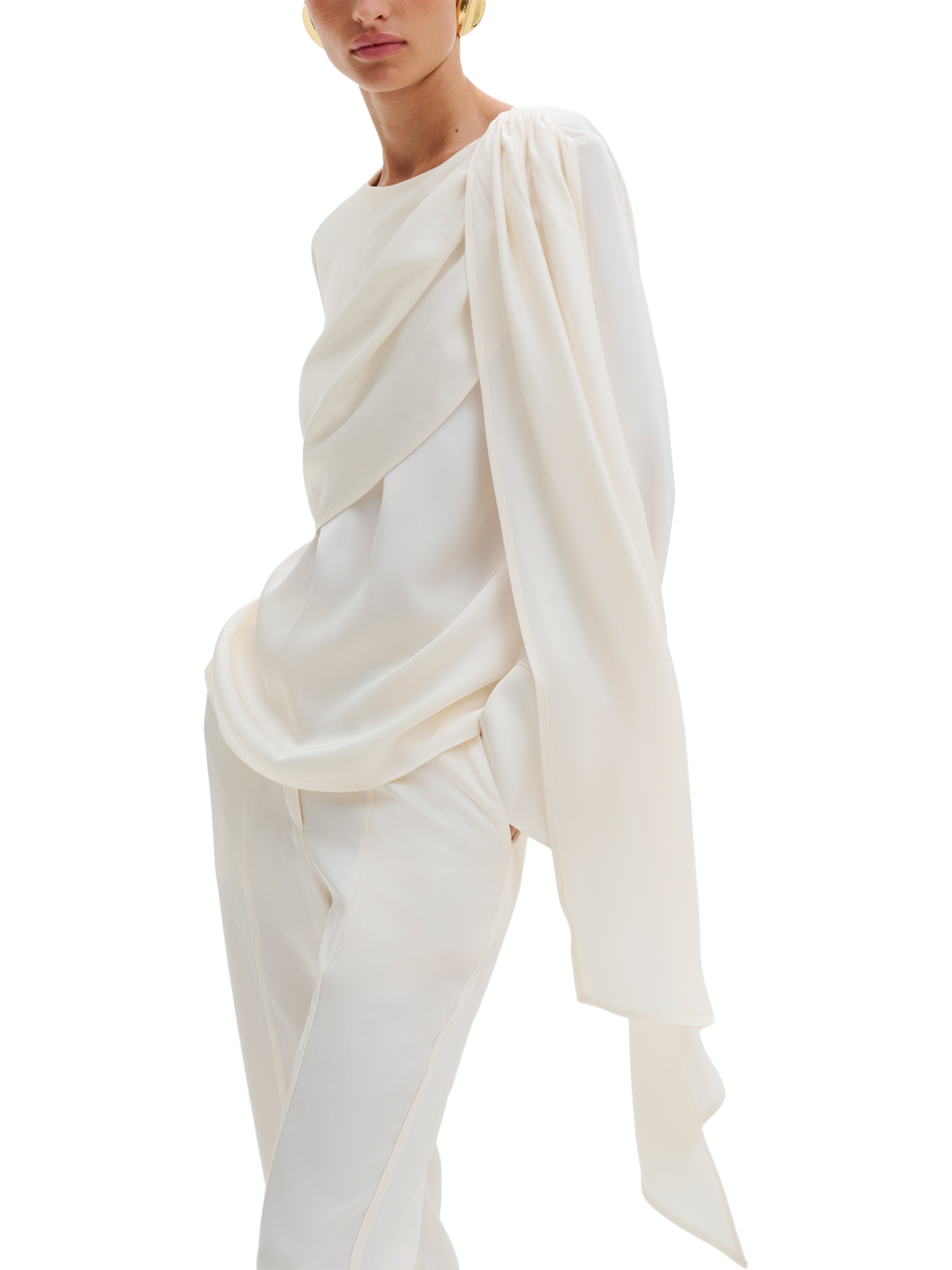 A sculptural blouse that cascades into a fluid cape. Soft drape, billowing sleeve and graceful silhouette for memorable evening wear.