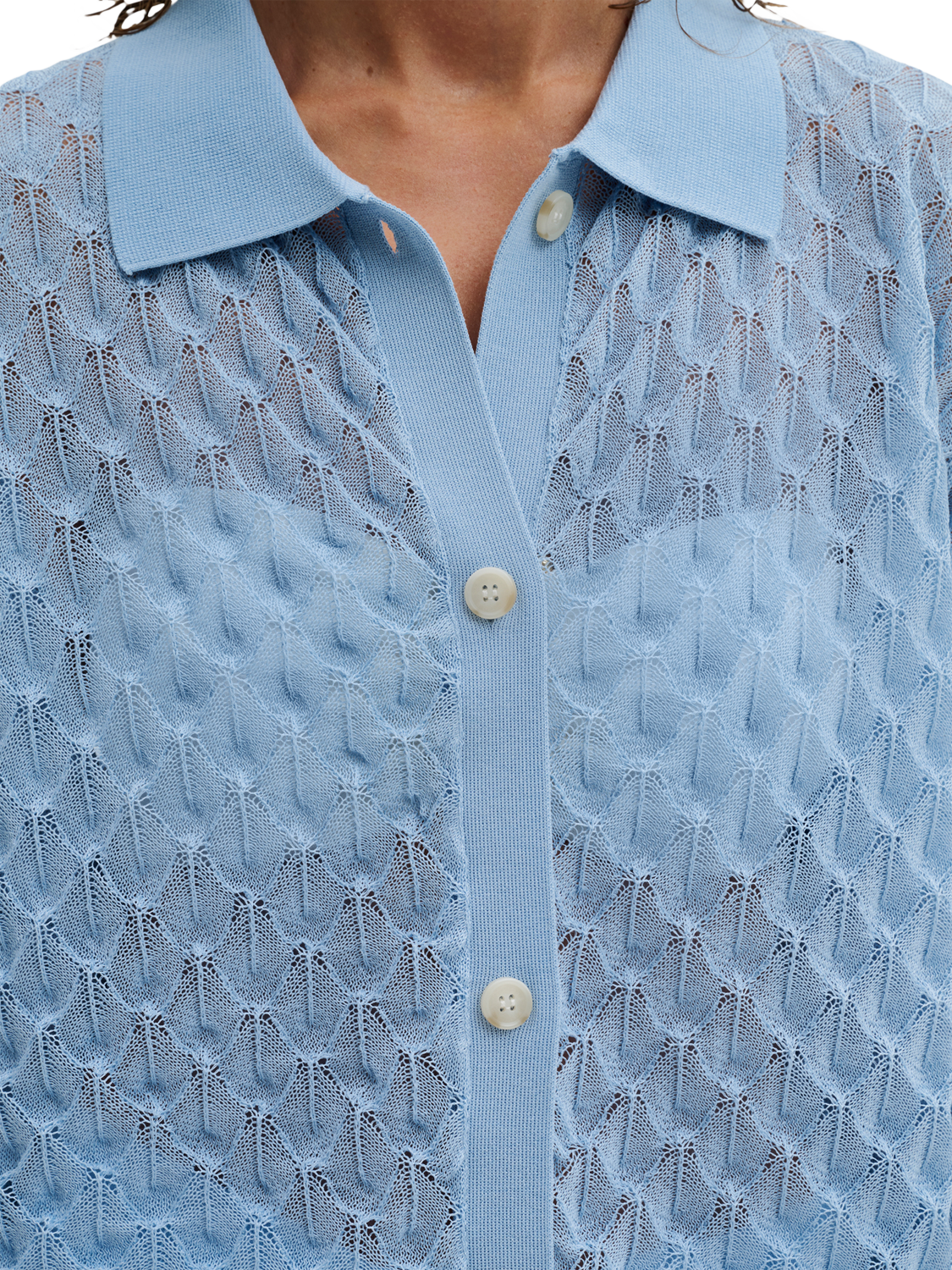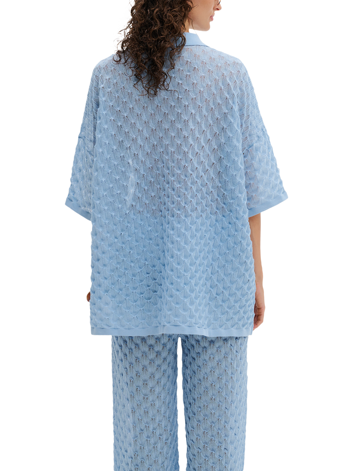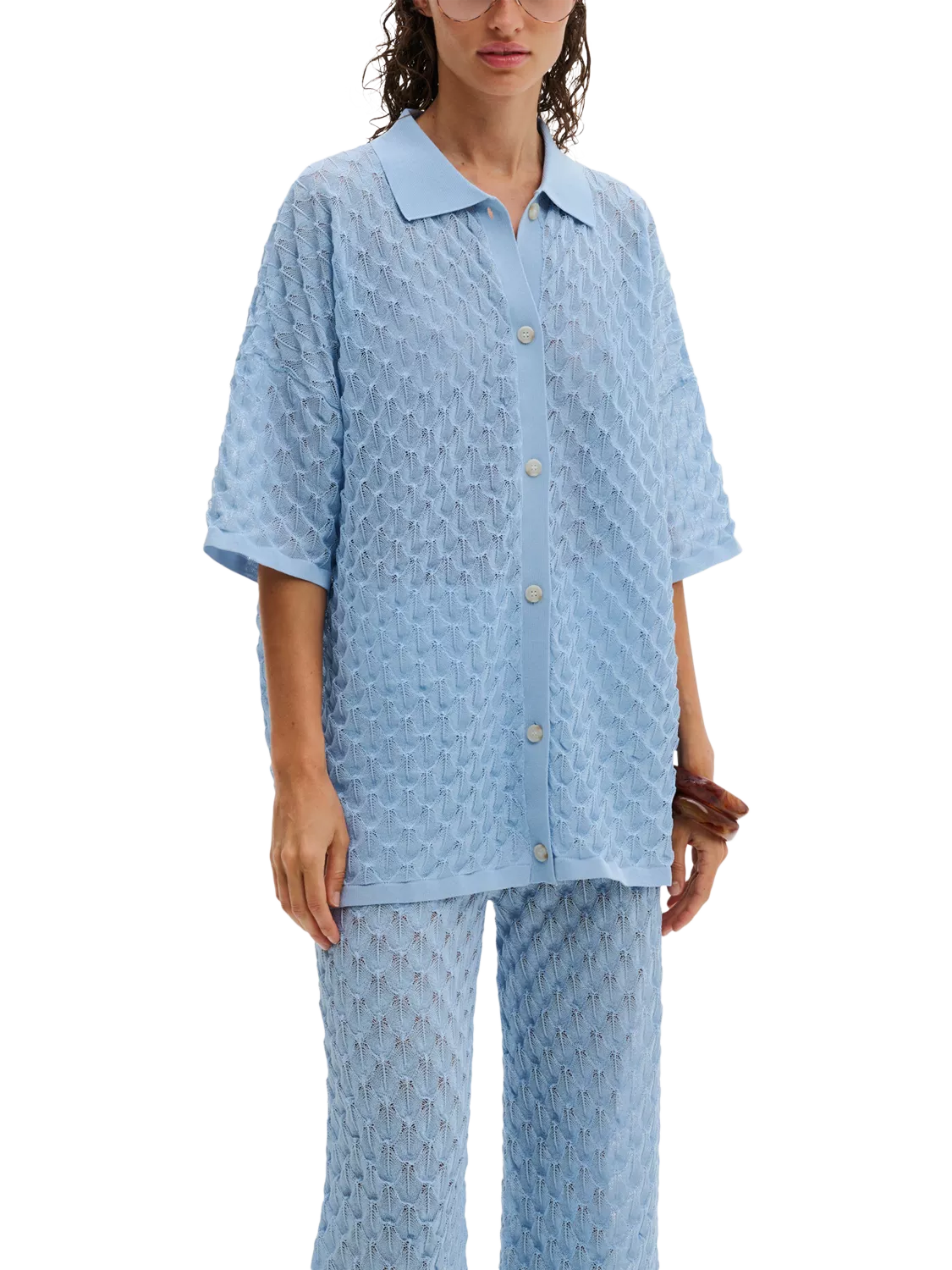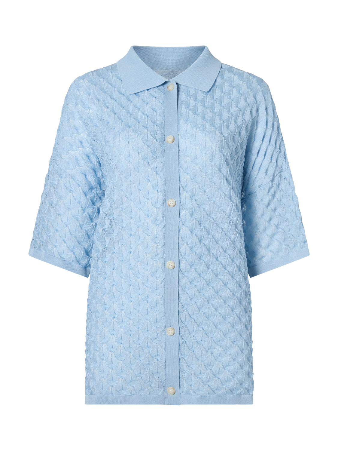 The Moa Knitted Shirt is a short-sleeved knitted blouse from Malina featuring a beautiful, detailed pattern. It is both comfortable and stylish, with buttons at the front for a sophisticated touch.