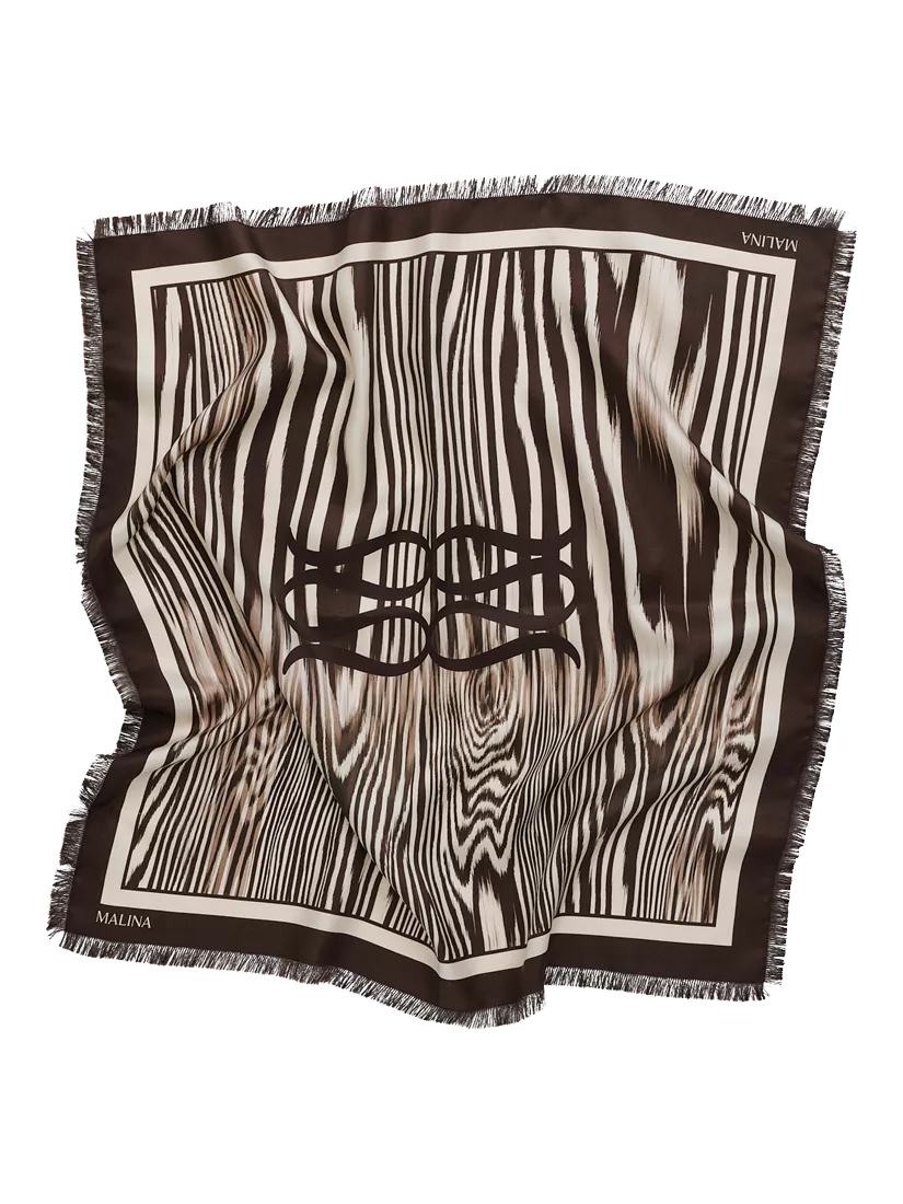 Elegant fringe scarf perfect for elevating any attire with its lightweight silk twill composition and artistic design.