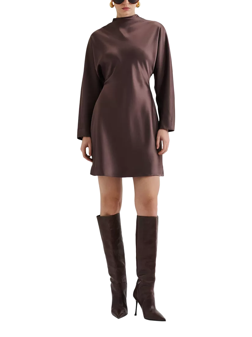 Draped with swathes of fabric, this thigh-grazing dress from Malina is structured with a high neck and full-length sleeves.