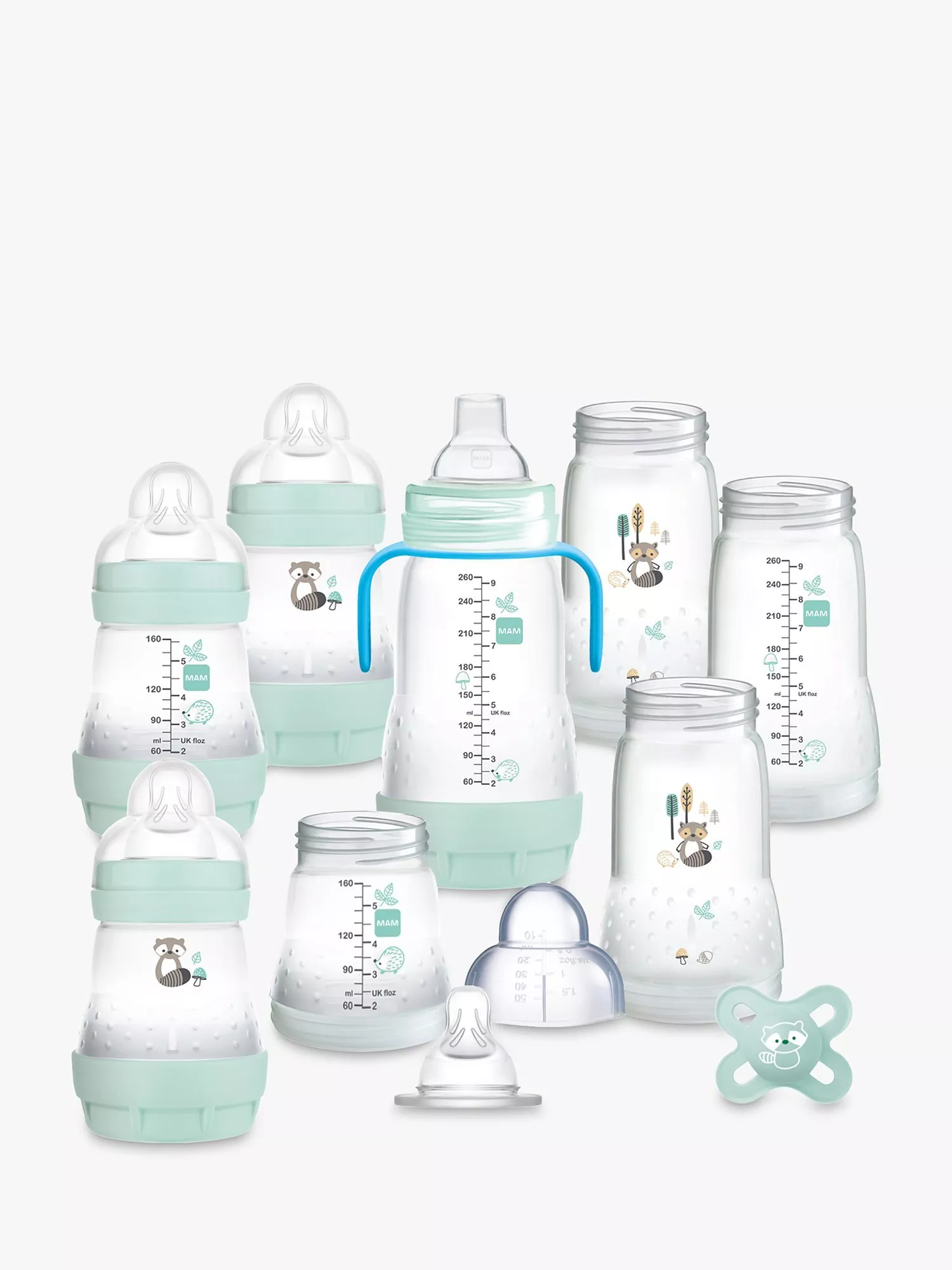 - Includes 8 bottles, teats, soft spout, handle and a soother
