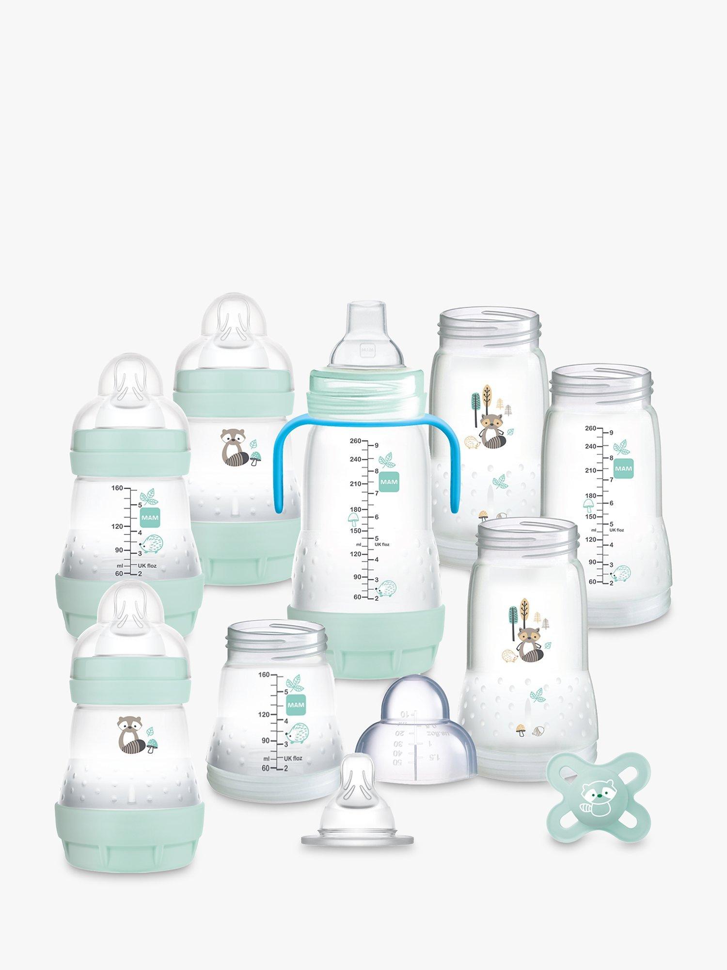 The MAM self-sterilising Easy Start anti-colic bottle starter set offers a total solution for feeding babies from birth until their first birthday, containing everything you'll need to give your baby an optimal feeding experience at home and on the go. The set includes the components for four complete bottles at any one time, in two different sizes (4 x 160ml and 4 x 260ml), complete with handles and a spout to move your baby onto a cup when they are ready. There is also a MAM Start 0-2M Soother included.