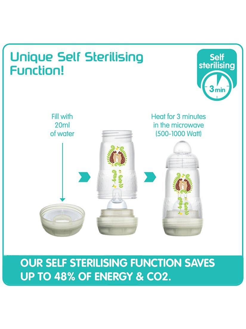 - Self-sterilising bottles--three minutes in the microwave for sterilisation