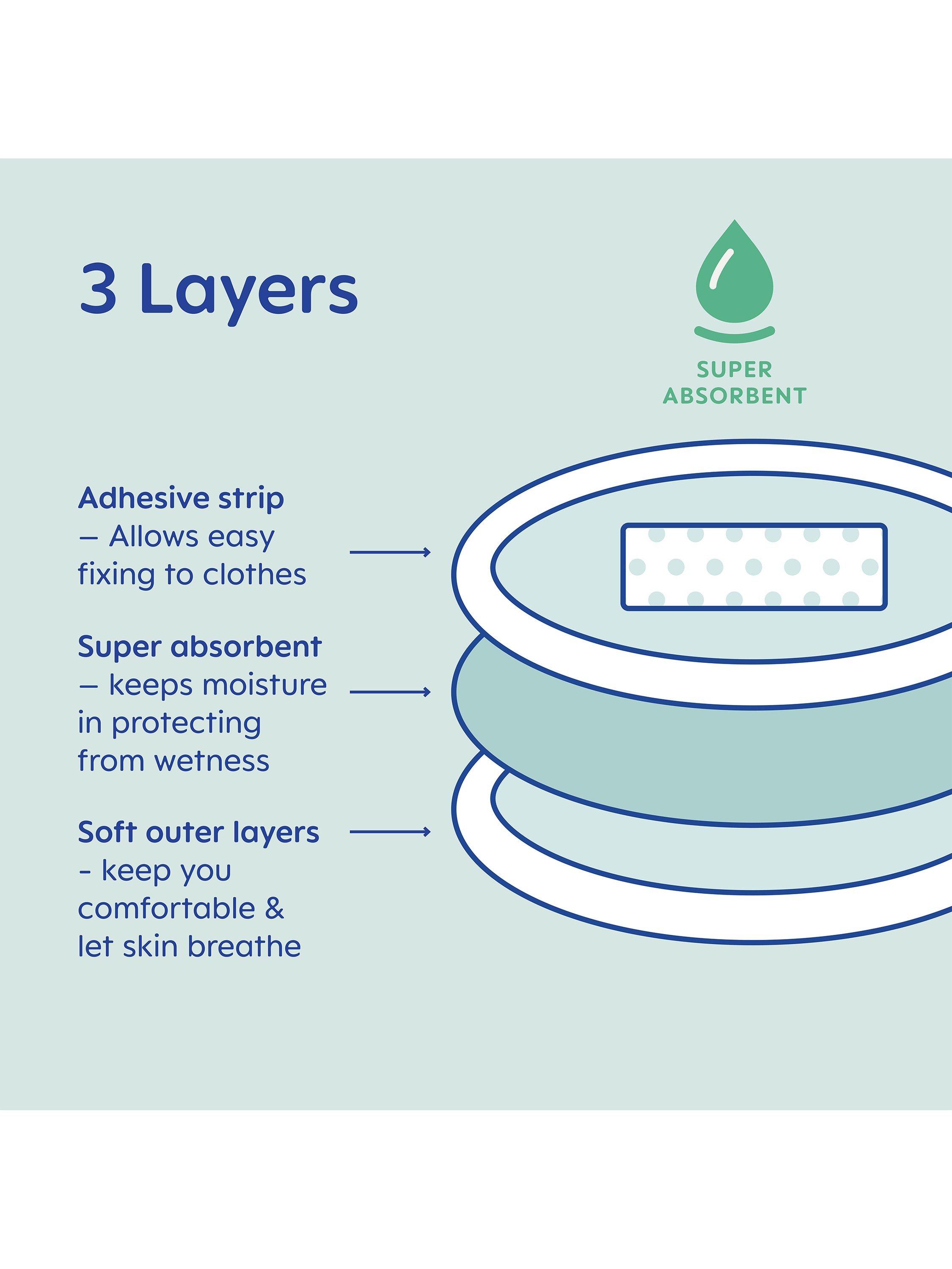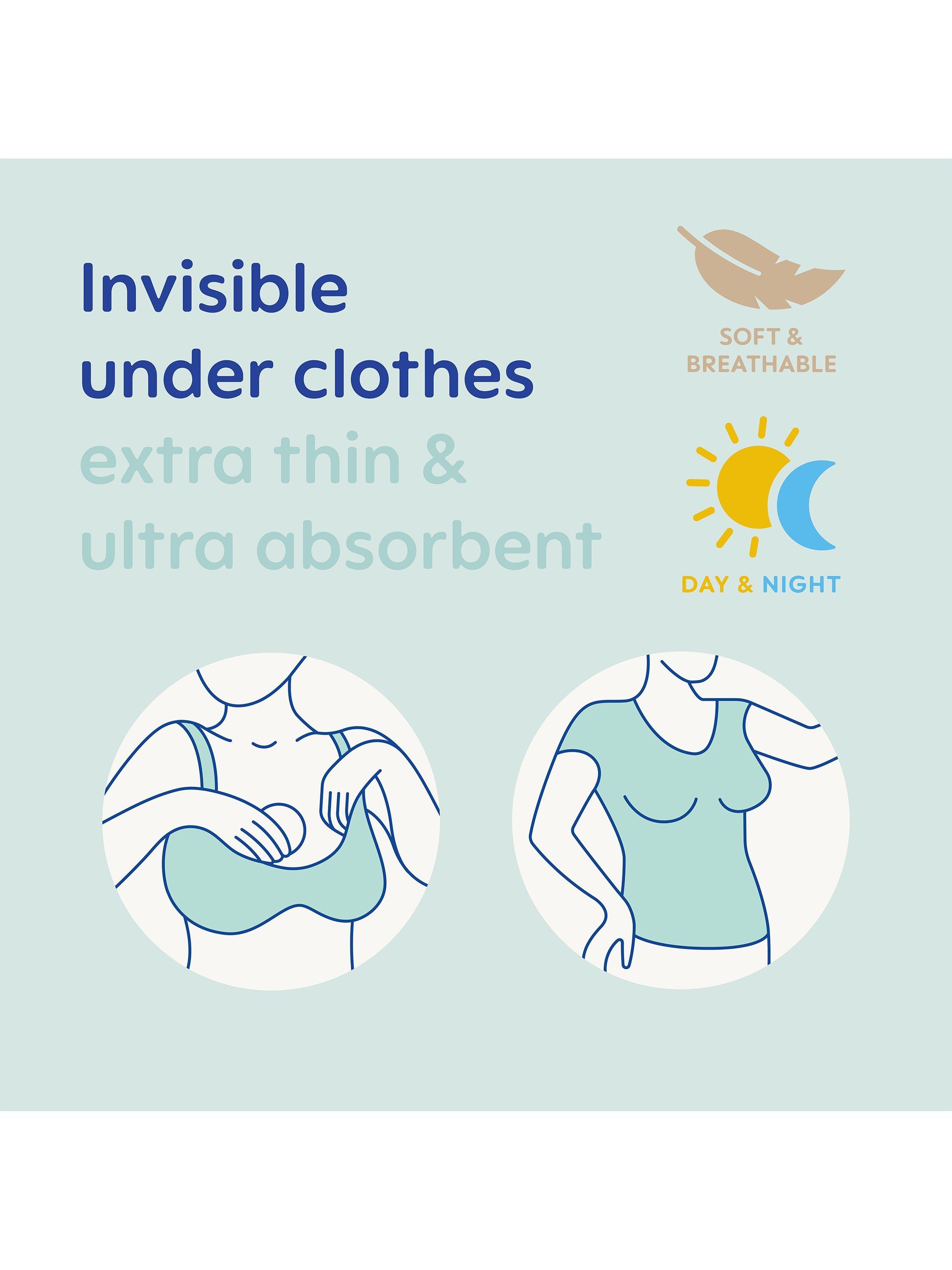 Super absorbent, disposable breast pads. Ultra thin and invisible through clothing, with clever fixing strips to keep them in place.