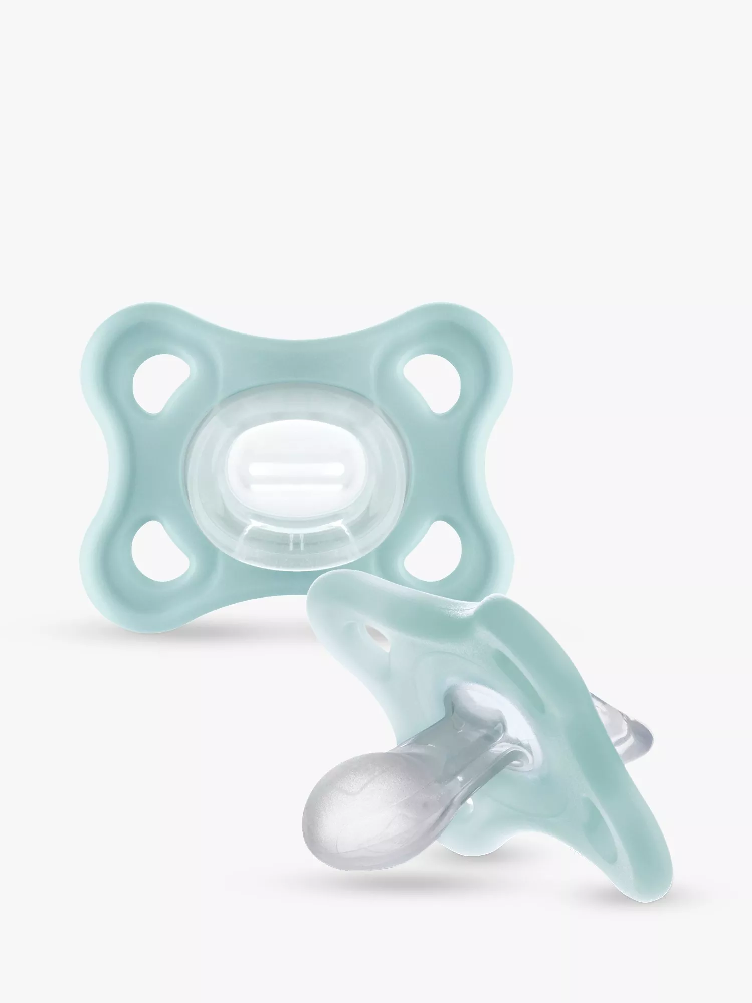 Each one is made of a single piece of 100% high-quality silicone, making the soother particularly hygienic and easy to clean. The soft material is gentle on baby's skin and the lightweight design helps baby to easily retain the soother and the handle is easy to grip. It's 32% lighter than the average full-silicone soother competitor.