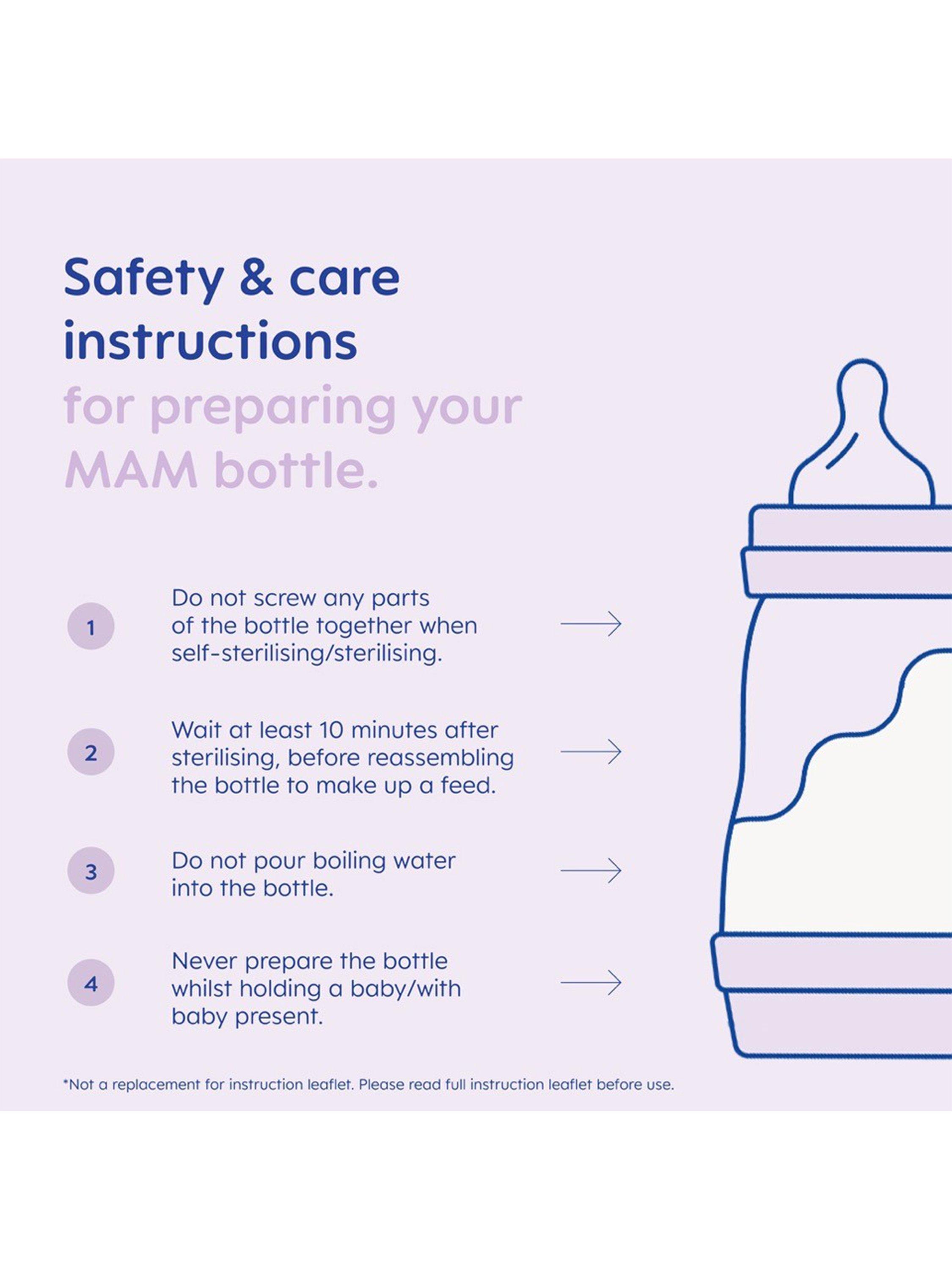 Simple and safe to use and to make everyday baby life easier, MAM’s Easy Start Bottle's Set includes the SkinSoftTM teat which is silky soft and provides a familiar feel for babies. Market research confirms that 94%* of babies accept the teat making it perfect for when mum wants to be a bit more flexible. One of the biggest features parents love about the Easy Start Anti Colic Bottles are their ability to self-sterilise. With no need for a separate bottle steriliser, MAM bottles can be self-sterilised in 3 easy steps, ensuring simple and safe bottle cleaning without hassle. MAM's anti-colic bottles also provide a smooth drinking flow by preventing the formation of air bubbles, reducing colic symptoms in 80%** of babies who use them.