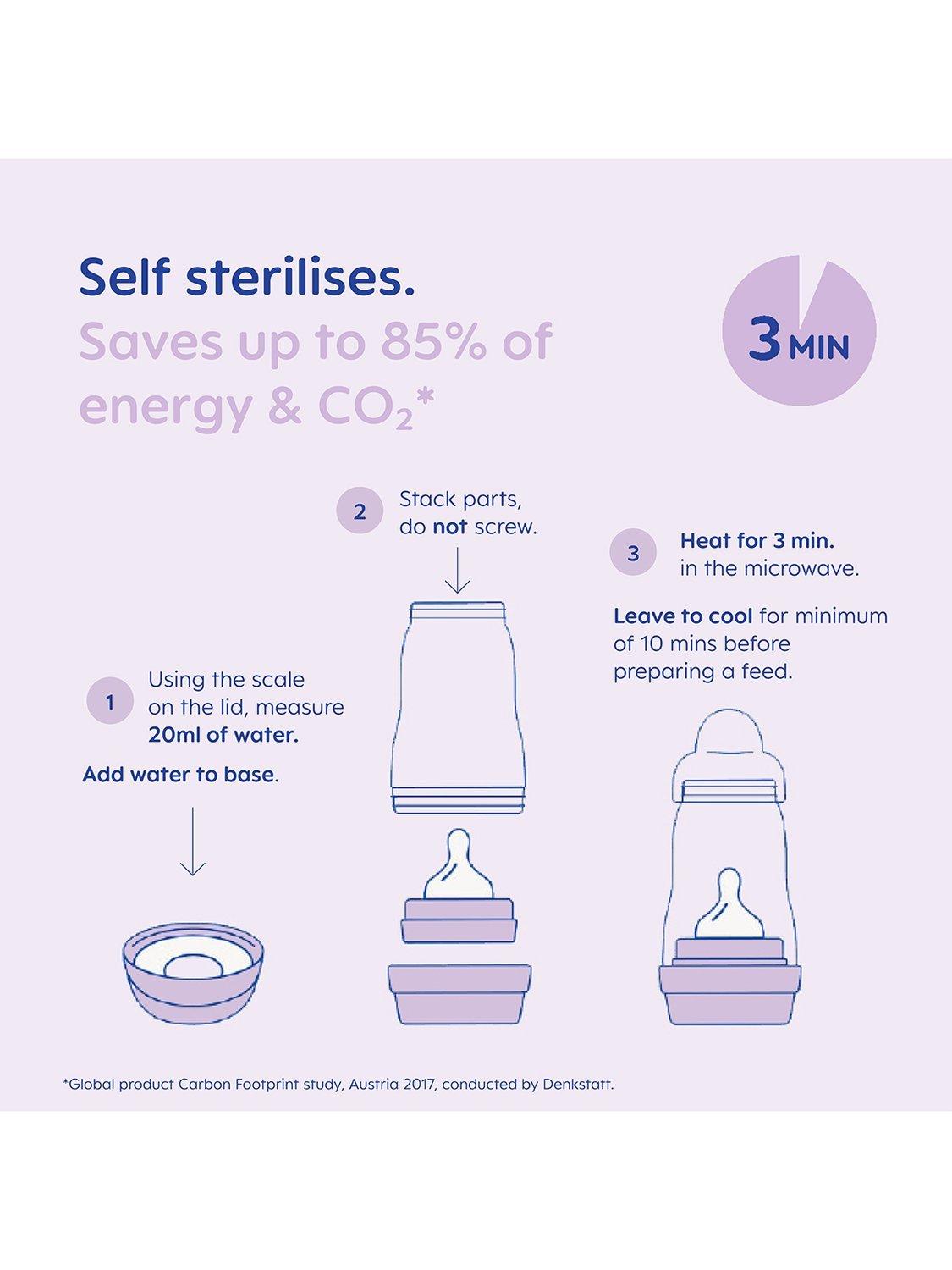 The set features self-sterilising bottles - just 3 minutes in the microwave, with no need for a steriliser. Proven 80% less colic due to the ventilation holes in the base, which ensures babies don't swallow any air, and 94% of babies accept the mam silk teat. BPA free.