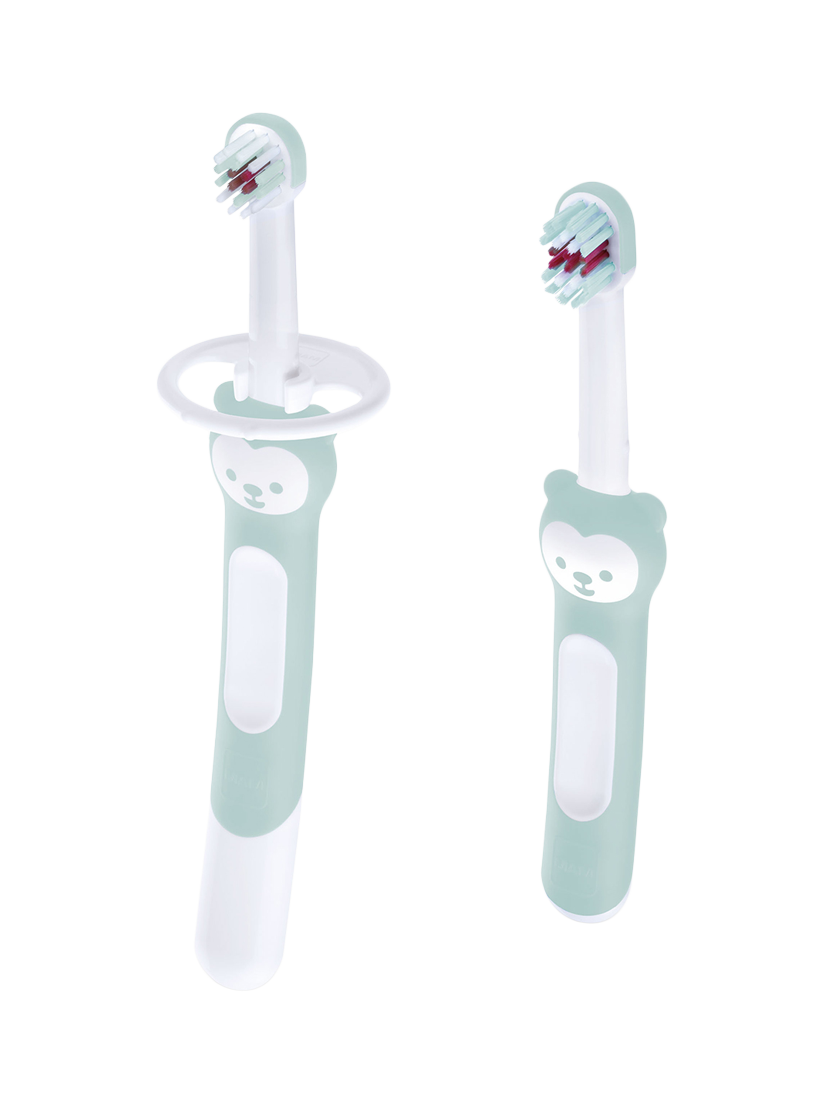 The MAM Learn to Brush features two brushes, one extra-long handled toothbrush for babies and parents to hold together and a shorter handled brush for infants who no longer need to be guided. Both brushes feature compact, ergonomic handles that are easy to hold for baby. The larger long handle means that parents can carefully brush together with their children, ensuring that all teeth are properly cleaned and helping baby to learn the correct brushing technique. The longer brush also features a removable safety shield to keep the brush away from the back of your little one's mouth, removing the risk of choking. When children are old enough to try brushing their teeth independently, the smaller brush’s size makes it easy and comfortable for small hands to hold. The carefully shaped brush head ensures thorough cleaning and has a toothpaste indicator to guide you on the right amount of toothpaste to use.